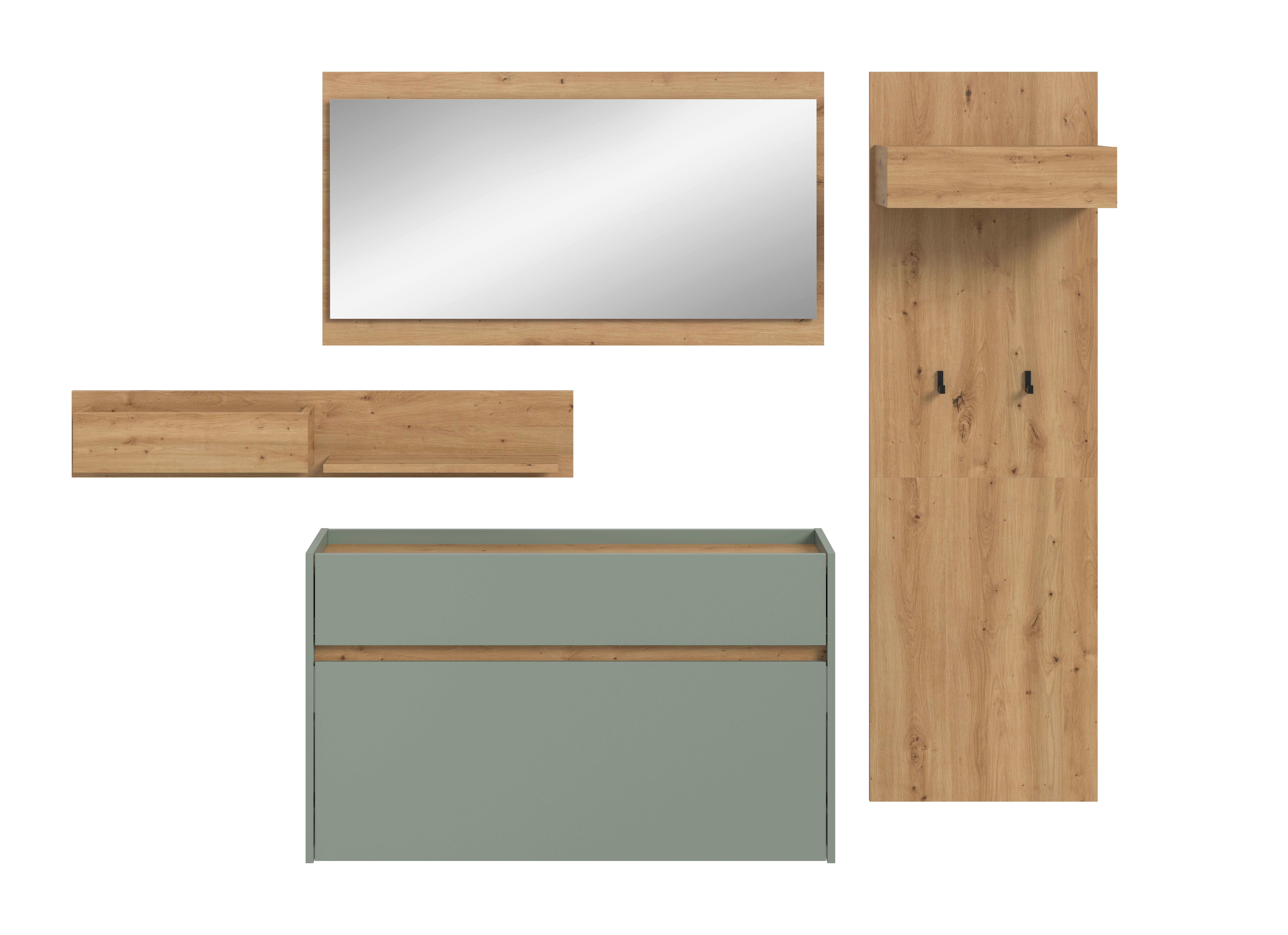 Die 4-teilige Garderobenkombination in Salbei und Artisan Oak Nachbildung besteht aus Schuhkommode, Hängeregal, Spiegel und Garderobenpaneel. Maße ca. 205x192x32 cm. FSC®-zertifizierter Holzwerkstoff garantiert Nachhaltigkeit. Pflegeleichte Oberflächen und schnelle Montage machen die Kombination besonders praktisch. Erweitere dein Zuhause flexibel mit weiteren Artikeln der Serie. Für eine stilvolle und funktionale Garderobe.