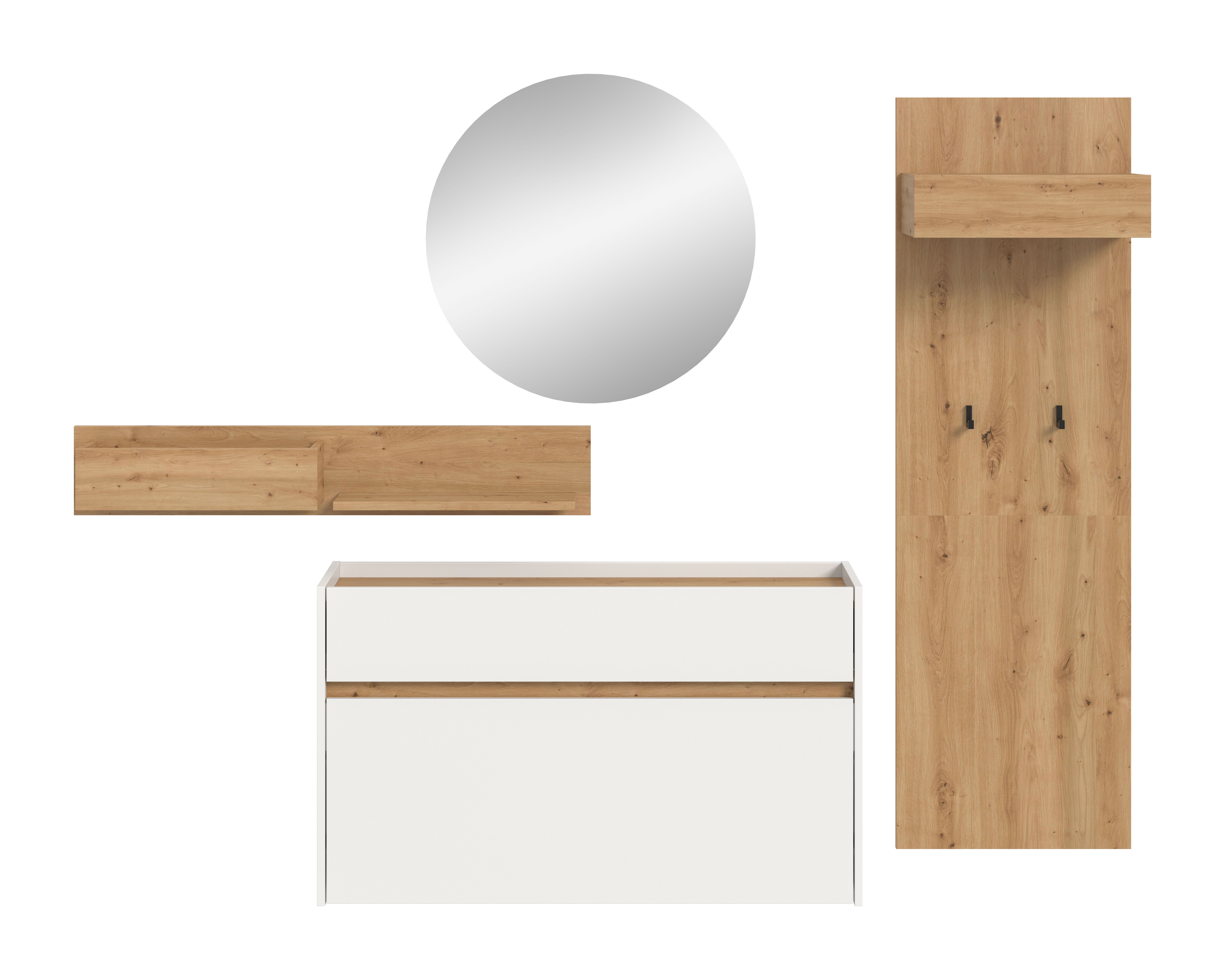 - 4-teiliges Set, bestehend aus: 1x Schuhkommode, 1x Hängeregal, 1x Spiegel, 1x Garderobenpaneel