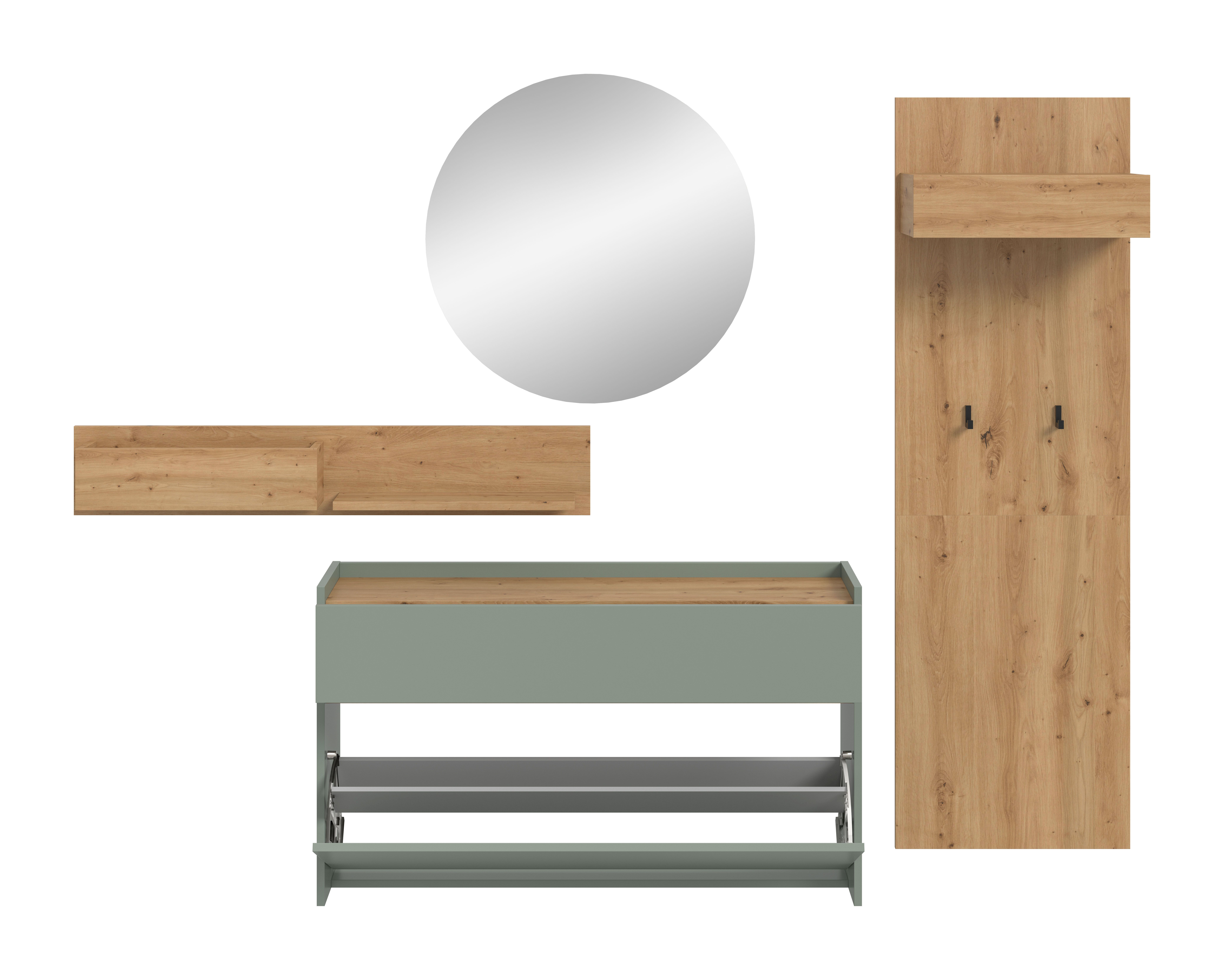 - 4-teiliges Set, bestehend aus: 1x Schuhkommode, 1x Hängeregal, 1x Spiegel, 1x Garderobenpaneel