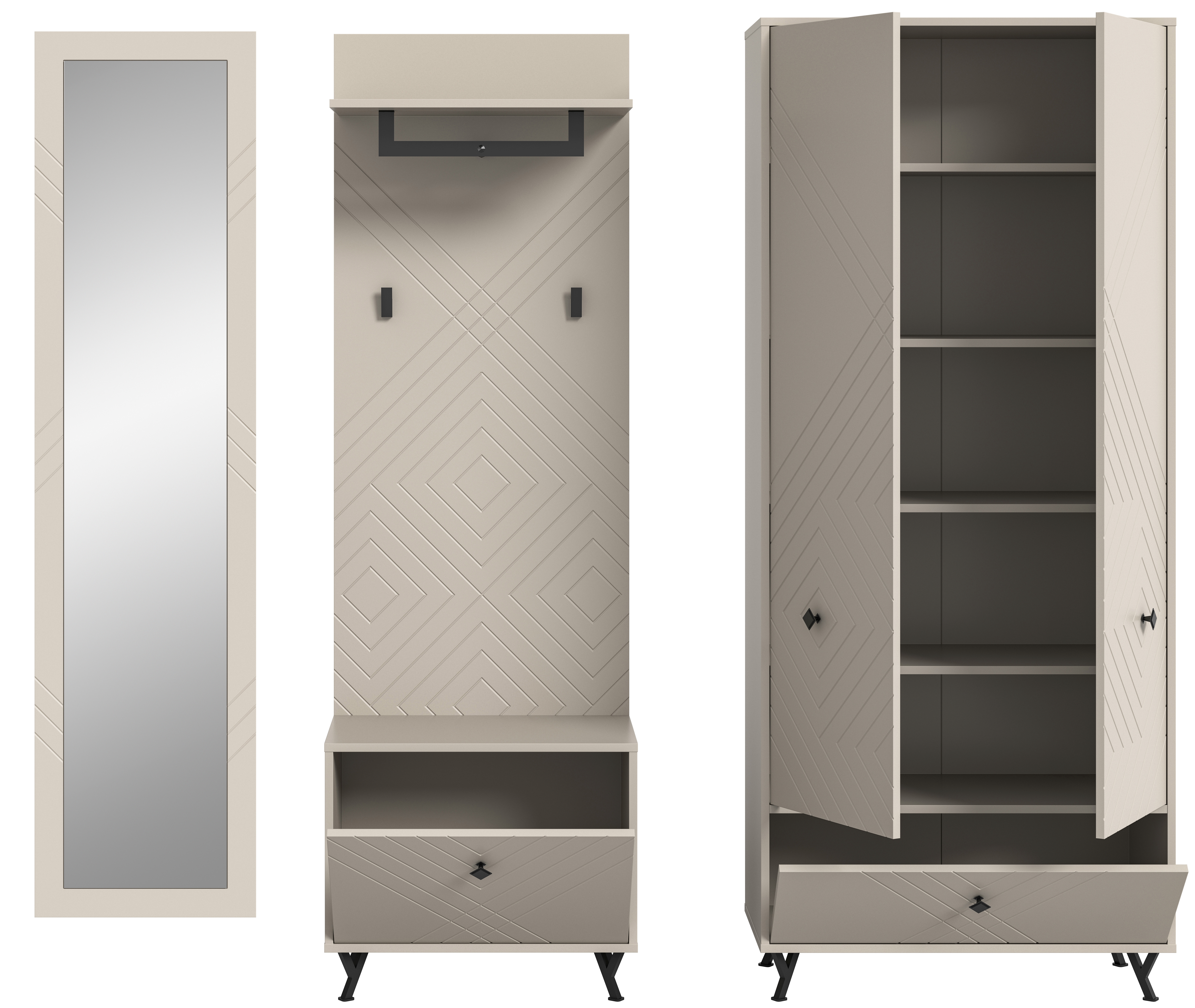 - Design/Stil: Die Garderobenkombination besticht durch ihr modernes und zugleich zeitloses Design mit einer sandbeigen Melamin-Oberfläche und einer matten, tiefgezogenen Struktur. Die klaren Linien und die harmonische Farbgebung verleihen dem Raum eine ansprechende Ästhetik und sorgen für eine angenehme Atmosphäre.