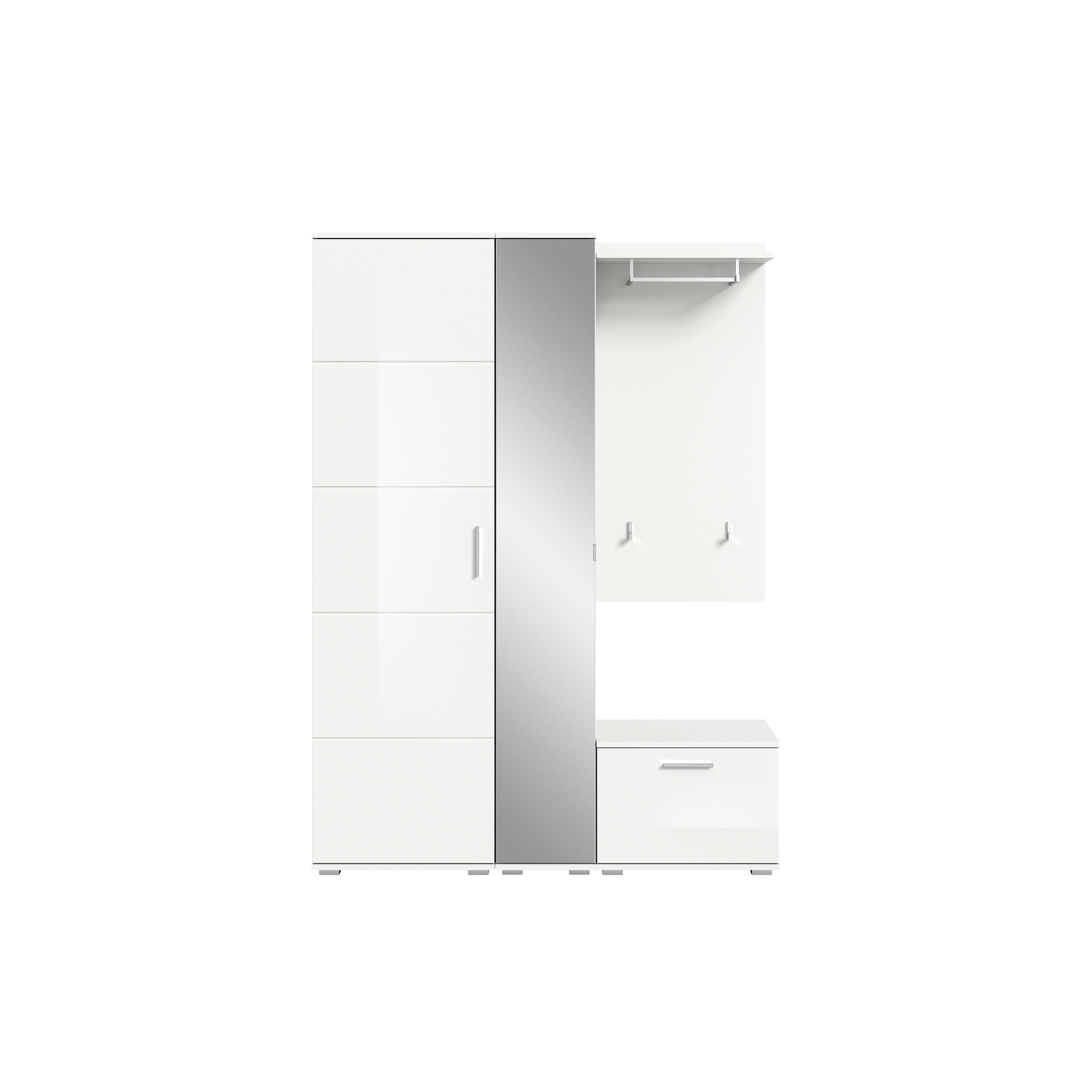 - Design/Stil: Die Garderobenkombination in Weiß Nachbildung und Weiß Hochglanz überzeugt mit ihrem modernen und eleganten Erscheinungsbild. Die Kombination aus glänzenden Fronten und einer matten Oberfläche verleiht der Garderobe ein ansprechendes Kontrastdesign, das sich perfekt in zeitgemäße Einrichtungskonzepte einfügt. Die klaren Linien und die minimalistische Gestaltung sorgen für eine zeitlose Eleganz, während die Griffe in Chromoptik einen Hauch von Raffinesse verleihen.