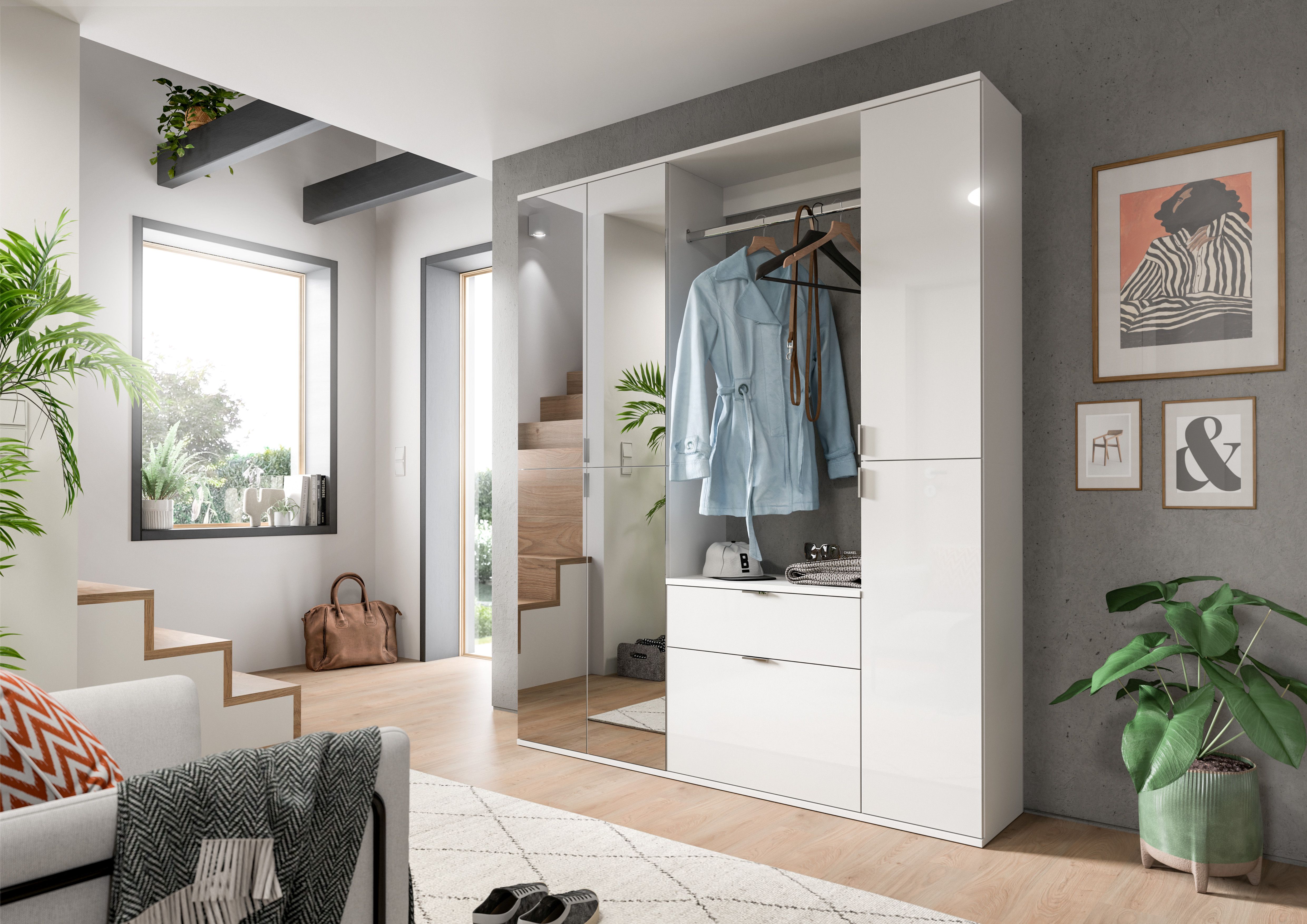 - Design/Stil: Die Garderobenkombination in Weiß-Nachbildung und Weiß-Hochglanz und Spiegel strahlt eine moderne Eleganz aus, die durch das glänzende Finish und die klaren Linien betont wird. Das Hochglanz-Finish verleiht dem Möbelstück ein ansprechendes und zeitgemäßes Aussehen, während das Weiß-Nachbildung für einen frischen und hellen Gesamteindruck sorgt. Dieses schlichte und dennoch stilvolle Design passt gut zu verschiedenen Einrichtungsstilen und verleiht dem Raum eine helle und luftige Atmosphäre.