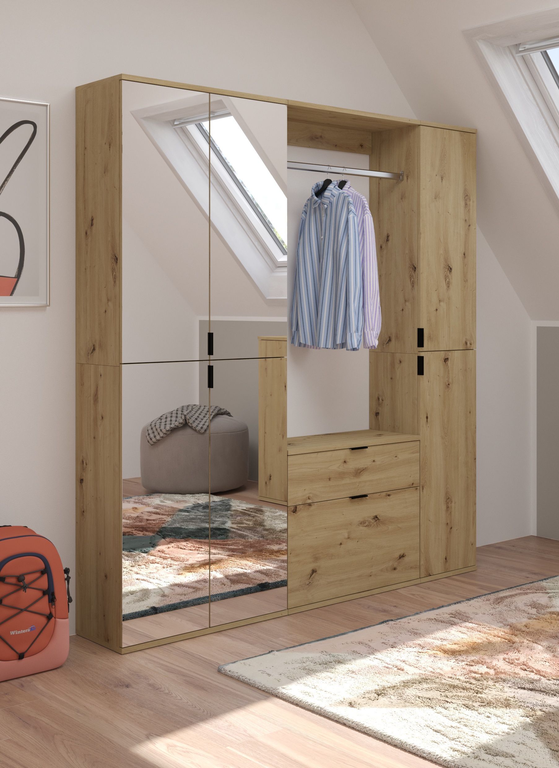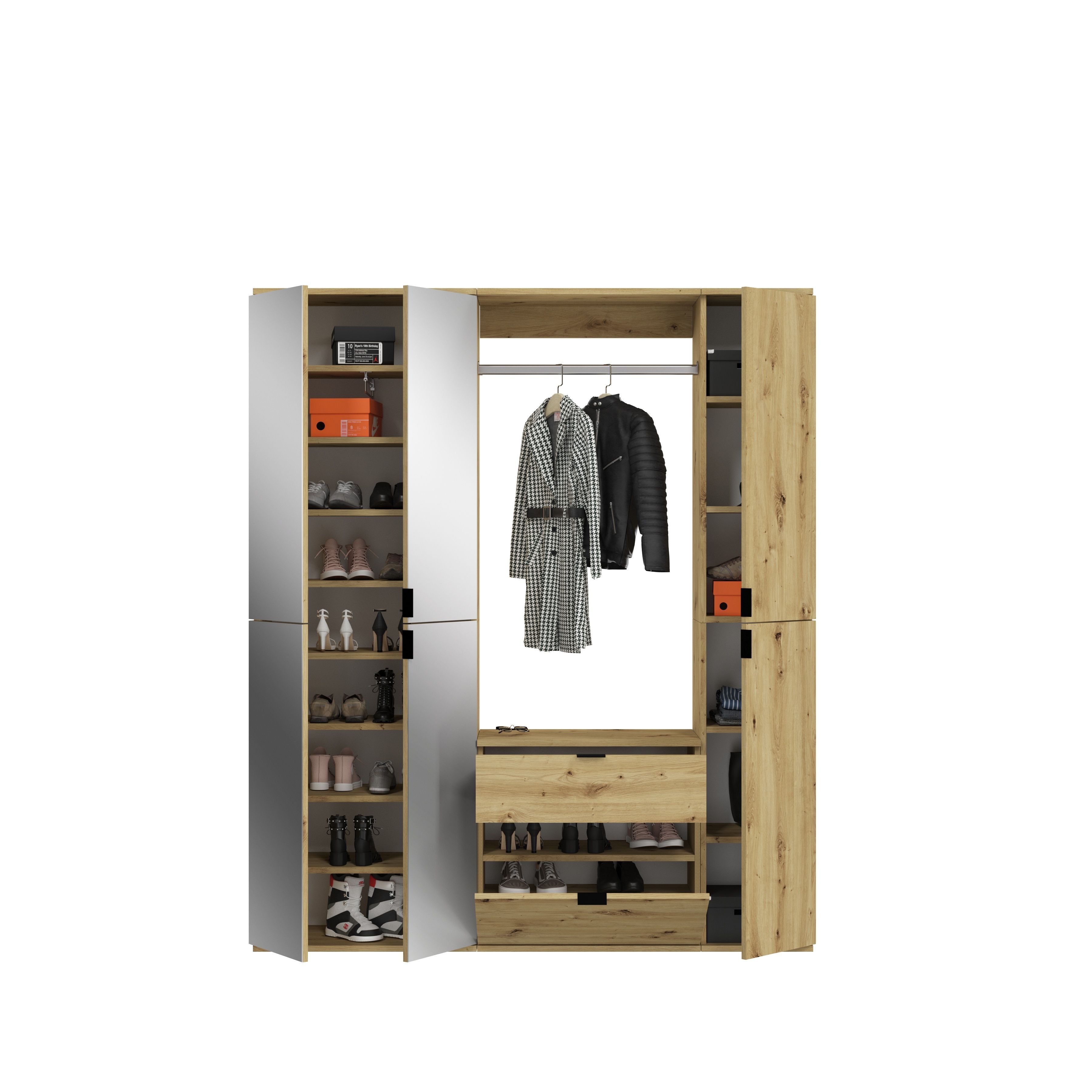 Optimieren Sie Ihren Flur, die Diele, den Hauswirtschaftsraum, das Büro und das Schlafzimmer mit unserer Garderobenkombination. Mit den Maßen 152x193x34 cm und einem eleganten Design in Artisan Holznachbildung und Spiegel verleiht sie jedem Raum eine helle und moderne Atmosphäre. Holen Sie sich dieses praktische und stilvolle Möbelstück für eine organisierte und ästhetische Einrichtung.