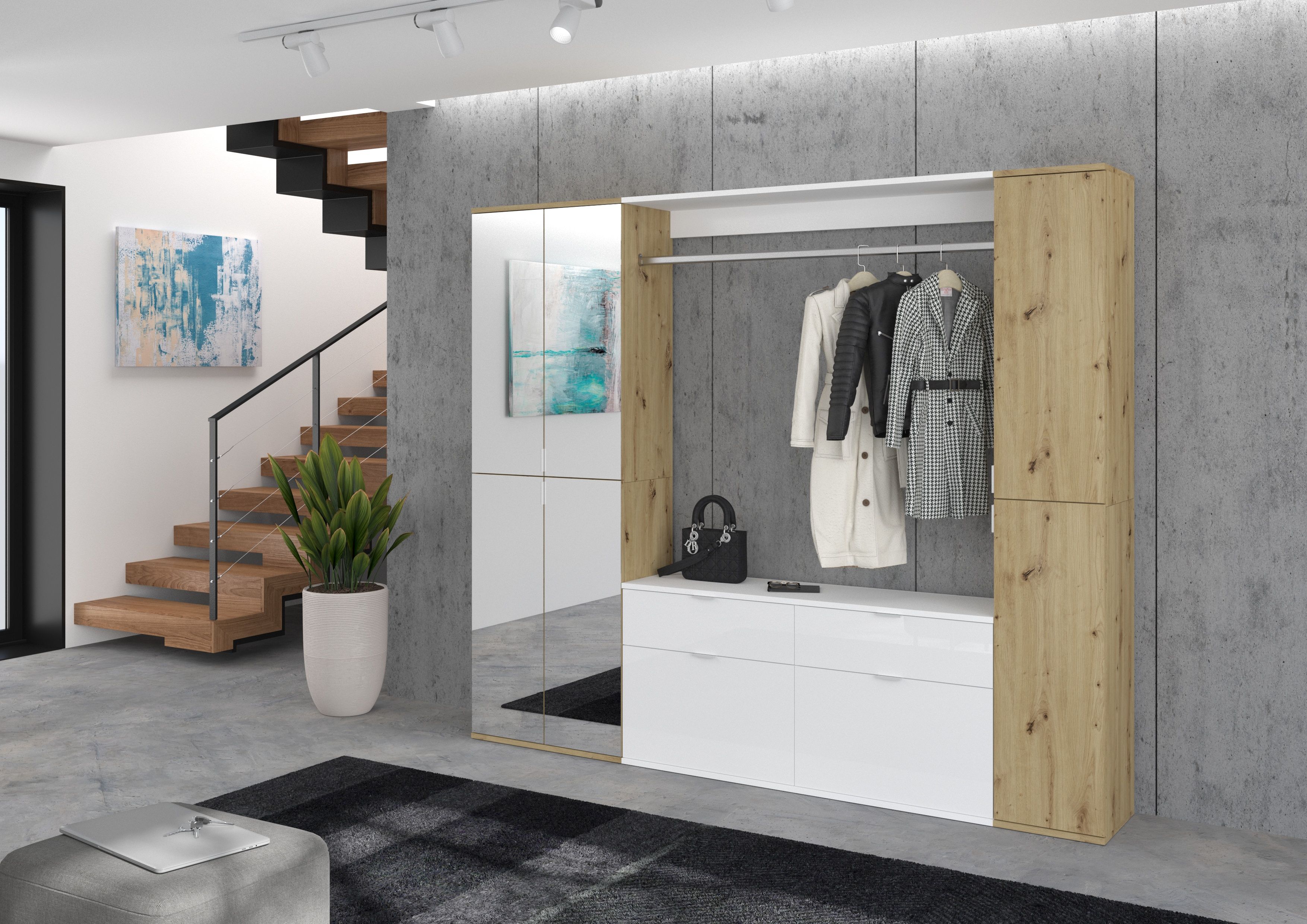 - Design/Stil: Die Garderobenkombination kombiniert die warme Ausstrahlung von Artisan Eiche Nachbildung mit der zeitlosen Eleganz von weißer Nachbildung und dem raffinierten Look von Spiegelglas. Diese harmonische Fusion verleiht dem Möbelstück einen modernen und einladenden Charme, der sich gut in verschiedene Einrichtungsstile einfügt.