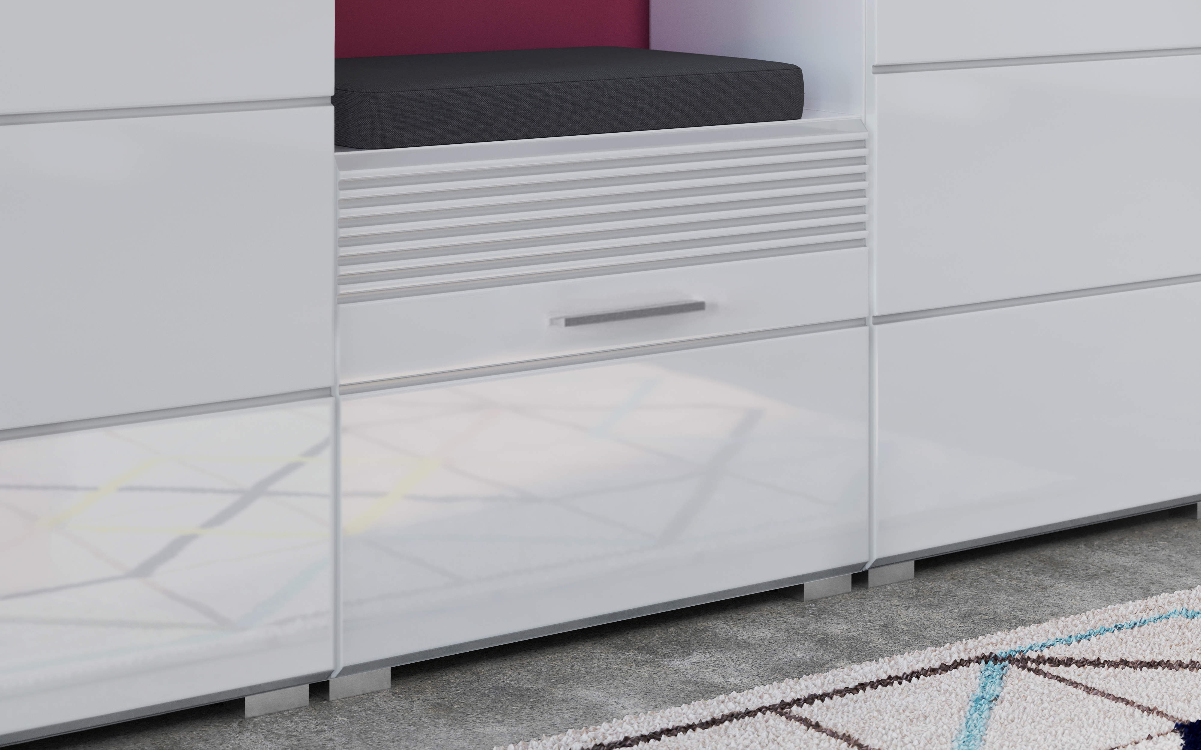 - Design/Stil: Moderne und elegante Garderobenkombination mit einer Kombination aus weißer Nachbildung und weißem Hochglanz tiefzieh, die eine stilvolle und zeitgemäße Ästhetik für den Flur, die Diele oder den Hauswirtschaftsraum bietet. Die glänzenden Oberflächen verleihen dem Möbelstück eine gewisse Raffinesse und wirken gleichzeitig frisch und ansprechend.