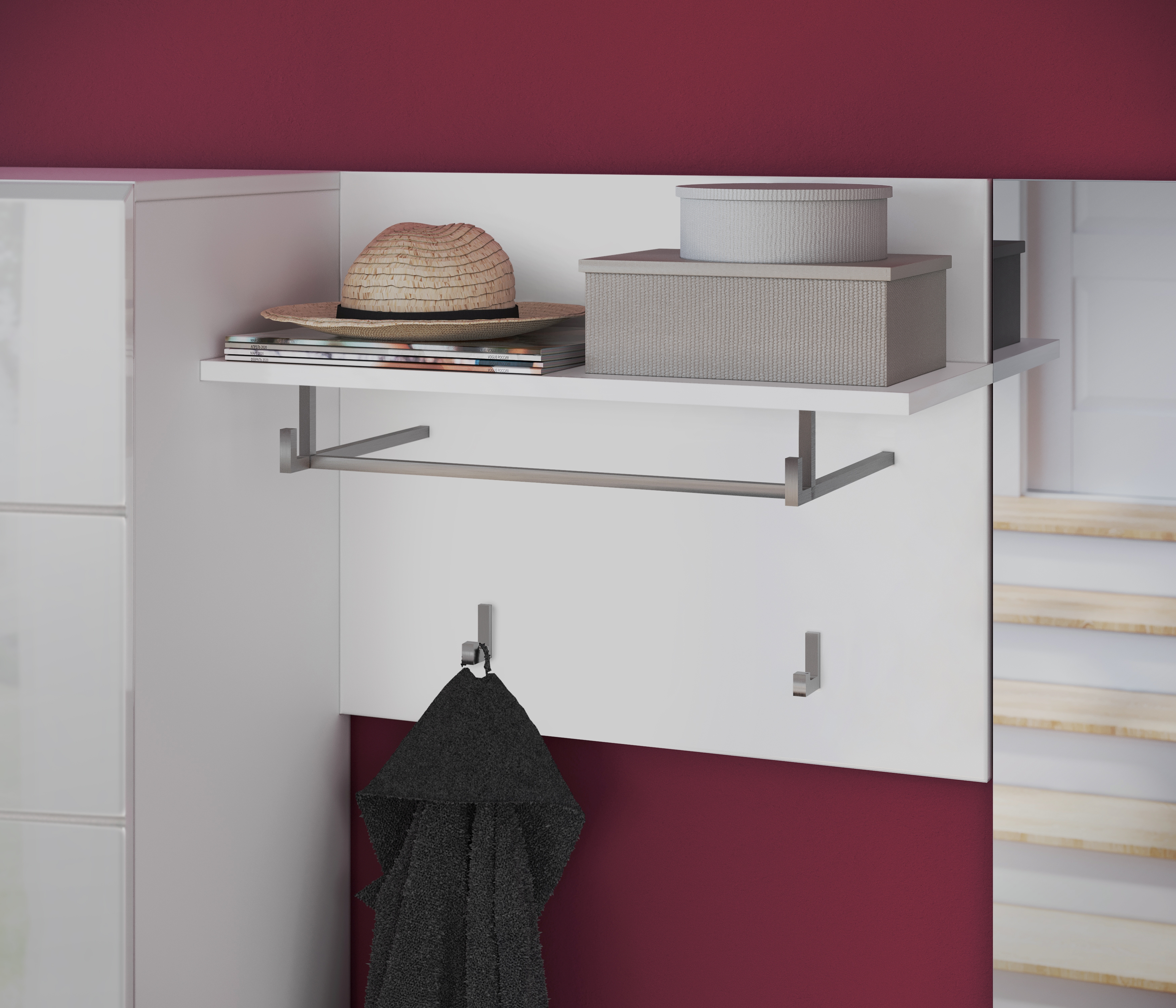 1 Garderobenpaneel mit 1 Hutboden, 1 Kleiderstange und 2 Haken