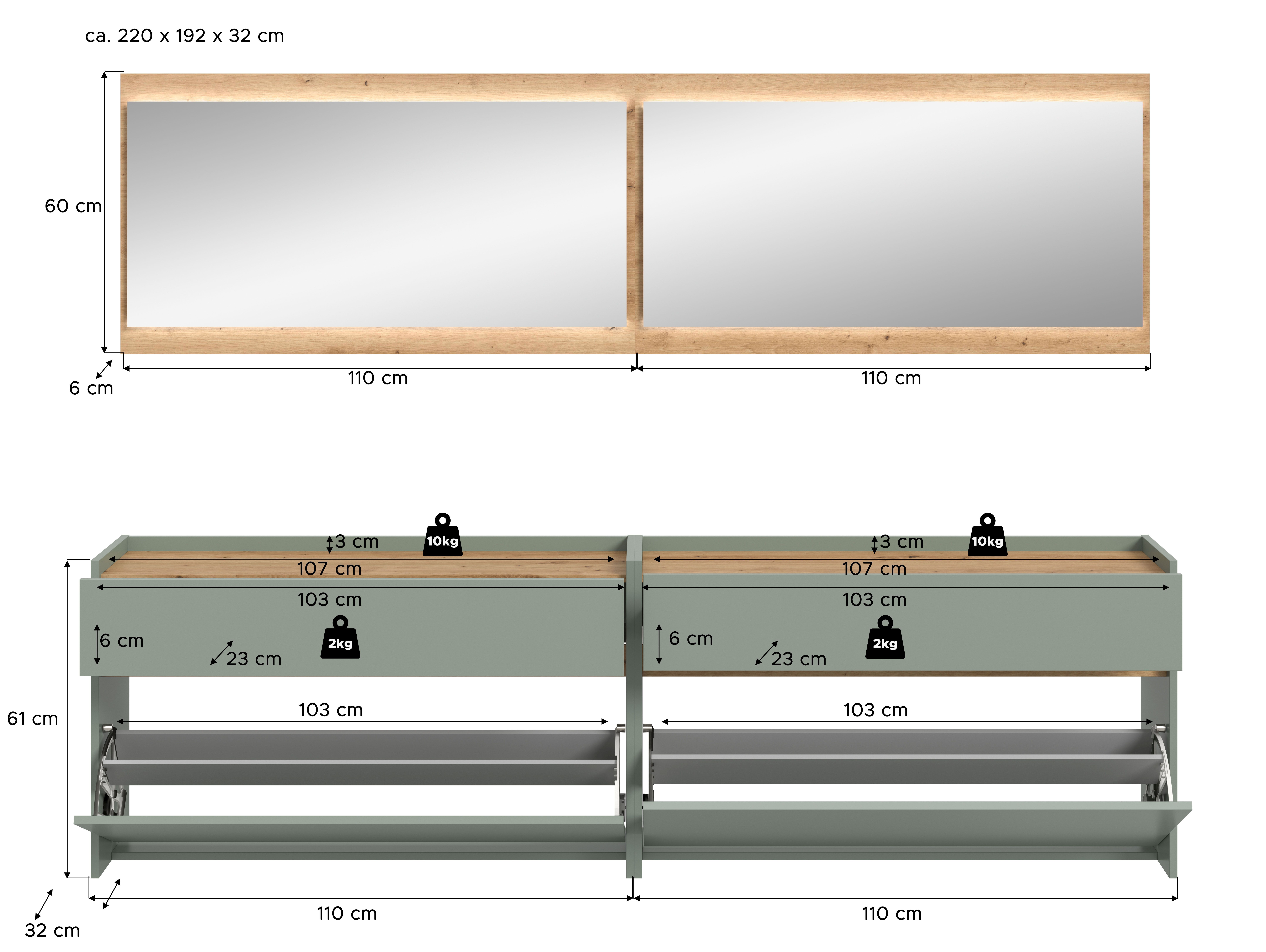 - 6-teiliges Set, bestehend aus: 1x Schuhkommode, 1x Schuhkommode, 1x Spiegel, 1x Spiegel, 1x LED Bad warm-weiß 2x 110cm, 1x LED Bad warm-weiß 2x 110cm