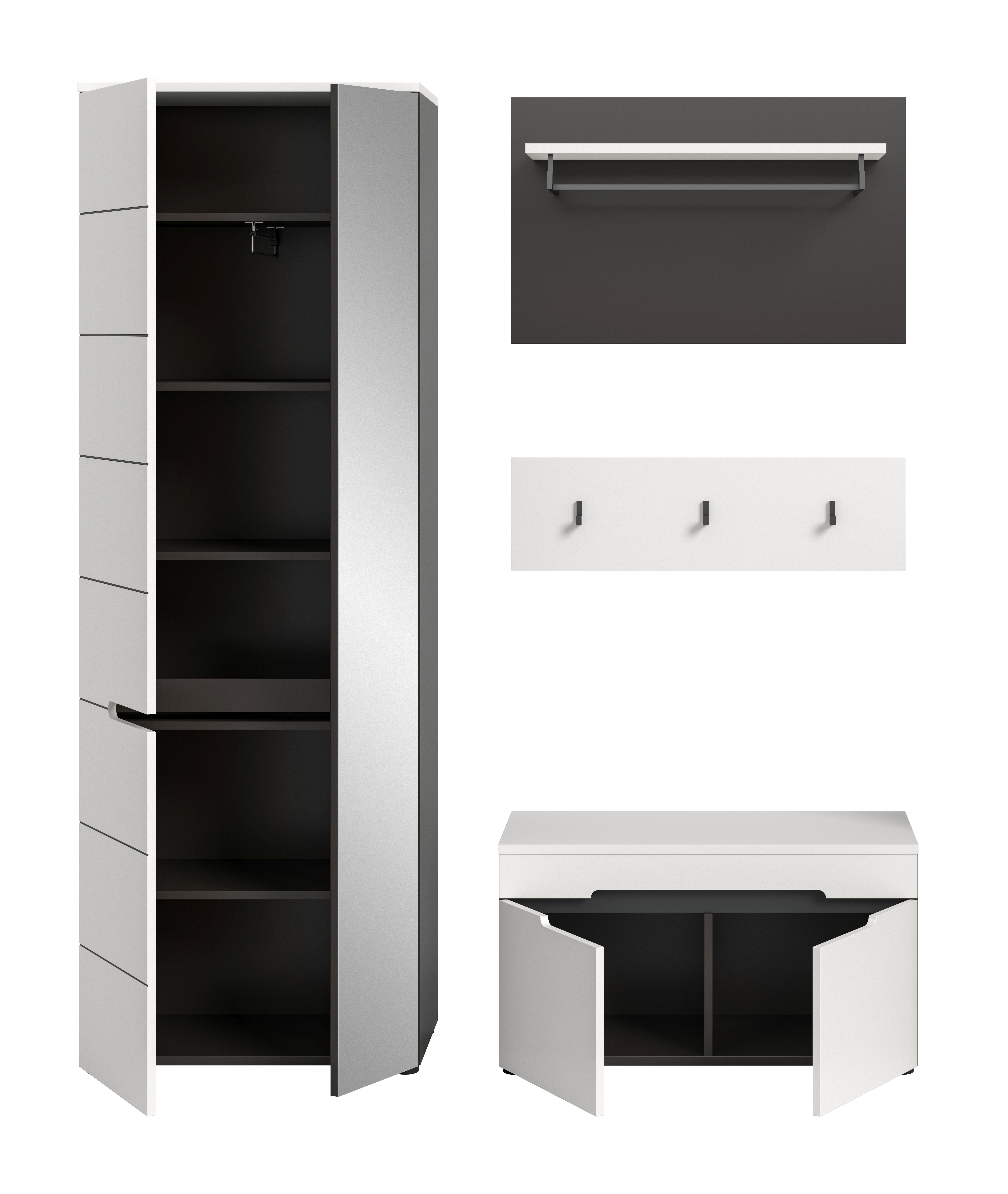 Unsere Garderobenkombination aus hochwertigem Basaltgrau Nachbildung und Weiß bietet eine moderne und funktionale Lösung für Ihren Eingangsbereich. Mit verschiedenen Elementen wie Garderobenschrank, Sitzbank und Garderobenpaneel schaffen Sie eine organisierte und einladende Atmosphäre. Entdecken Sie jetzt diese vielseitige und ästhetische Kombination für eine perfekte Garderobe.