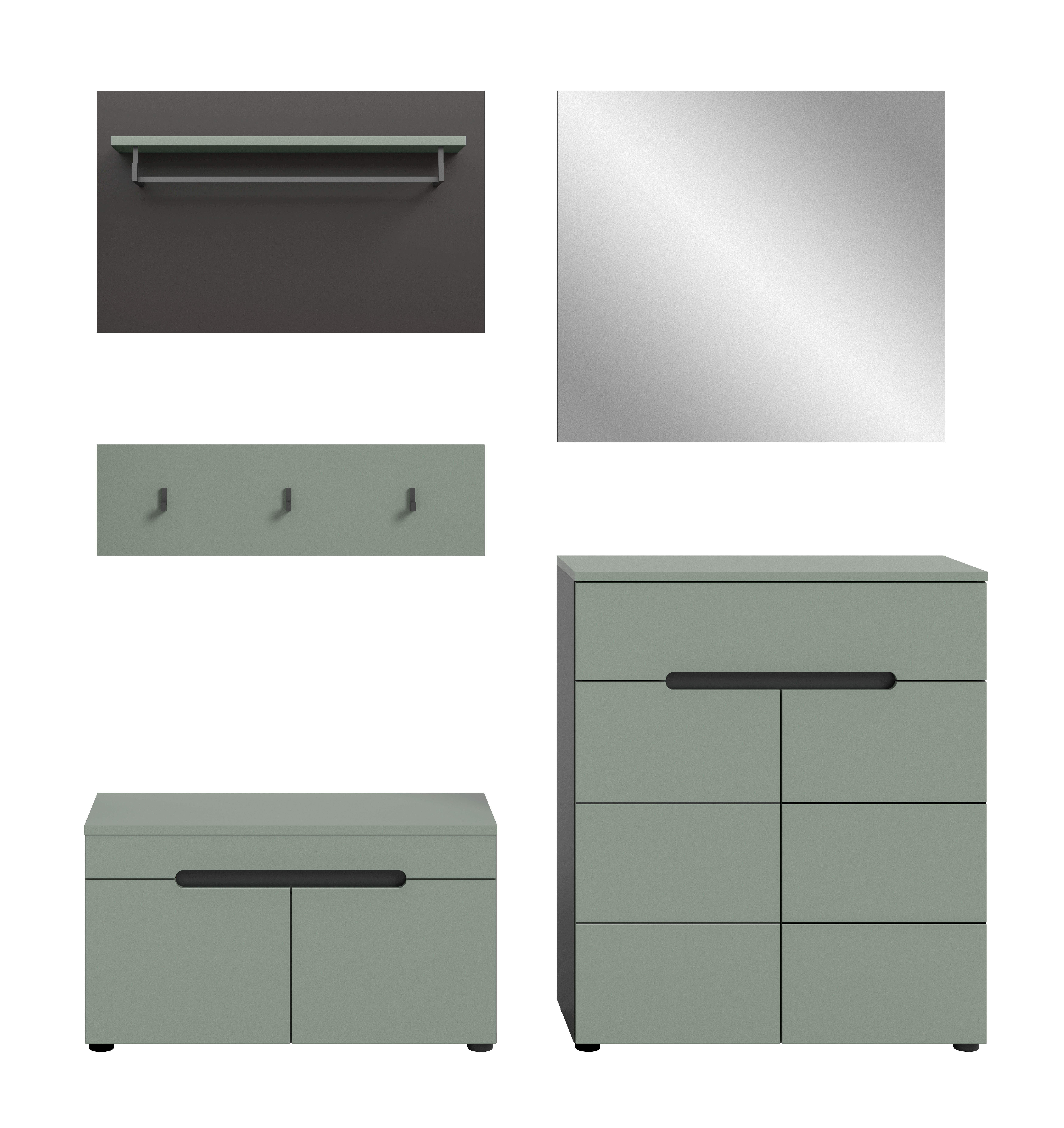 Unsere Garderobenkombination aus hochwertigem Basaltgrau Nachbildung und Smoke Green bietet eine moderne und funktionale Lösung für Ihren Eingangsbereich. Mit verschiedenen Elementen wie Garderobenpaneel, Sitzbank, Schuhkommode und Spiegel schaffen Sie eine organisierte und einladende Atmosphäre. Entdecken Sie jetzt diese vielseitige und ästhetische Kombination für eine perfekte Garderobe.