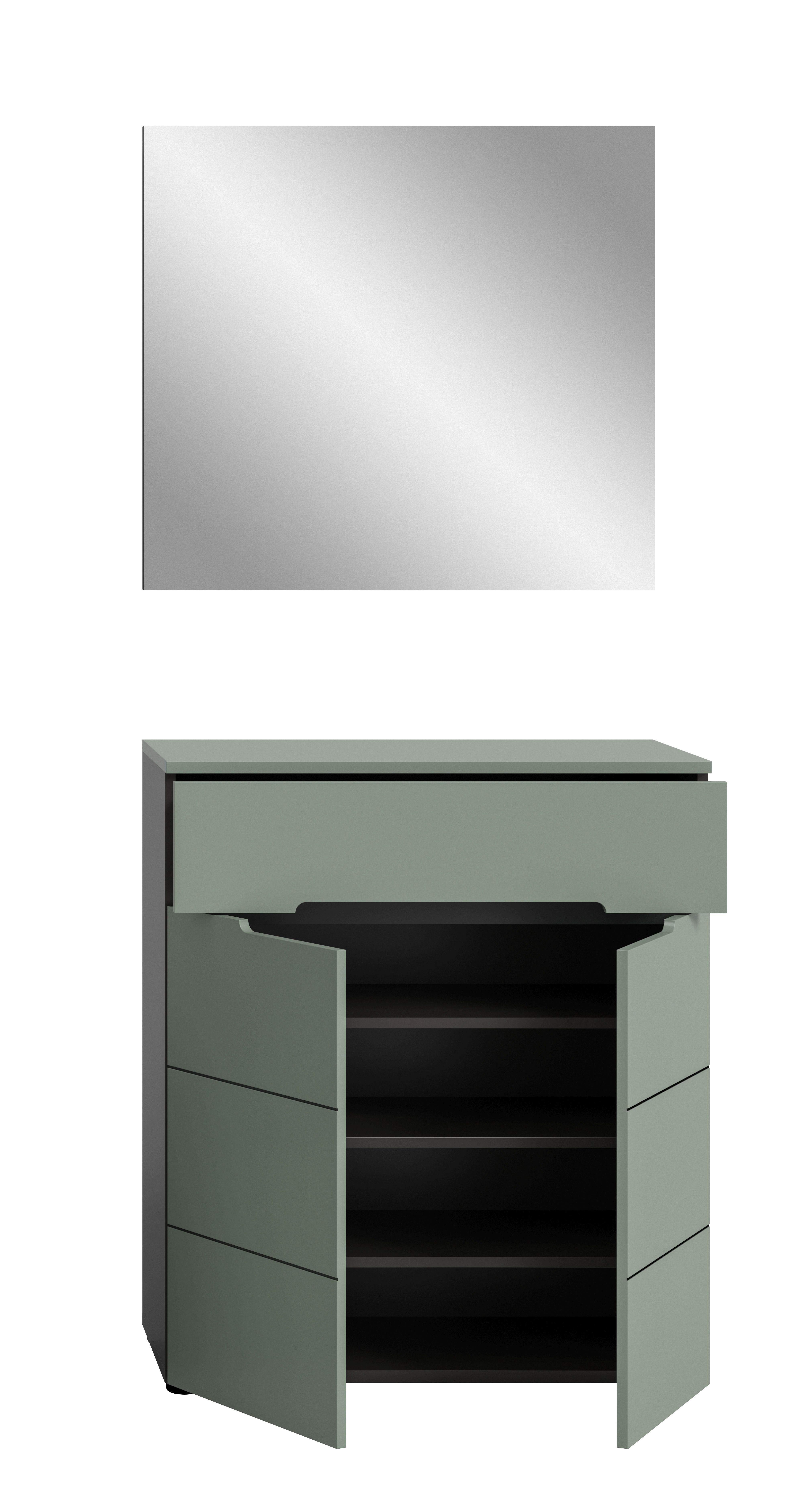 Unsere Garderobenkombination aus hochwertigem Basaltgrau Nachbildung und Smoke Green bietet eine moderne und funktionale Lösung für Ihren Eingangsbereich. Mit verschiedenen Elementen wie Schuhkommode und Spiegel schaffen Sie eine organisierte und einladende Atmosphäre. Entdecken Sie jetzt diese vielseitige und ästhetische Kombination für eine perfekte Garderobe.