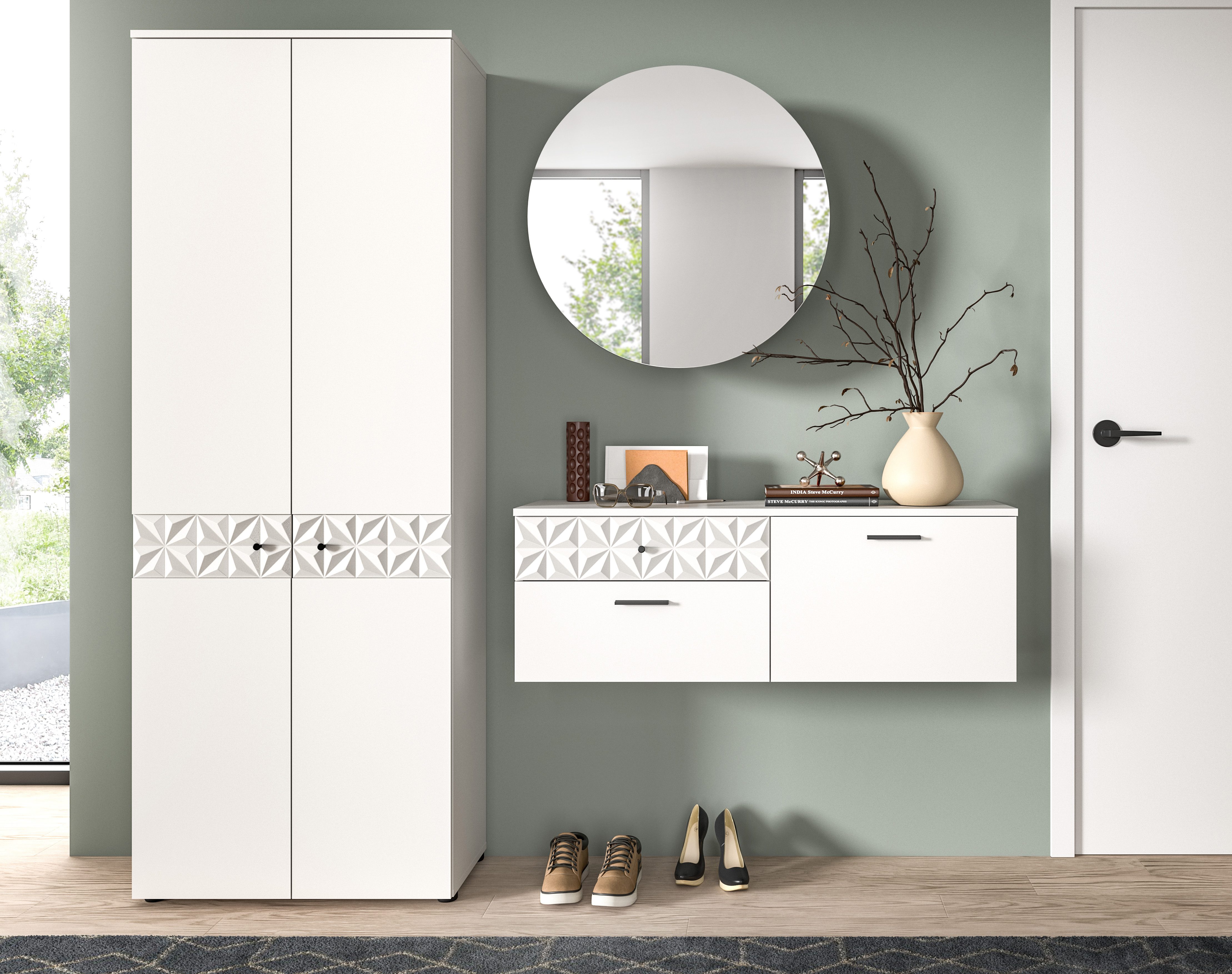 - Einsatzbereich: Die Garderobenkombination eignet sich perfekt für den Einsatz im Flur oder in der Diele, um zusätzlichen Stauraum zu schaffen und gleichzeitig das Raumambiente mit ihrem modernen Design aufzuwerten.