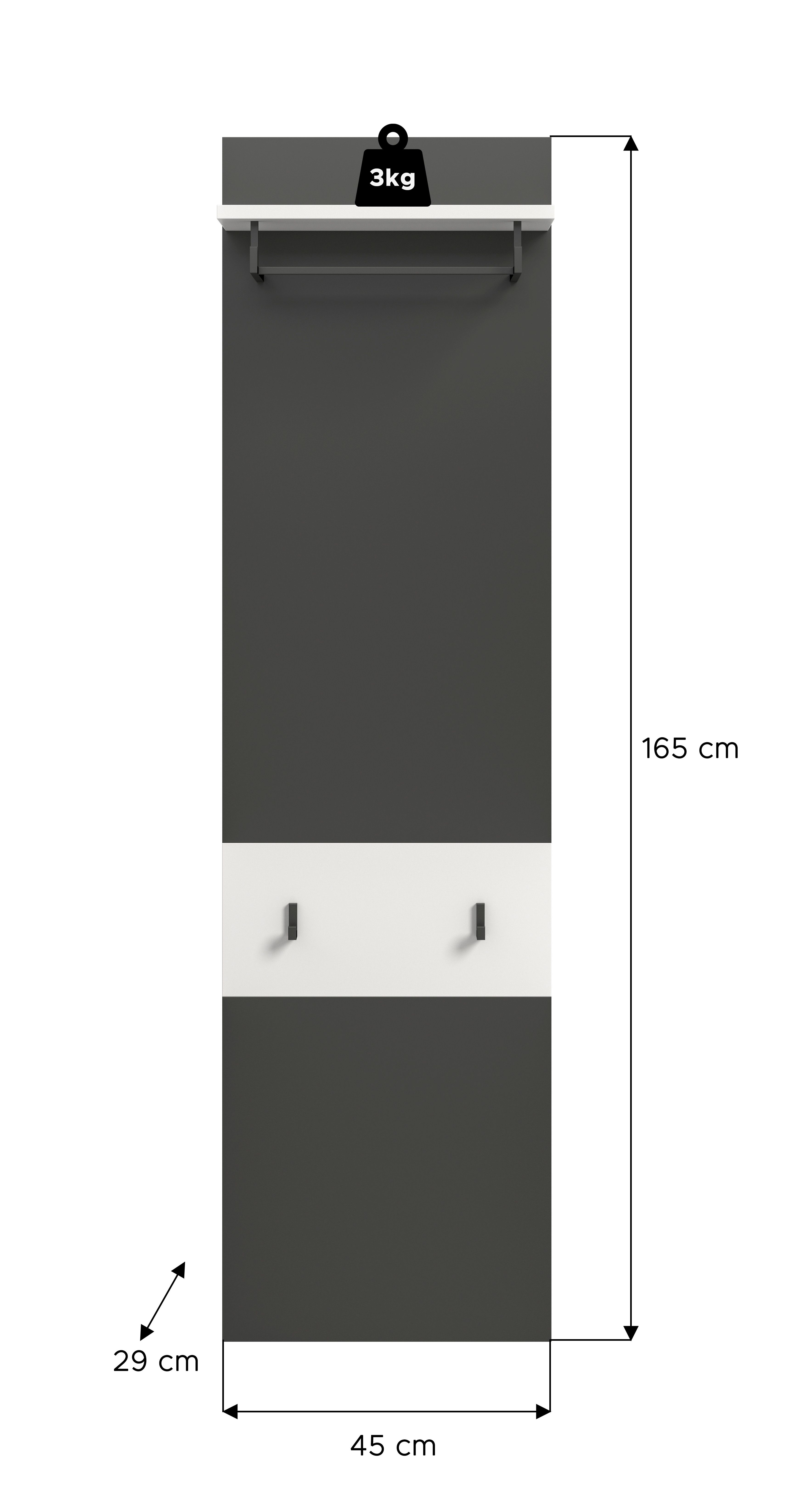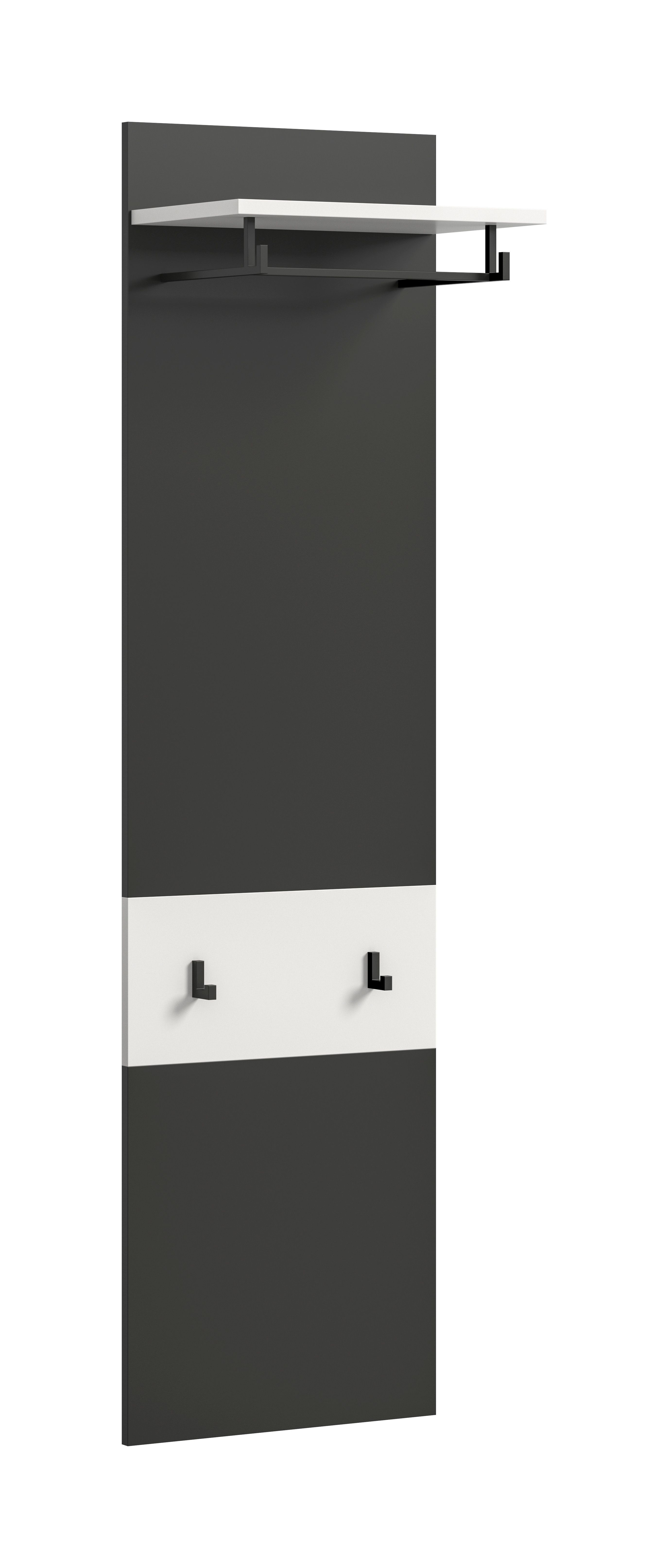 Das Paneel (B/H/T: 45x165x29 cm) in Basalt grau Nachbildung und Weiß ist eine elegante und praktische Lösung für Ihre Garderobe. Mit einer Höhe von 165 cm bietet es ausreichend Platz für Ihre Jacken, Taschen und Accessoires. Die stilvollen Haken und Ablageflächen sorgen für einen aufgeräumten Eingangsbereich und machen das Aufhängen von Gegenständen zum Kinderspiel. Das moderne Design und die helle Oberfläche fügen sich harmonisch in jedes Wohnambiente ein, während die kompakte Bauweise auch in schmalen Fluren hervorragend zur Geltung kommt. Verleihen Sie Ihrem Zuhause einen einladenden Look und schaffen Sie Ordnung mit diesem funktionalen Paneel!