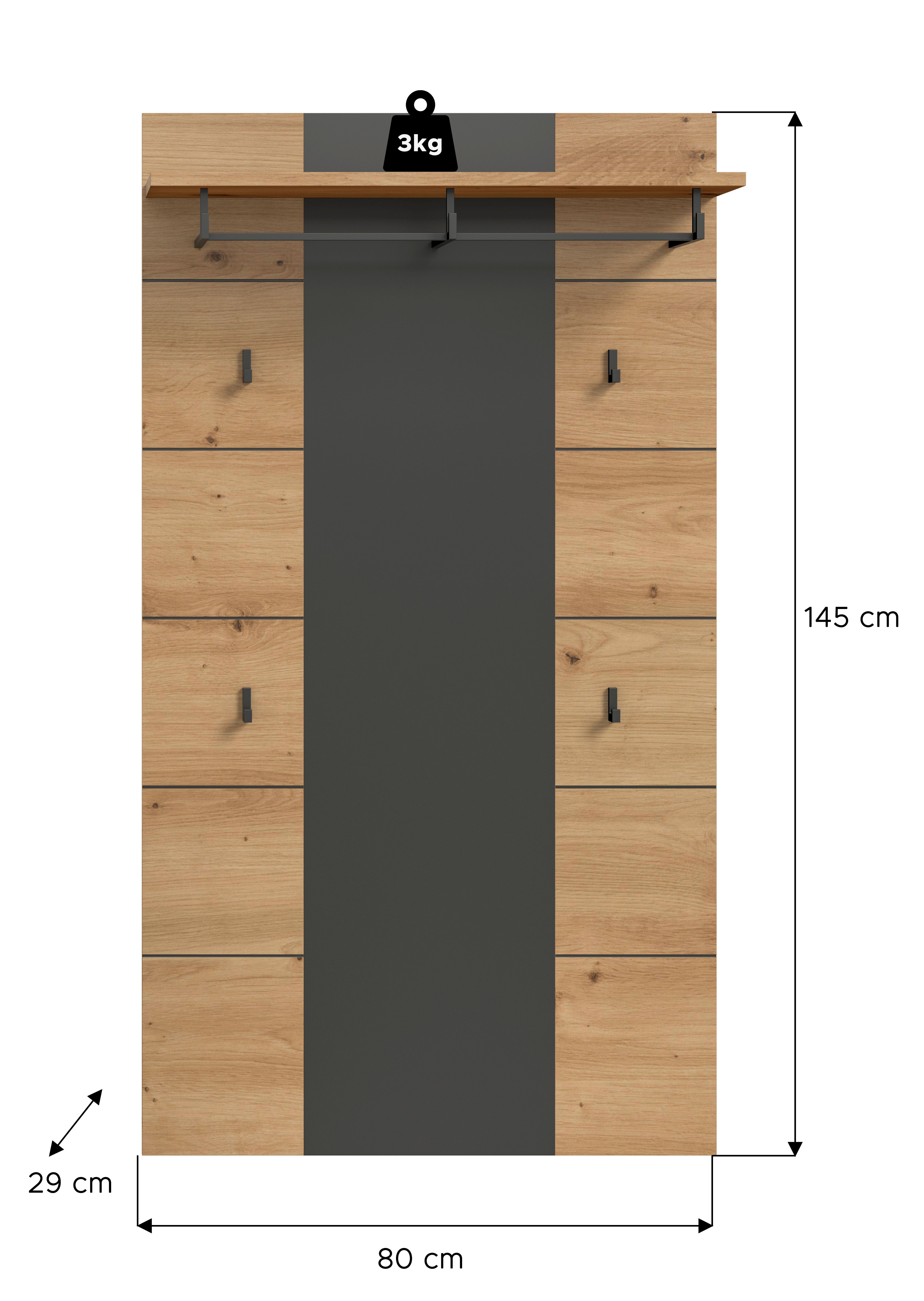 Unser vielseitiges Paneel (B/H/T: 80x141x29 cm) in artisanfarbiger Nachbildung ist die ideale Wahl für Ihren Eingangsbereich. Mit einem durchdachten Design bietet es Platz für Jacken, Taschen und Schlüssel, während die stilvollen Haken für eine ordentliche Aufbewahrung sorgen. Die helle, moderne Optik des Paneels fügt sich nahtlos in Ihr Zuhause ein und verleiht Ihrem Flur eine freundliche Ausstrahlung. Die kompakte Bauweise gewährleistet, dass es auch in schmalen Räumen hervorragend zur Geltung kommt. Bringen Sie mit diesem praktischen Paneel Ordnung in Ihre Garderobe und gestalten Sie einen einladenden Einstieg in Ihr Zuhause!