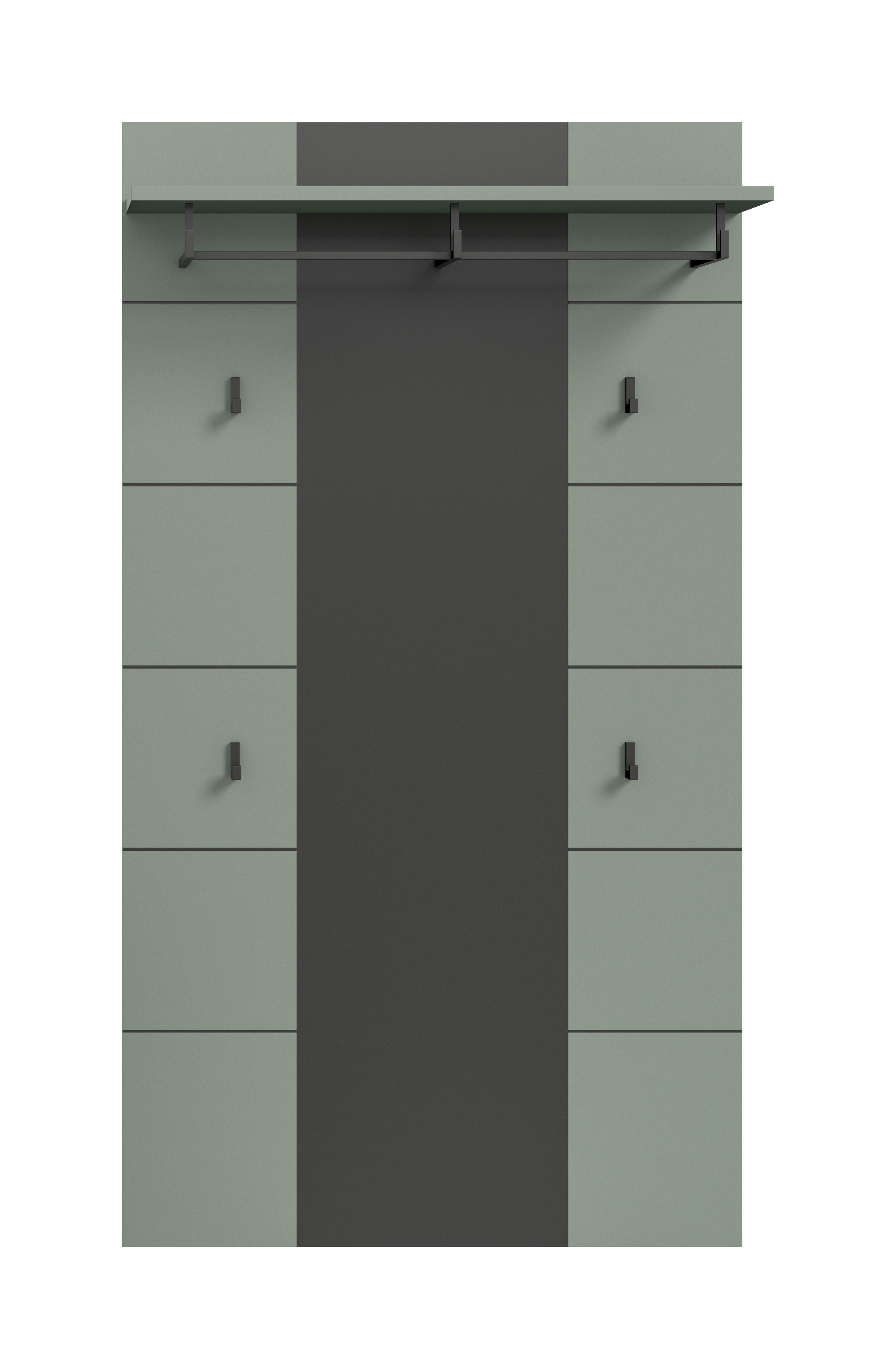 Unser vielseitiges Paneel (B/H/T: 80x141x29 cm) in basalt grauer Nachbildung und Smoke Green ist die ideale Wahl für Ihren Eingangsbereich. Mit einem durchdachten Design bietet es Platz für Jacken, Taschen und Schlüssel, während die stilvollen Haken für eine ordentliche Aufbewahrung sorgen. Die helle, moderne Optik des Paneels fügt sich nahtlos in Ihr Zuhause ein und verleiht Ihrem Flur eine freundliche Ausstrahlung. Die kompakte Bauweise gewährleistet, dass es auch in schmalen Räumen hervorragend zur Geltung kommt. Bringen Sie mit diesem praktischen Paneel Ordnung in Ihre Garderobe und gestalten Sie einen einladenden Einstieg in Ihr Zuhause!