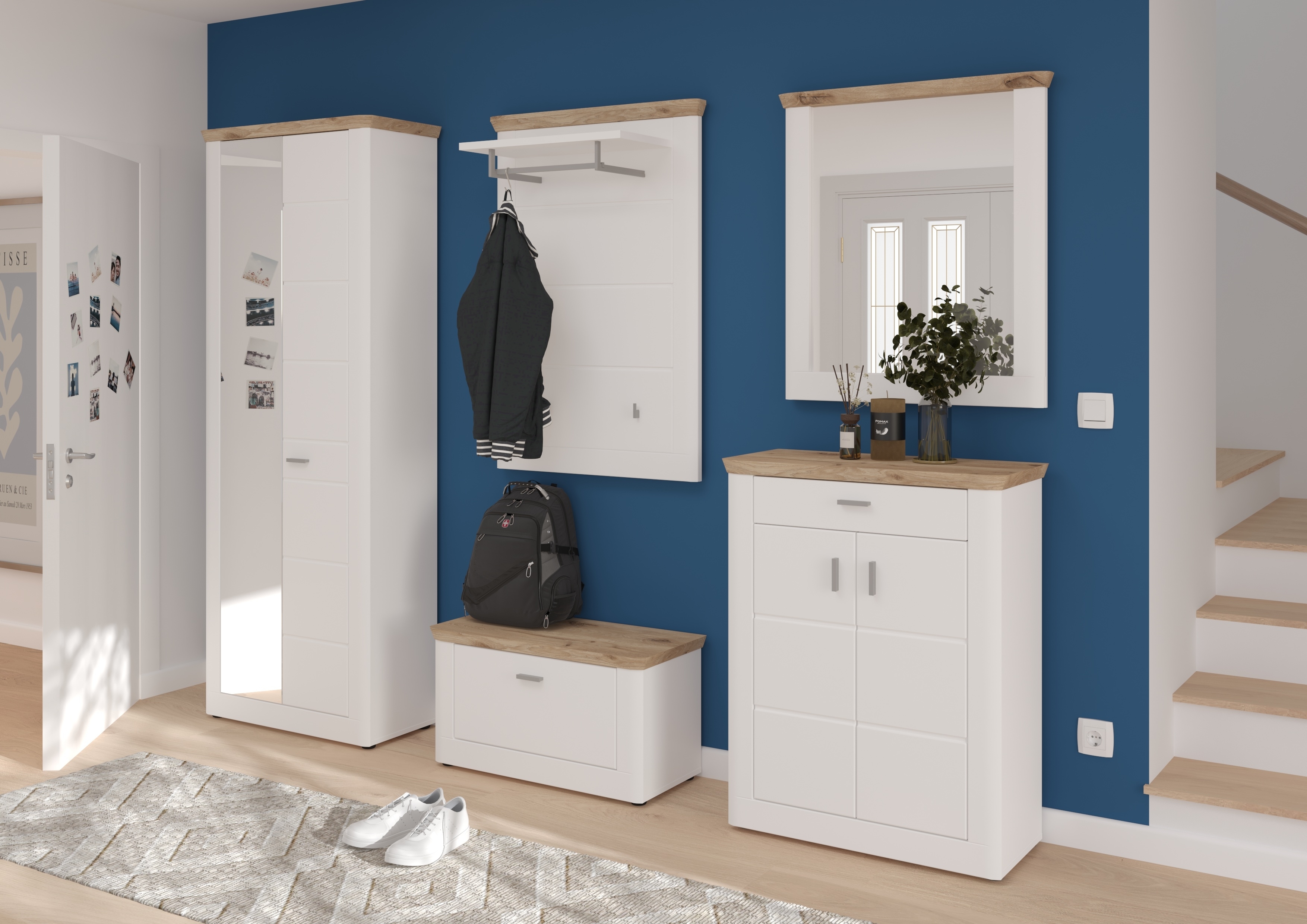 - Design/Stil: Schlichtes und modernes Design mit weißer Nachbildung und matt tiefgezogener Oberfläche für eine zeitgemäße Ästhetik, die sich gut in den Flur oder die Diele einfügt und vielseitig mit verschiedenen Einrichtungsstilen kombinierbar ist.