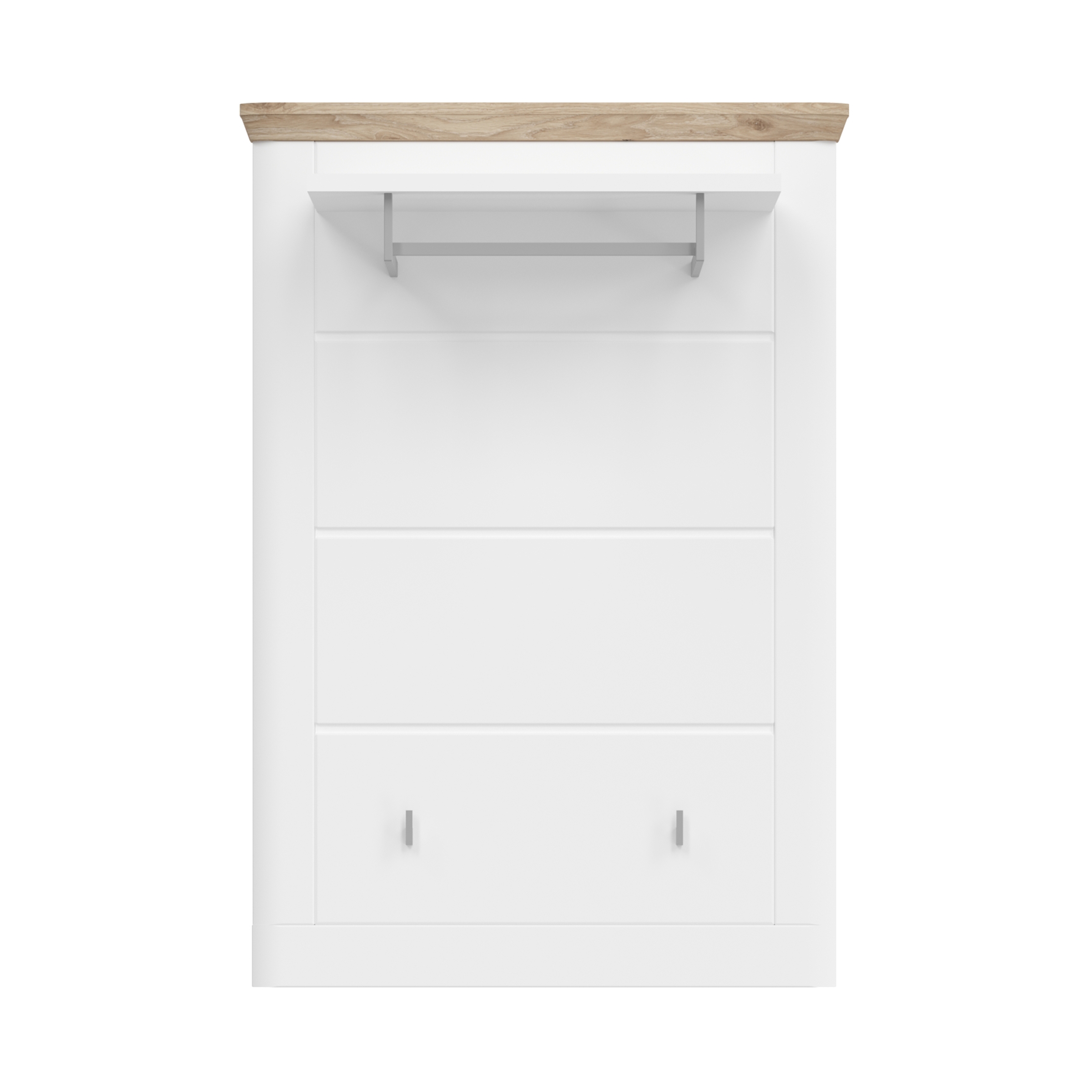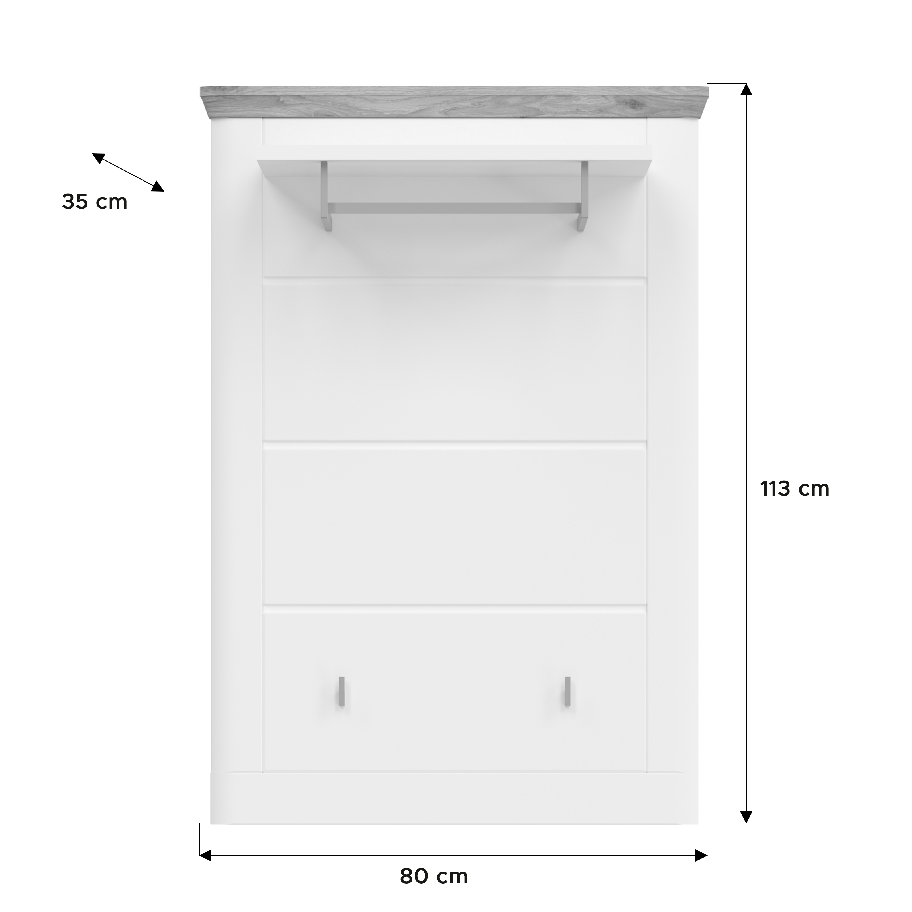 Entdecken Sie unser vielseitiges Garderobepaneel in Weiß Nachbildung und Weiß Matt Tiefzieh, perfekt für Flur oder Diele. Mit Maßen von 79x114x32 cm bietet dieses Paneel nicht nur ausreichend Platz für Ihre Jacken und Accessoires, sondern verleiht auch Ihrem Eingangsbereich eine ordentliche und stilvolle Note. Sein zeitloses Design und die hochwertige Verarbeitung machen es zu einem unverzichtbaren Element für eine organisierte und ästhetische Raumgestaltung.