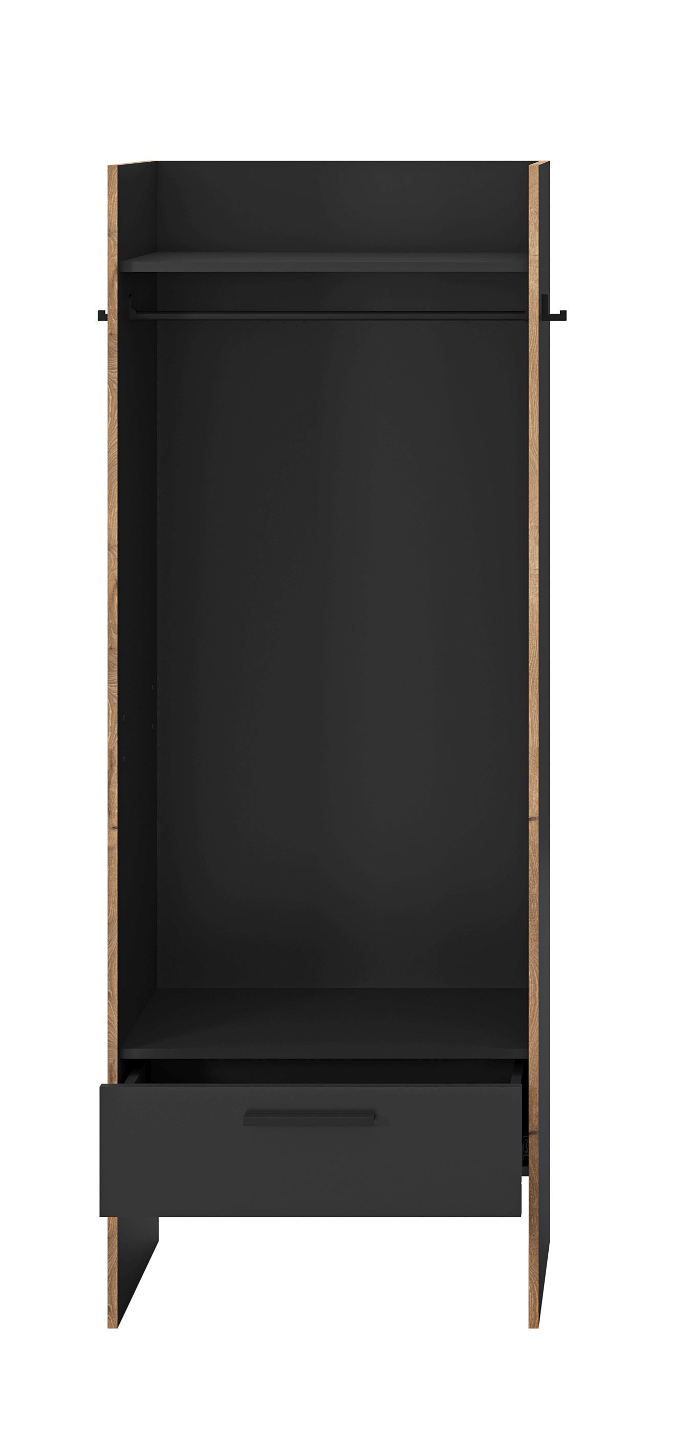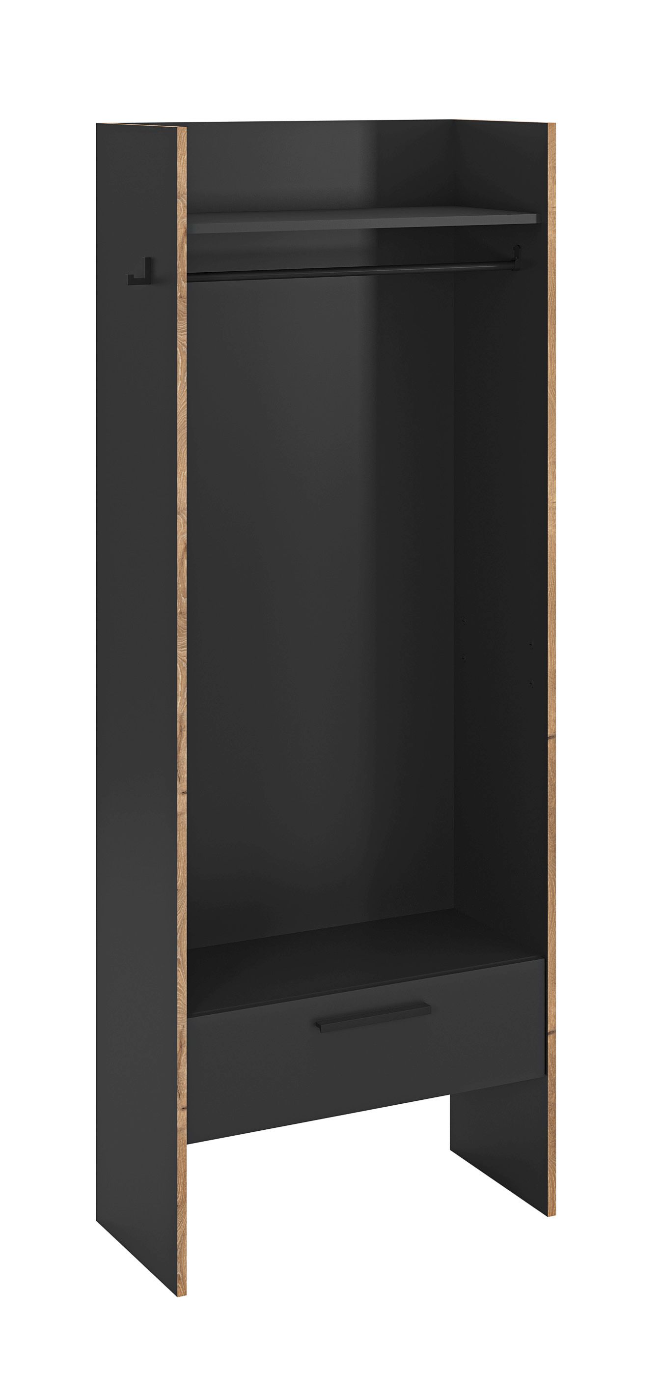 Dieser Garderobenschrank verwandelt Ihren Eingangsbereich in eine aufgeräumte und stilvolle Wohlfühloase, die Ihnen den Alltag erleichtert. Er bietet Ihnen nicht nur praktischen Stauraum für Kleidung und Accessoires, sondern schafft auch einen einladenden Platz zum Ankommen und Entspannen. Stellen Sie sich vor, wie angenehm es ist, Ihre Jacken ordentlich verstaut zu wissen und beim Anziehen bequem auf der integrierten Sitzfläche Platz zu nehmen. Dieses Möbelstück verbindet Funktionalität mit einem modernen Design in elegantem Basalt-Melamin, das jedem Raum eine zeitlose Ästhetik verleiht. Besonders hervorzuheben sind die durchdachten Details: Eine robuste Kleiderstange für Ihre Mäntel und Blusen sowie eine geräumige Schublade für Handschuhe, Mützen oder andere Utensilien sorgen für Ordnung. Die belastbare Sitzfläche bis 90 kg macht das Anziehen zum Kinderspiel und bietet zusätzlichen Komfort. Mit den Maßen von 70 x 189 x 37 cm passt der Schrank ideal auch in kleine Flure oder Nischen. Ob morgens beim schnellen Anziehen der Jacke oder abends beim Schuhewechsel – dieses Möbelstück unterstützt Sie zuverlässig im Alltag.