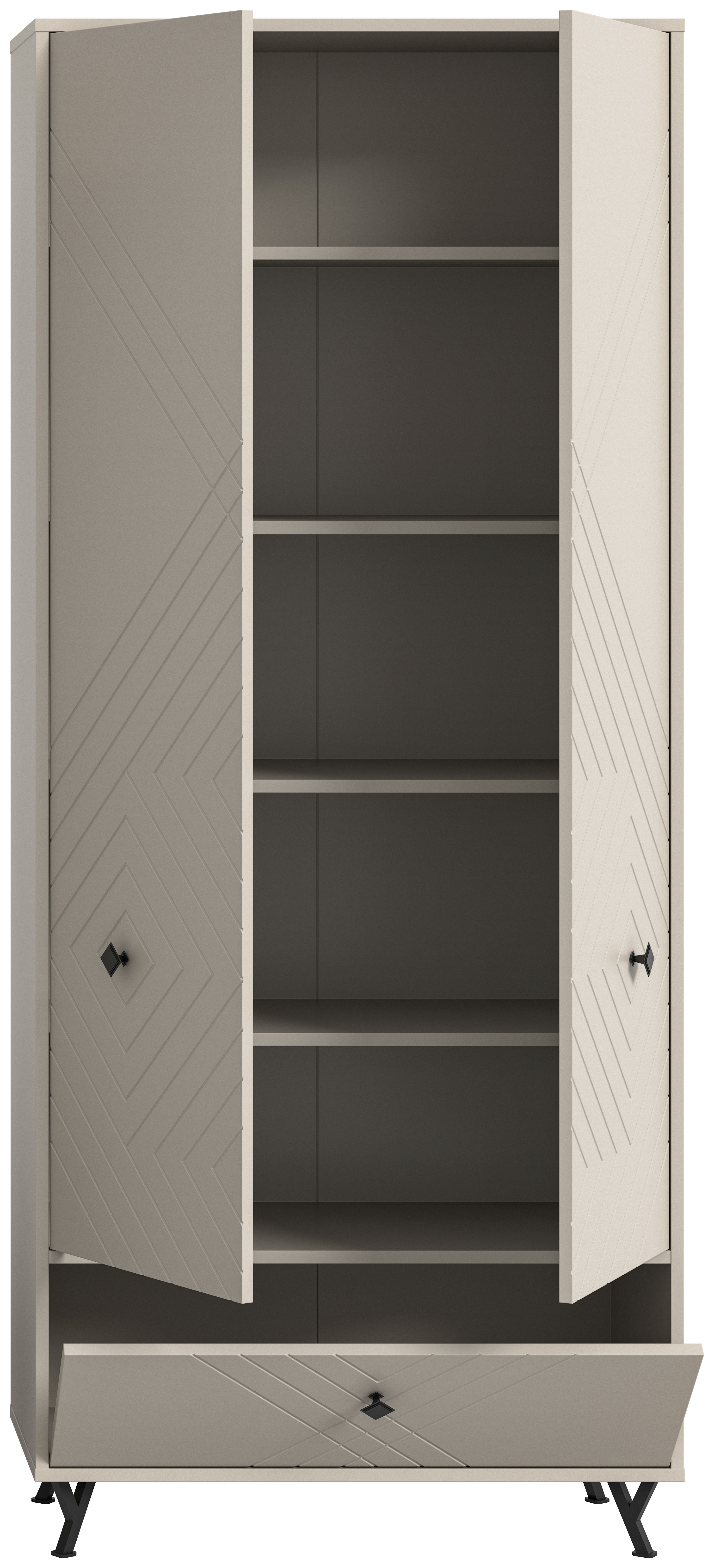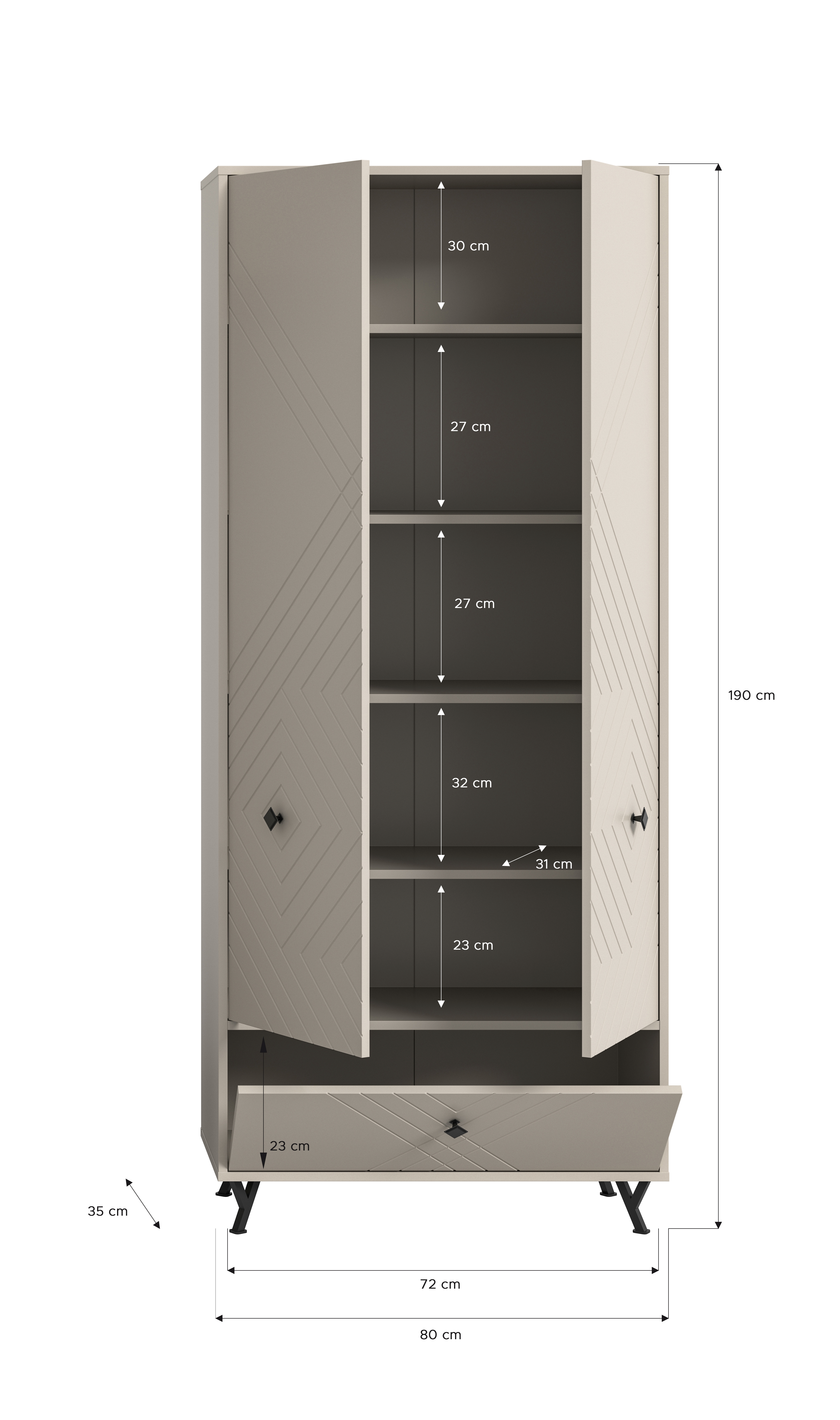 - Design/Stil: Der Garderobenschrank besticht durch sein zeitloses Design mit einer sandbeigen Melamin-Oberfläche und einem matt tiefgezogenen Finish. Die schlichte Eleganz und die klaren Linien verleihen dem Möbelstück eine moderne Ästhetik, die sich gut in verschiedene Einrichtungsstile einfügt und dem Raum ein harmonisches Ambiente verleiht.