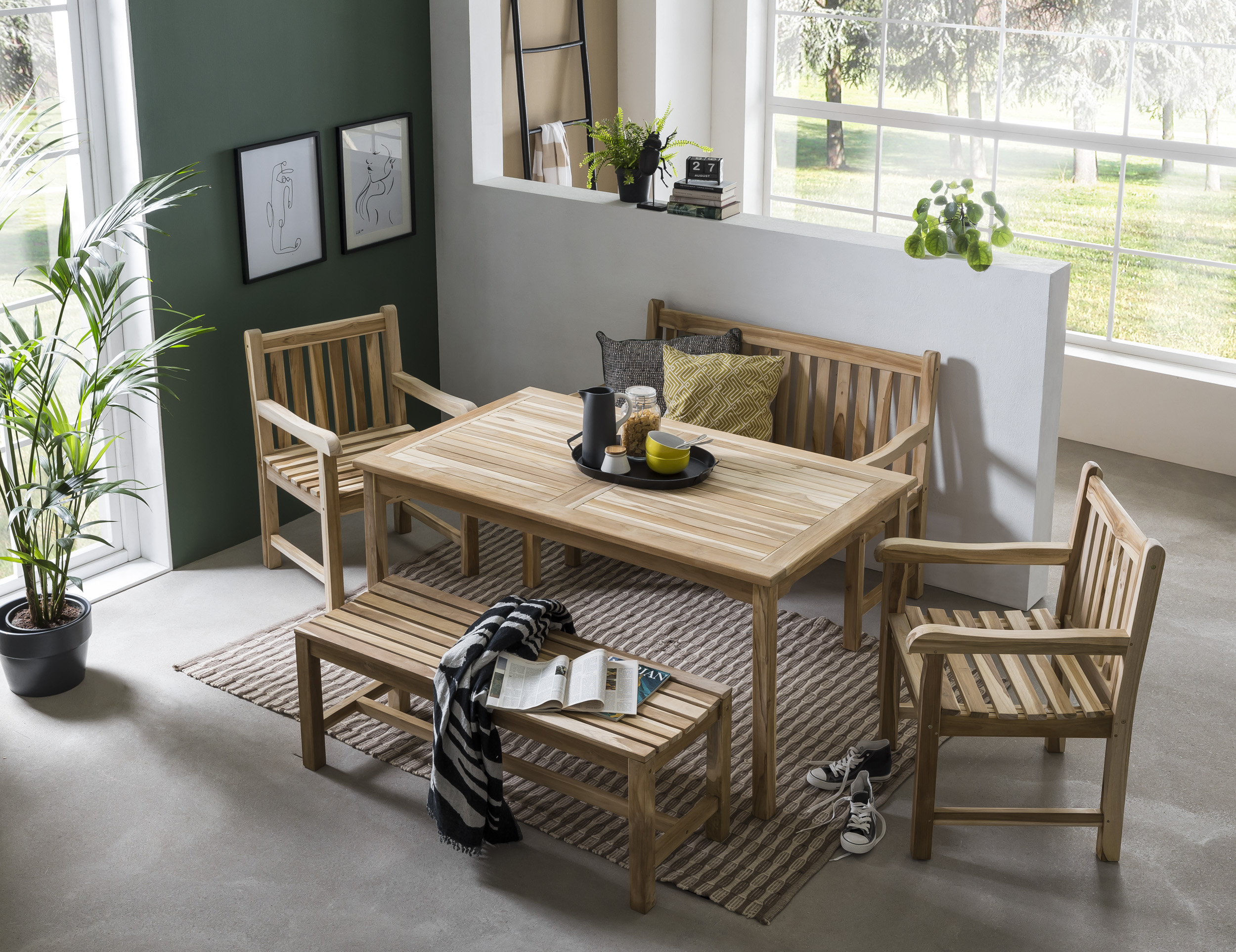 Dieses Möbel ist komplett naturbelassen, also nicht geölt oder lackiert, was mit der Zeit zu einer Vergrauung der Holzoberfläche führen wird. Wer es lieber „clean“ mag, der möge die Möbel mit handelsüblichem Teaköl (gibt es in jedem Baumarkt) gemäß Packungsbeilage pflegen.