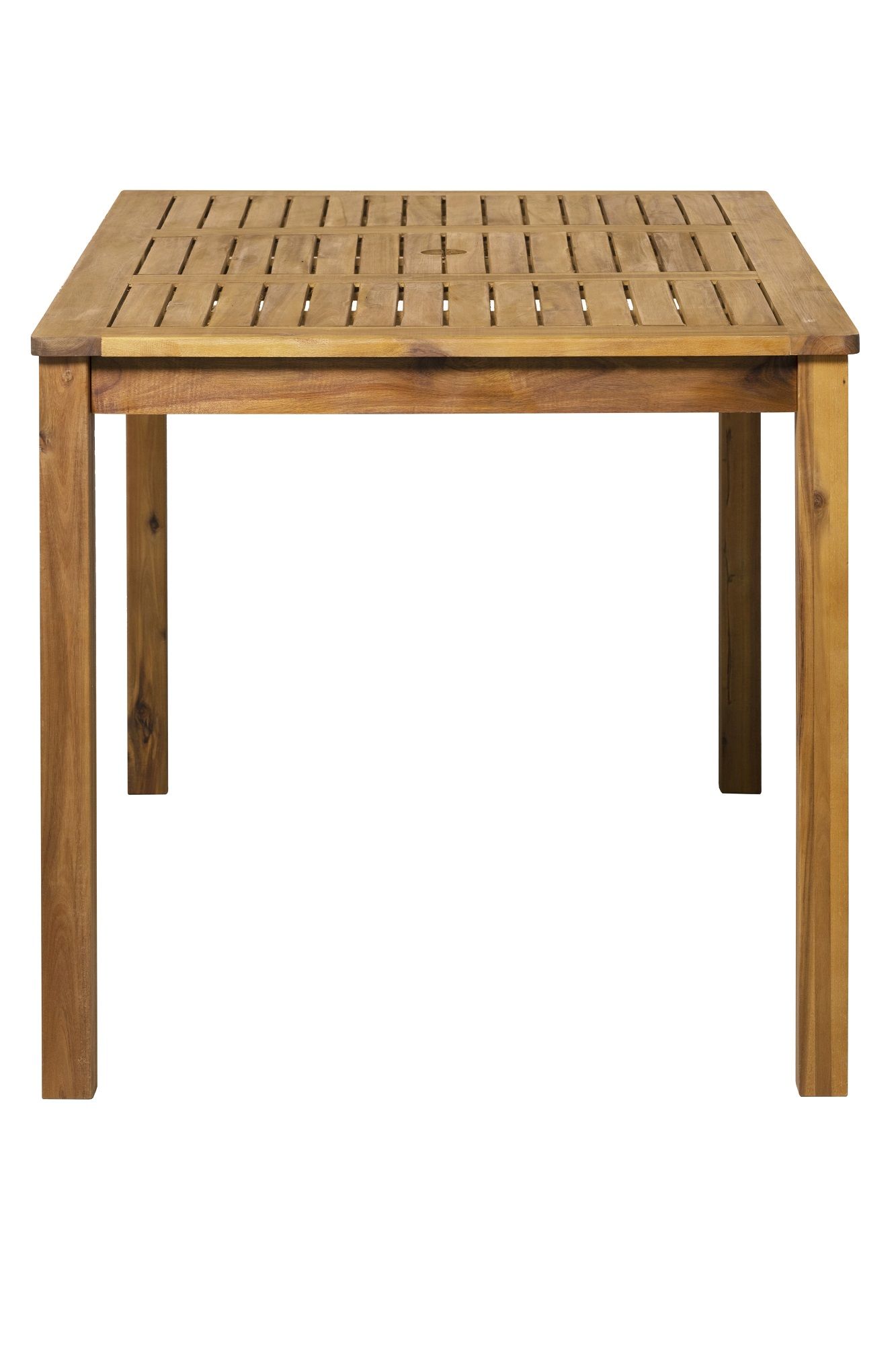 Dieser zeitlose Gartentisch mit praktischem Schirmloch in der Mitte der Tischplatte wird zum Blickfang in Ihrem Außenbereich. Gefertigt aus langlebigem und wetterbeständigem Akazienholz ist der Tisch optimal für die Verwendung im Outdoor-Bereich geeignet. Das Holz ist bereits vorgeölt, für ein besonders ansprechendes Finish. An dem Tisch finden komfortabel 4-6 Personen Platz, so dass geselligen Runden im Freien nichts mehr im Wege steht. Akazienholz ist ein besonderes Naturprodukt, welches durch elegante Holzmaserung und besondere Farbgebung begeistert. Jeder Gartentisch ist ein einzigartiges Unikat mit natürlichem Charme. Um den besonderen Farbton beizubehalten, sollte das Holz gelegentlich mit etwas Hartholz Pflege-Öl behandelt werden.