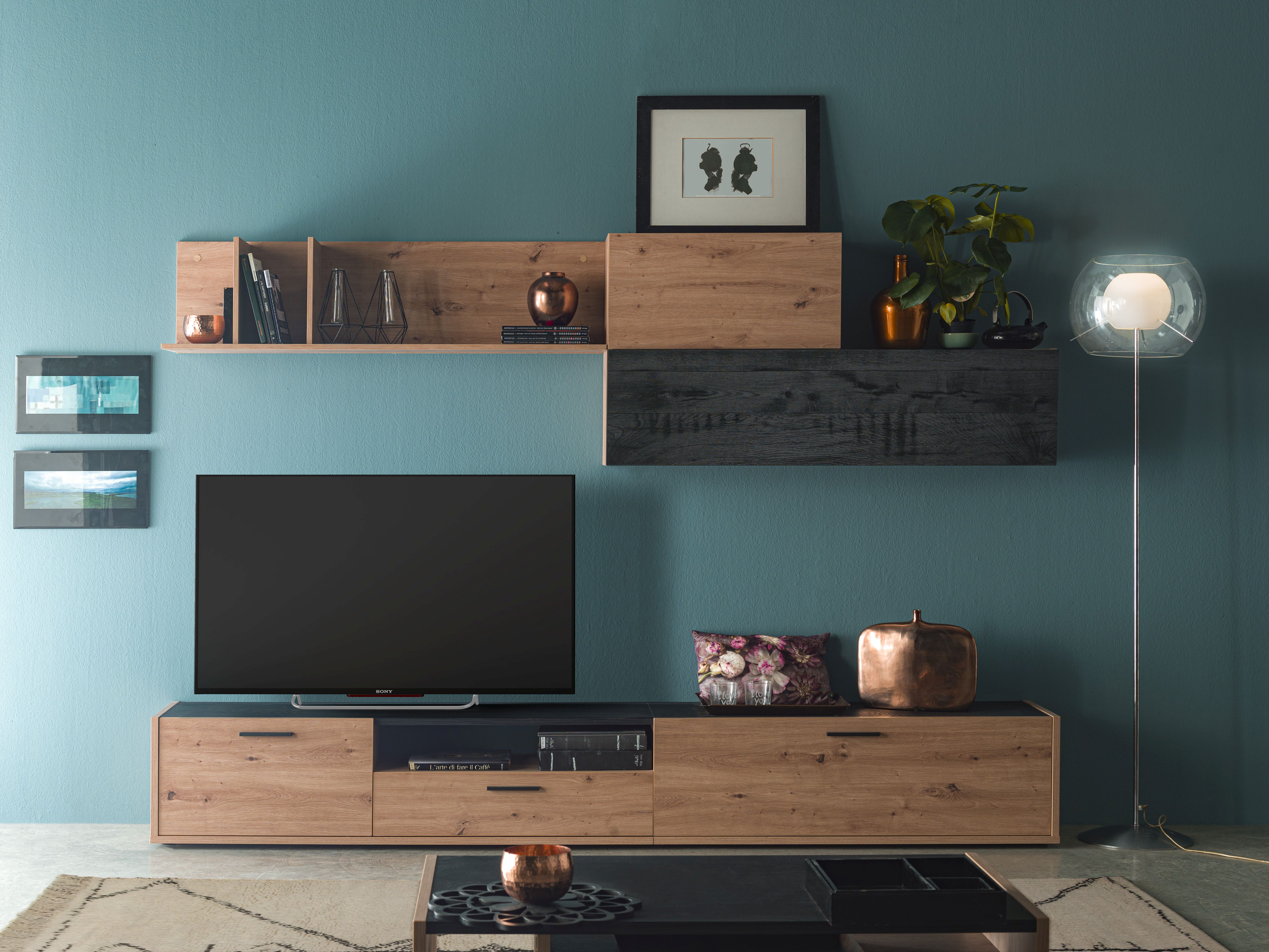 Eiche Artisan Holznachbildung kombiniert mit einer Klappe in Chalet schwarz Holznachbildung