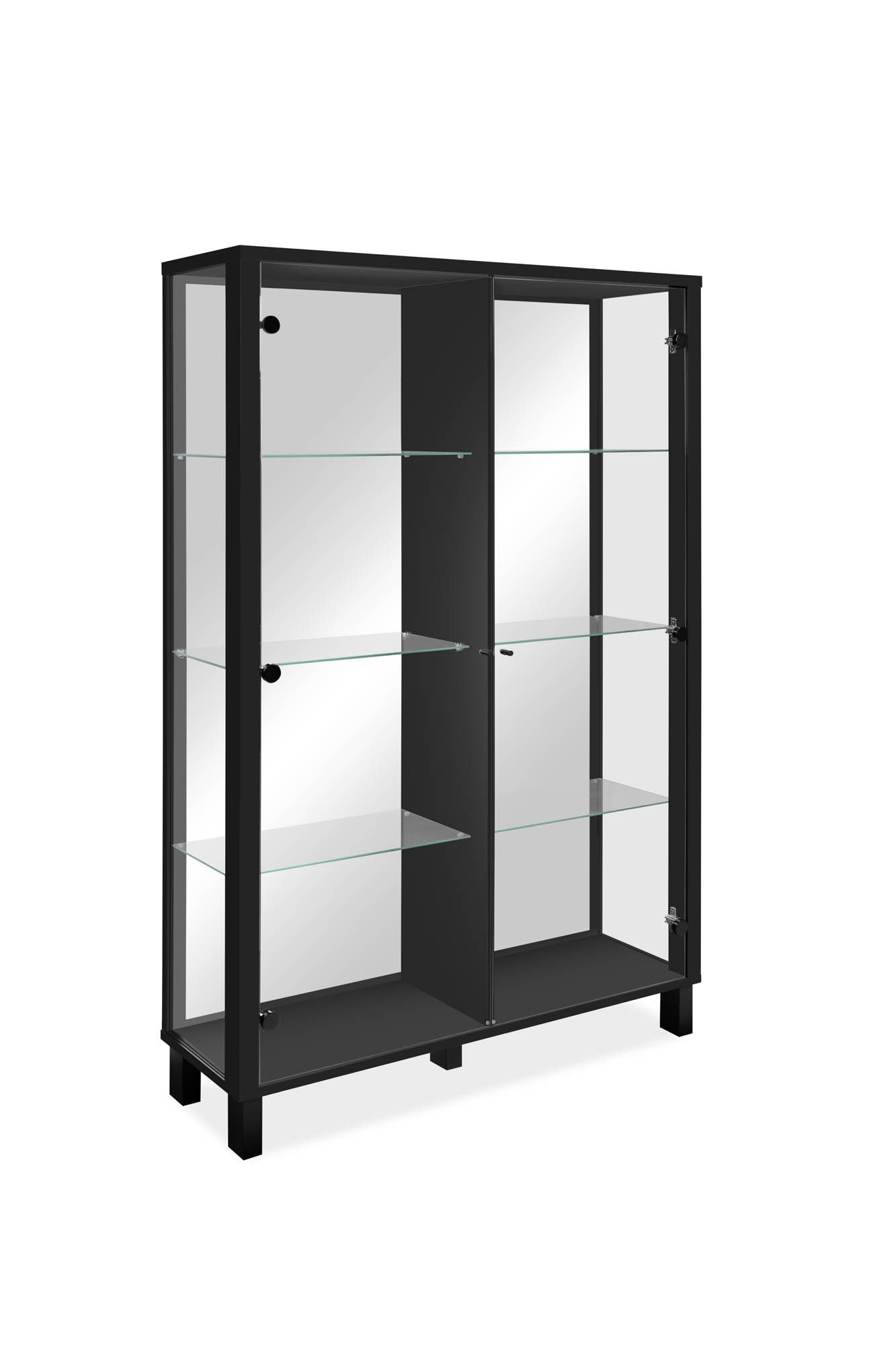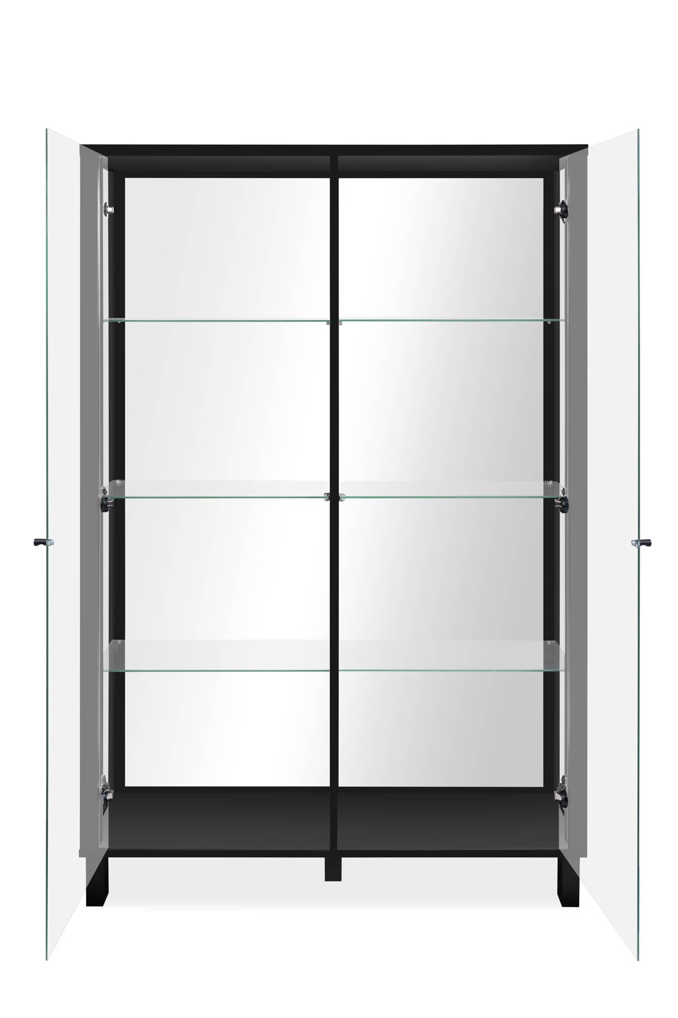 Schwarz kombiniert mit einer Spiegelrückwand und Seitenwänden und Türen aus Glas