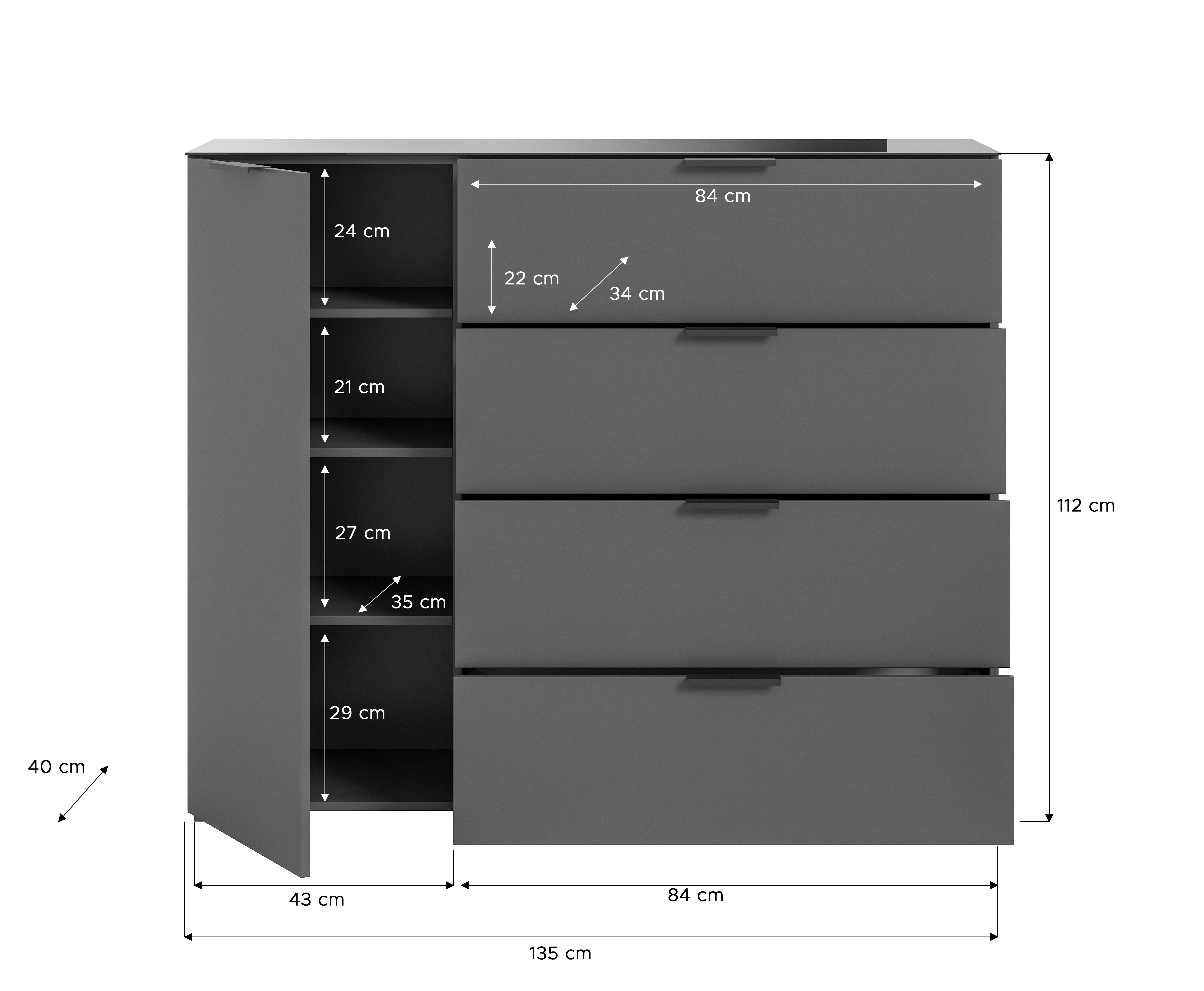 - Funktionalität: Mit Abmessungen von 135x112x40 cm bietet das Highboard ausreichend Stauraum für verschiedene Gegenstände wie Kleidung, Accessoires oder Wohnzubehör. Die Fächer ermöglichen eine praktische Organisation und Aufbewahrung von verschiedenen Utensilien, während die obere Ablagefläche zusätzlichen Platz für Dekorationen oder persönliche Gegenstände bietet.