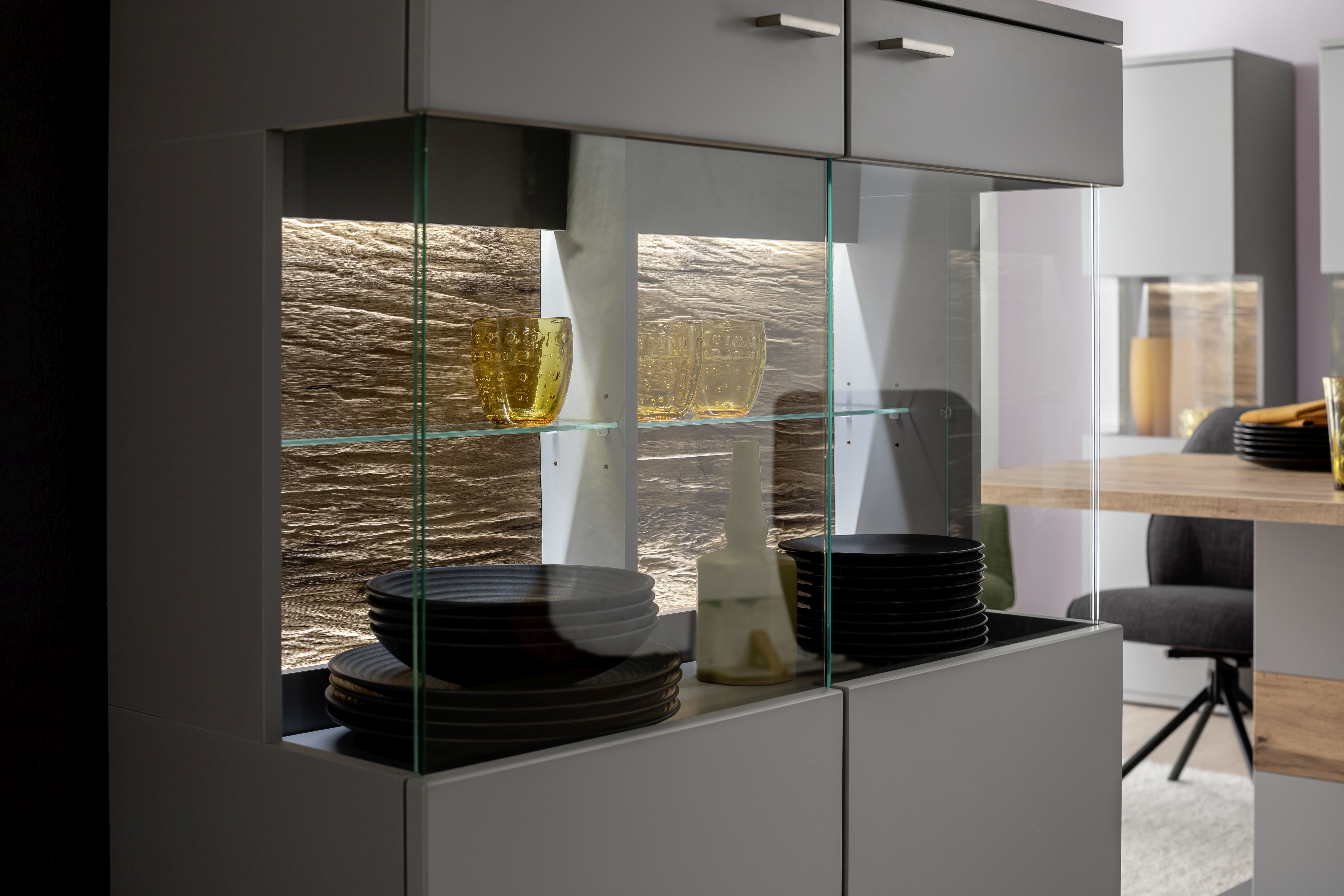 Rückwand sichtbar: 3D Wildeiche Holznachbildung sandgestrahlt