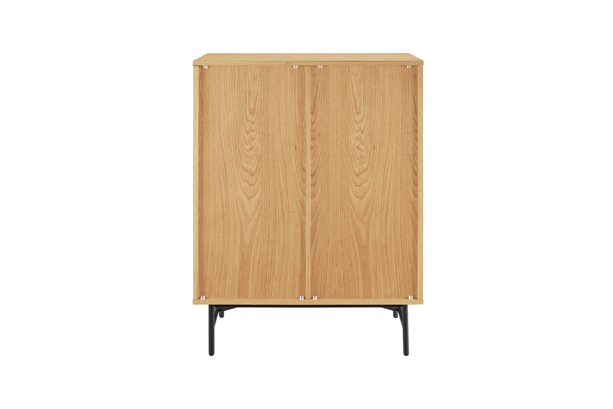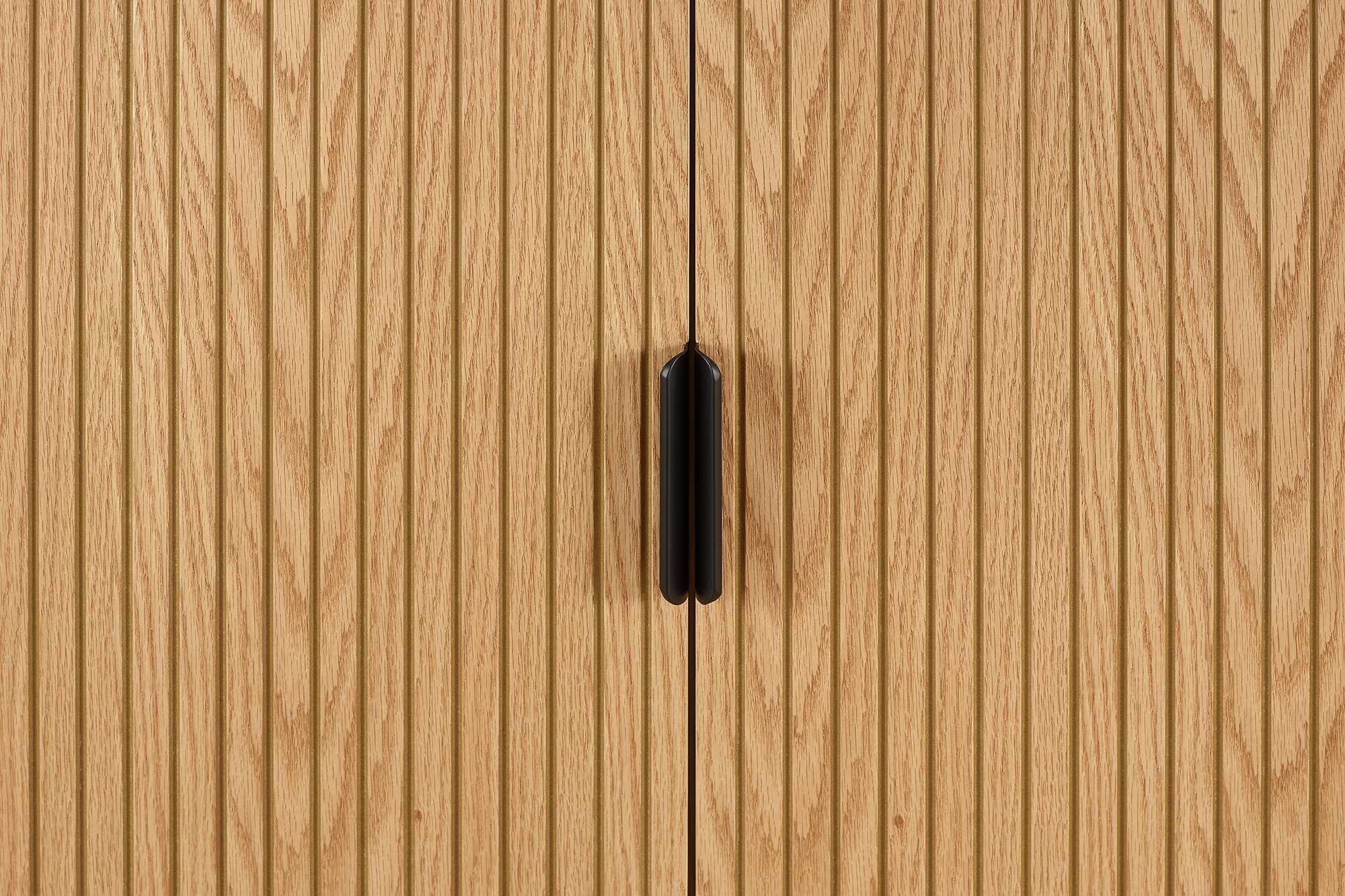 Helles Eiche Echtholzfurnier und hohe, schwarz lackierte Füße sorgen nicht nur für moderne Kontraste, sondern bringen auch den angesagten Scandi Style ins Eigenheim. Die kratzfeste PU-Lackierung auf dem Korpus des Möbels macht dieses besonders widerstandsfähig und langlebig, so dass Sie lange Freude an Ihrem Möbelstück haben. Das Gestell mit den filigranen Beinen sorgt für luftig-leichte Optik und einen modernen Loft-Charakter. Die Paneel-Optik des Eichenfurniers sorgt optisch für das gewisse Etwas. In dieser Kommode bieten 2 Türen mit 4 Regalböden geschlossenen Stauraum – für spielend leicht mehr Ordnung im Wohnbereich.