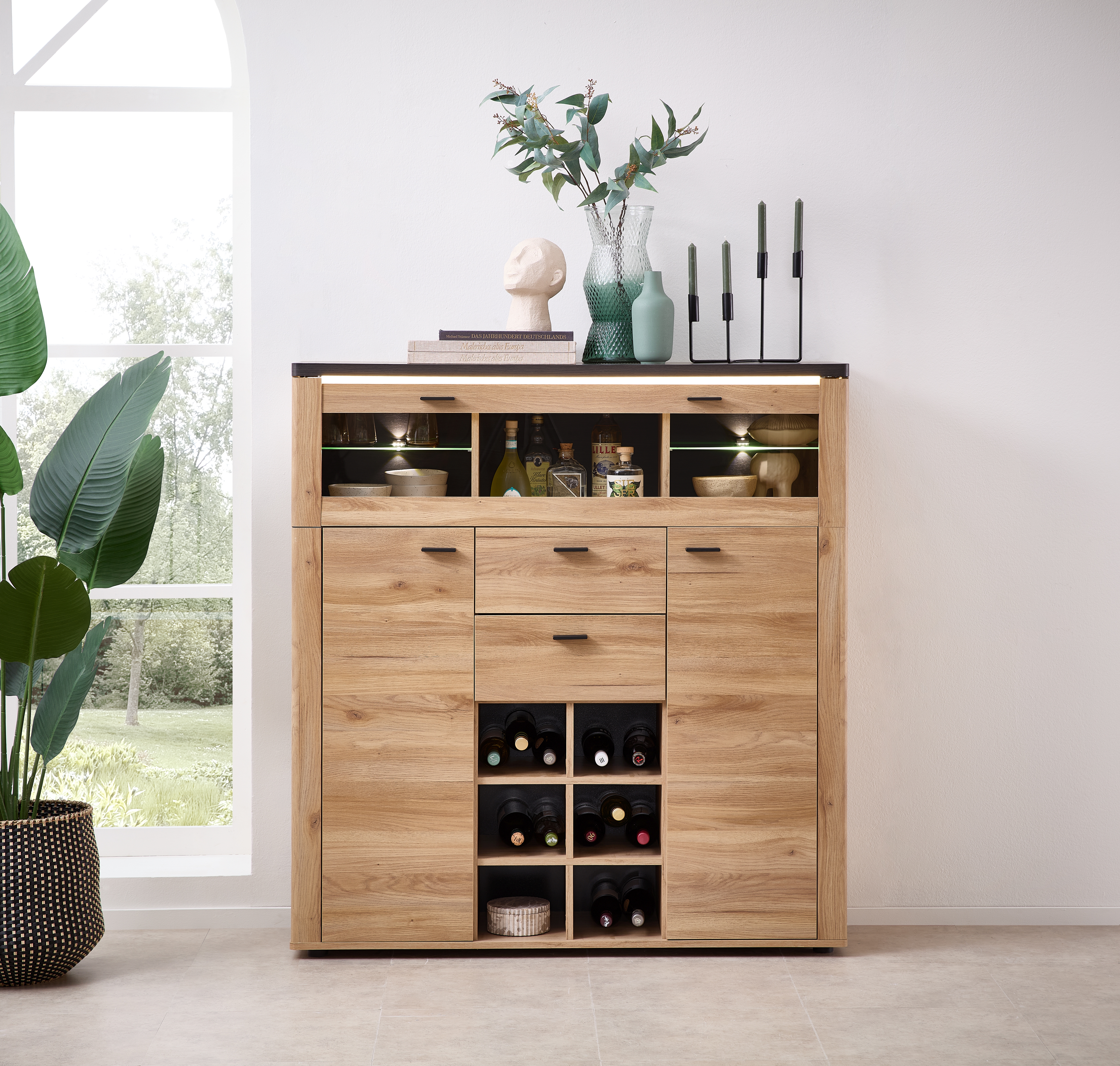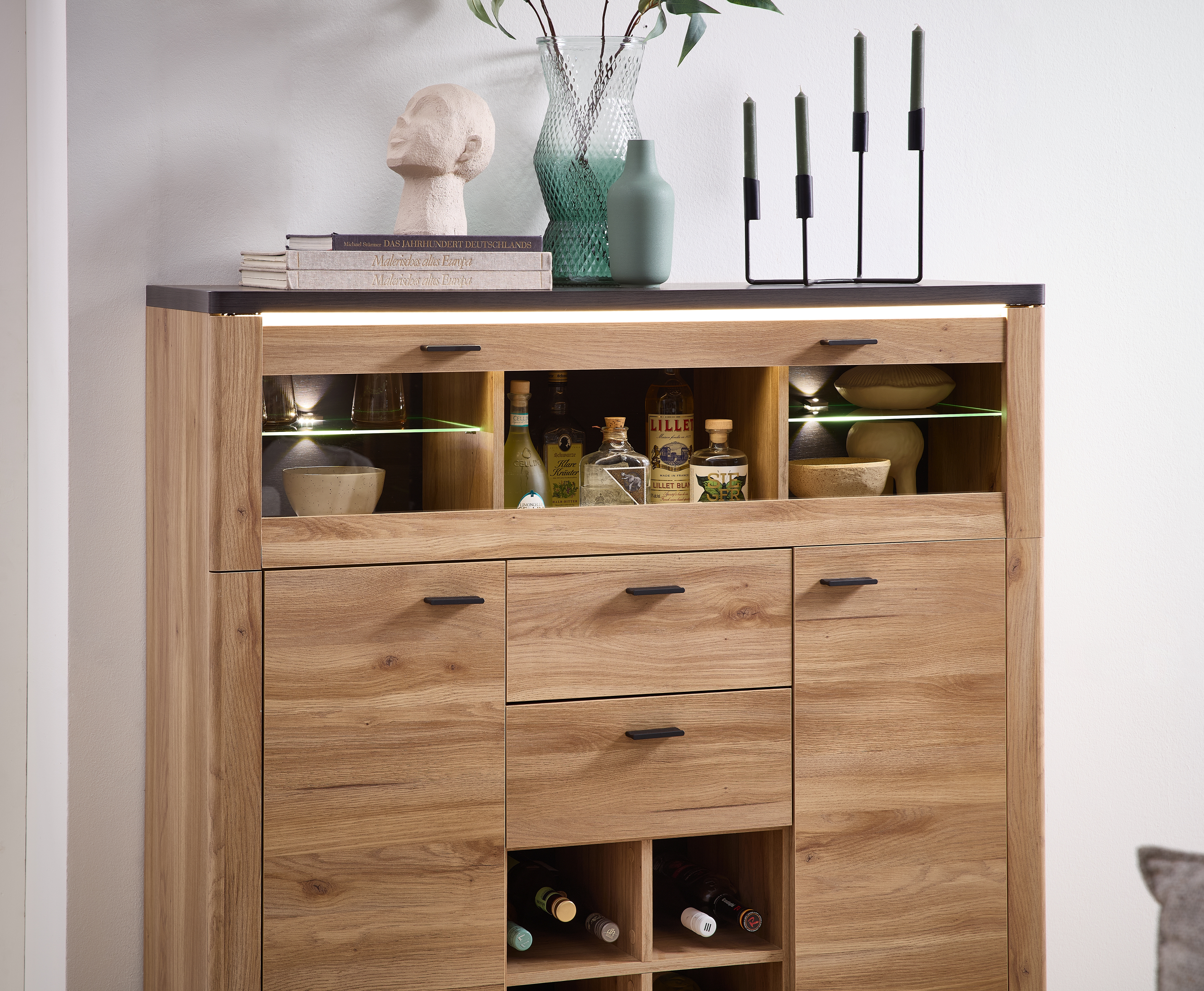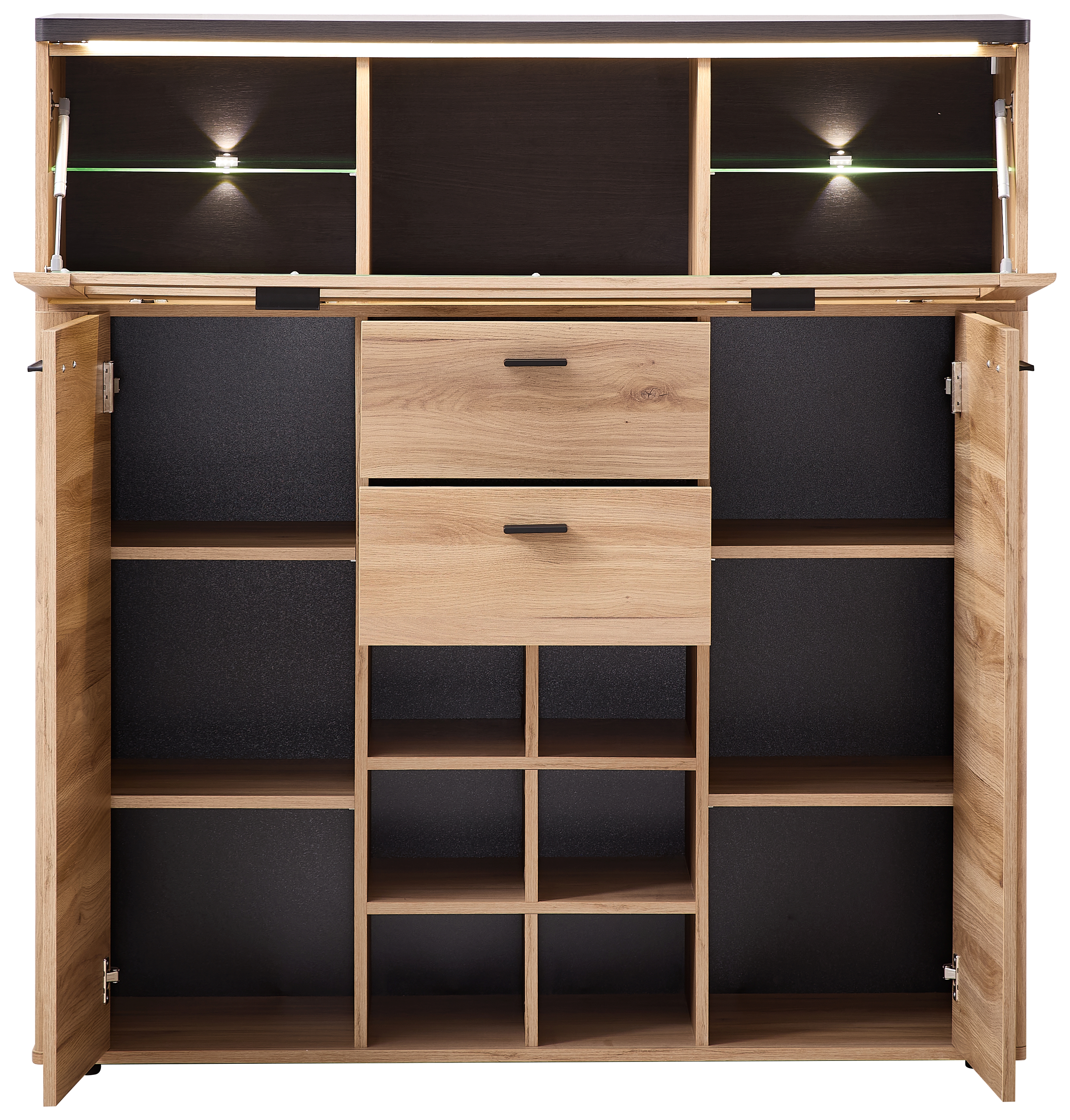 | Ausstattung Kommoden Phono Büro Regal: | Klappe(n), Offene Fächer, Schublade(n), Türe(n), inkl. Beleuchtung | ||