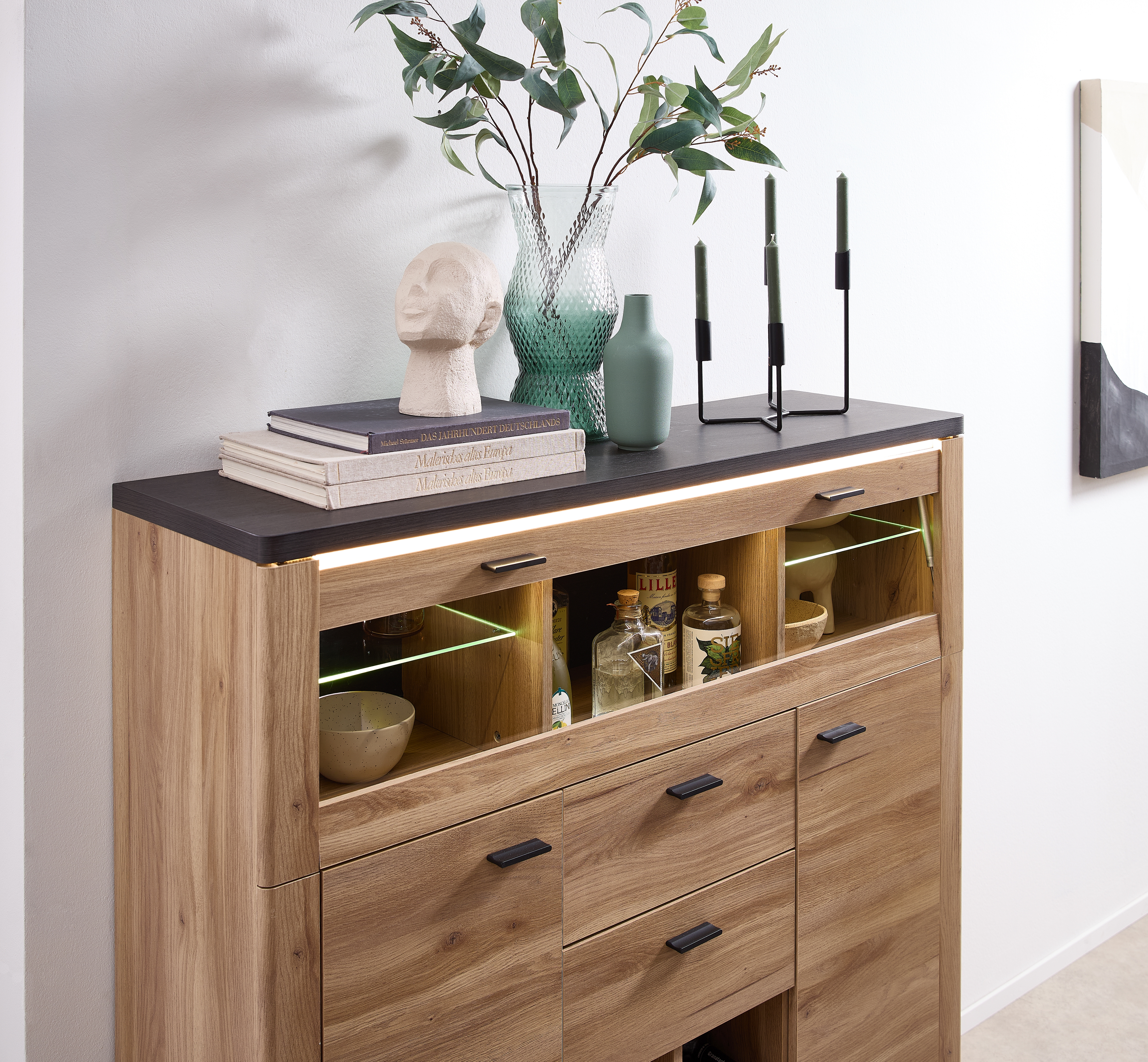 Korpus: Mauvella Eiche Holznachbildung kombiniert mit Absetzungen in Carbon Eiche dunkel Holznachbildung