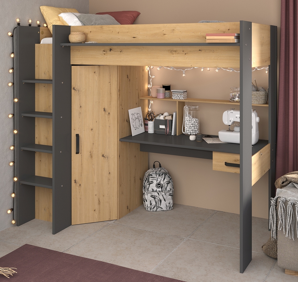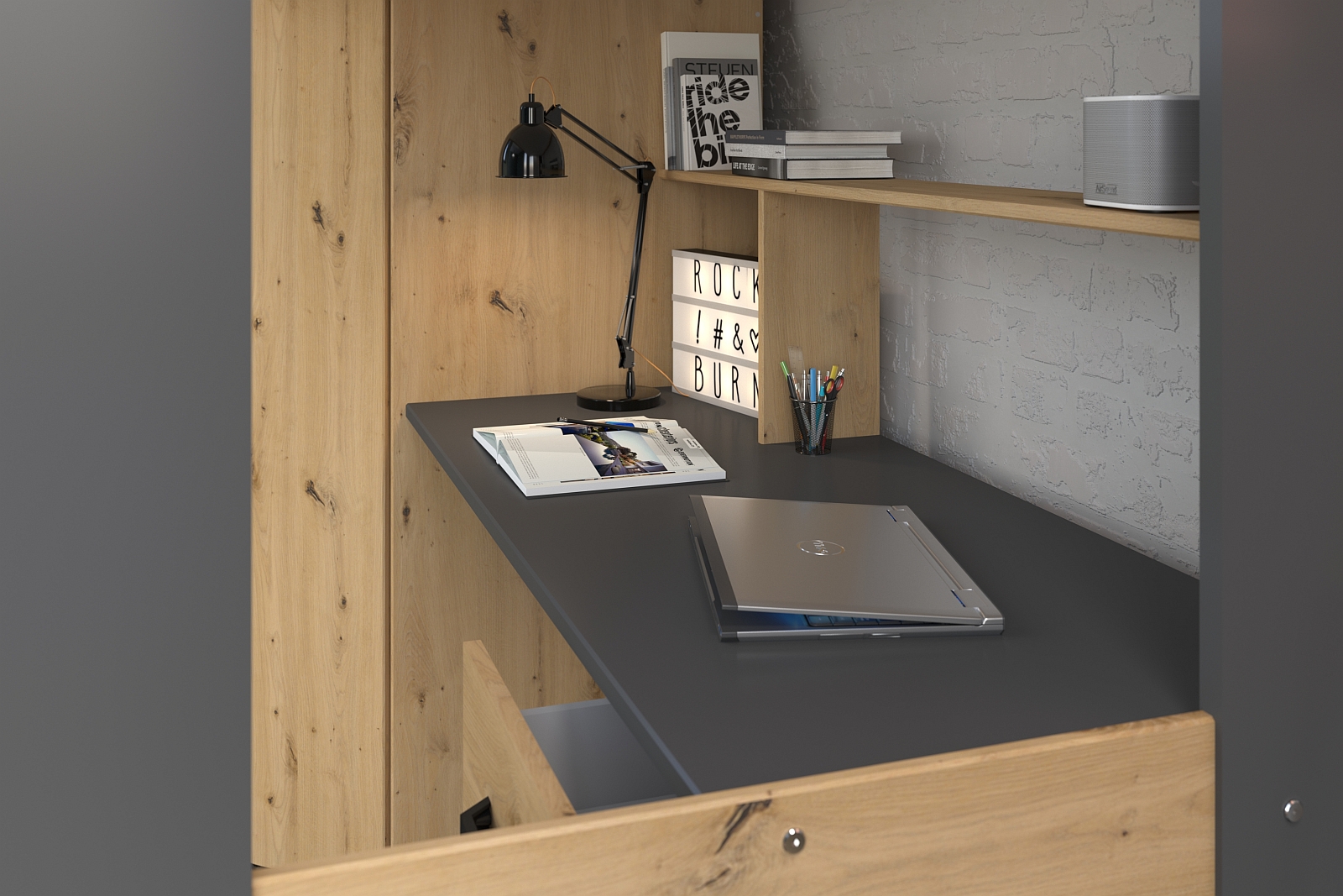 1 integrierter Schreibtisch (rechts unterhalb der Liegefläche) mit 1 großer Arbeitsfläche, Ablageflächen und 1 Schubkasten