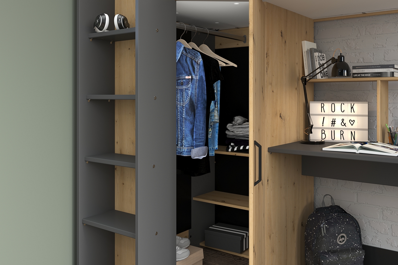 1 integrierter Kleiderschrank (links unterhalb der Liegefläche) mit 3 Fächer und 1 Kleiderstange