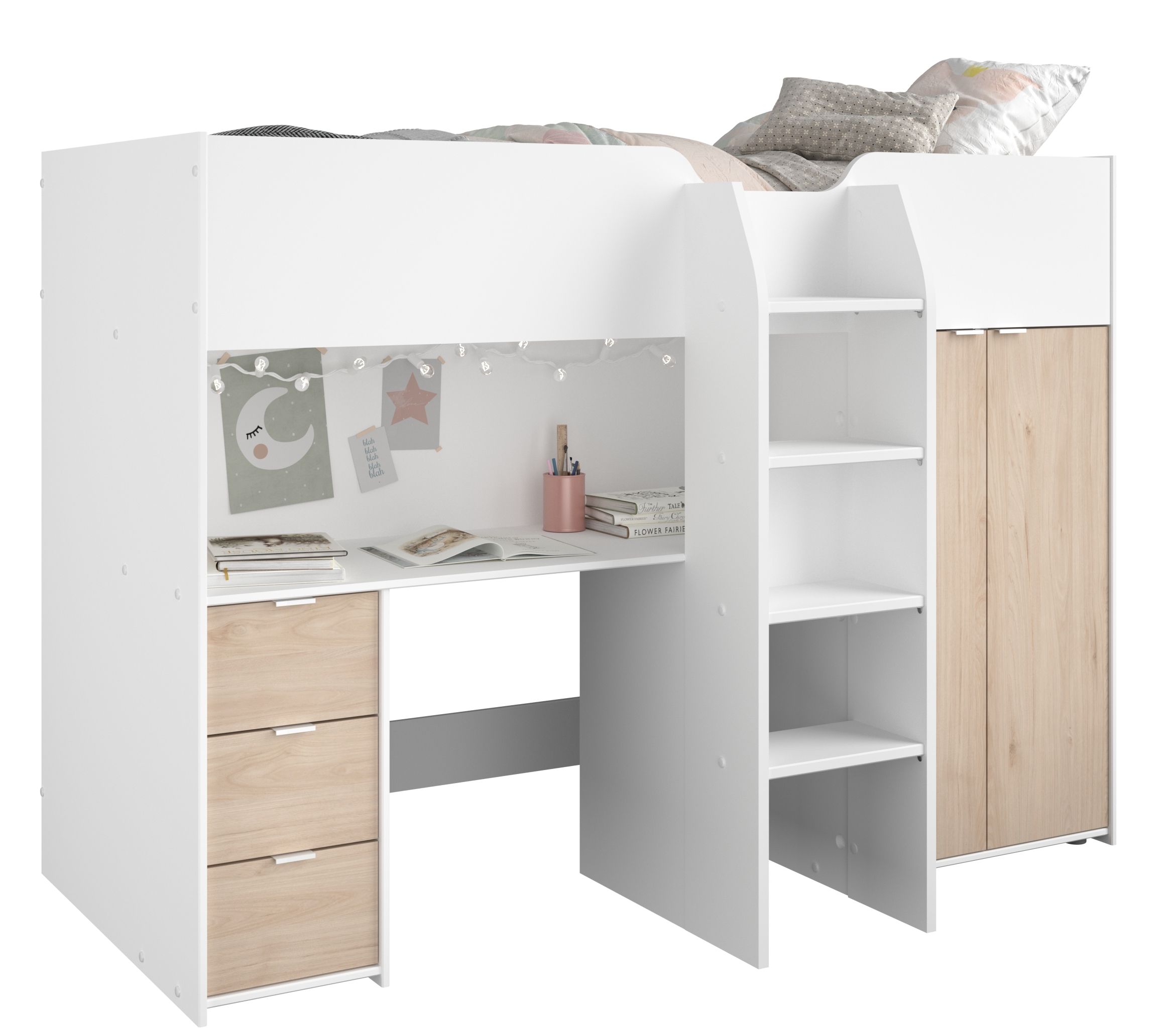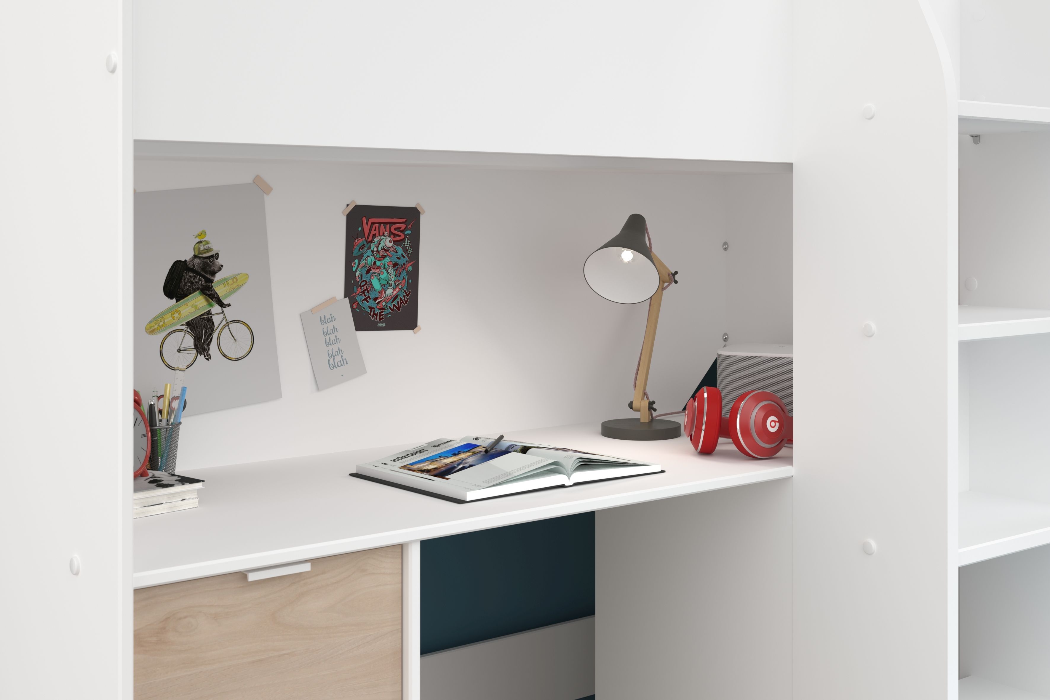 1 integrierter Schreibtisch (links unterhalb der Liegefläche) mit 1 großen Arbeitsfläche, Kabeldurchlass und 3 Schubkästen