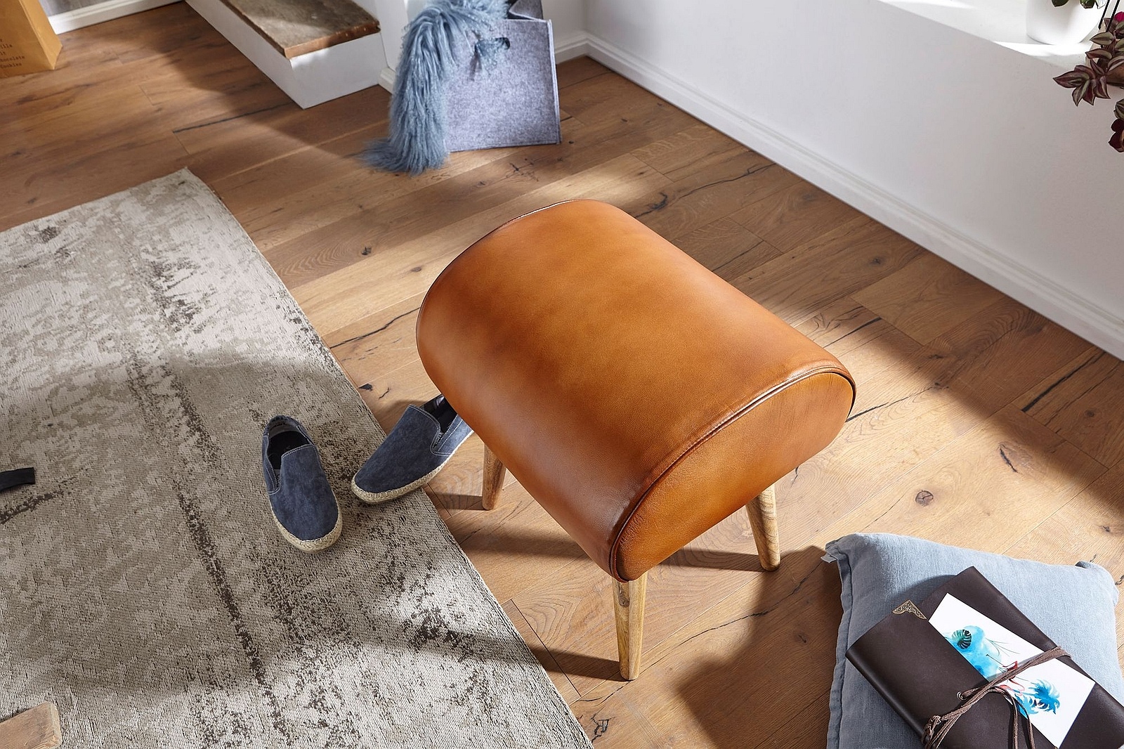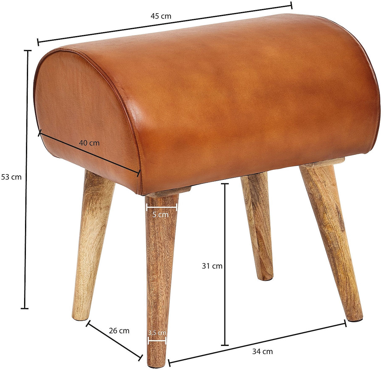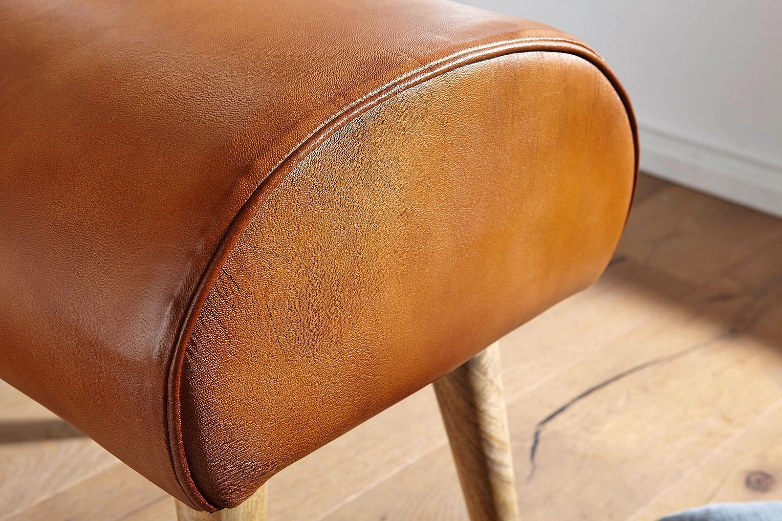 - MATERIAL ✔ Der Sitzflächenbezug besteht aus Echtleder. Die Standfüße sind aus massivem Mango-Holz gefertigt und mit einem klaren Schutzlack versiegelt.