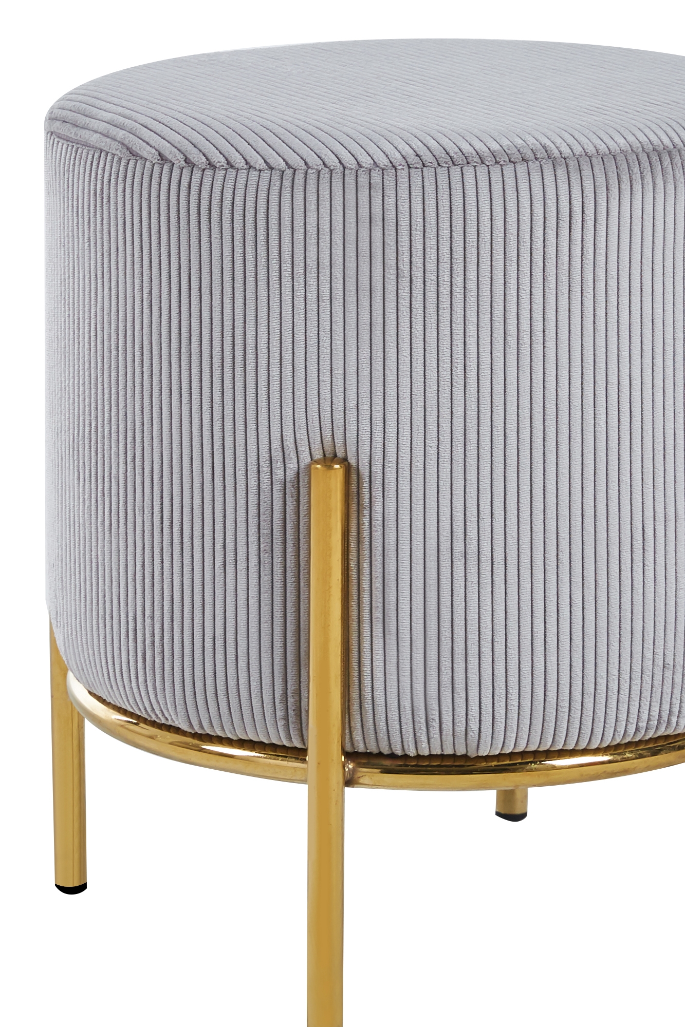 Wenn sich spontan Gäste ankündigen, sind zusätzliche Sitzgelegenheiten immer ein willkommener Segen. Wenn diese dann auch noch stylisch aussieht und platzsparend Nutzen schafft, dann hat man einen idealen Design-Kompagnon für Sofa und Sitzecke. Der Hocker in Cord-Optik mit einem Durchmesser der Sitzfläche von 35 cm bietet genau diese Kombination aus ansprechender Optik und funktionalem Nutzen. Hier können Sie zusätzliche Gäste platzieren oder aber ganz entspannt die Füße hochlegen. Der weiche Cord-Stoff verleiht dem Sitzhocker einen modernen Look und sorgt mit seinen charakteristischen Nähten für eine interessante Optik. Das Design-Gestell mit hohen Füßen besteht aus goldfarbenem Metall und rundet den Look ab.
