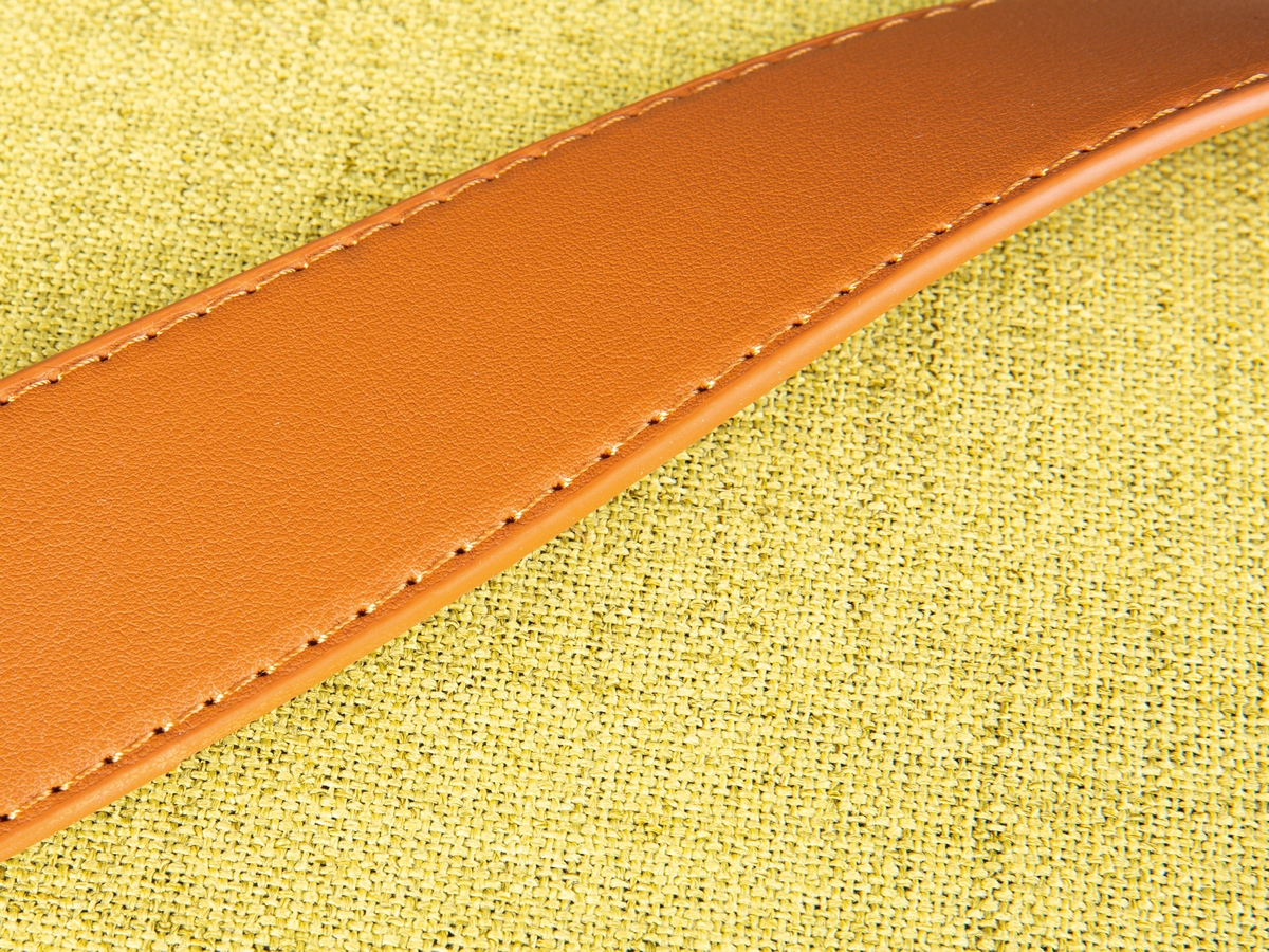 Der Hocker ist platzsparend und leicht und lässt sich dank seines camelfarbenen Tragegurts mühelos transportieren.
