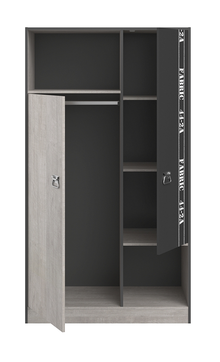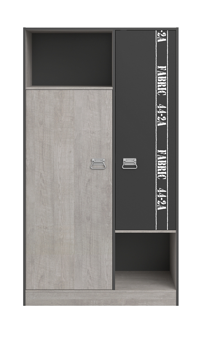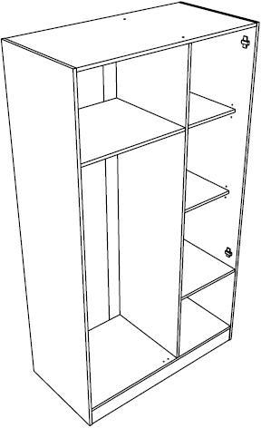 links: 1 großes offenes Fach oben, darunter 1 Tür, dahinter 1 Kleiderstange