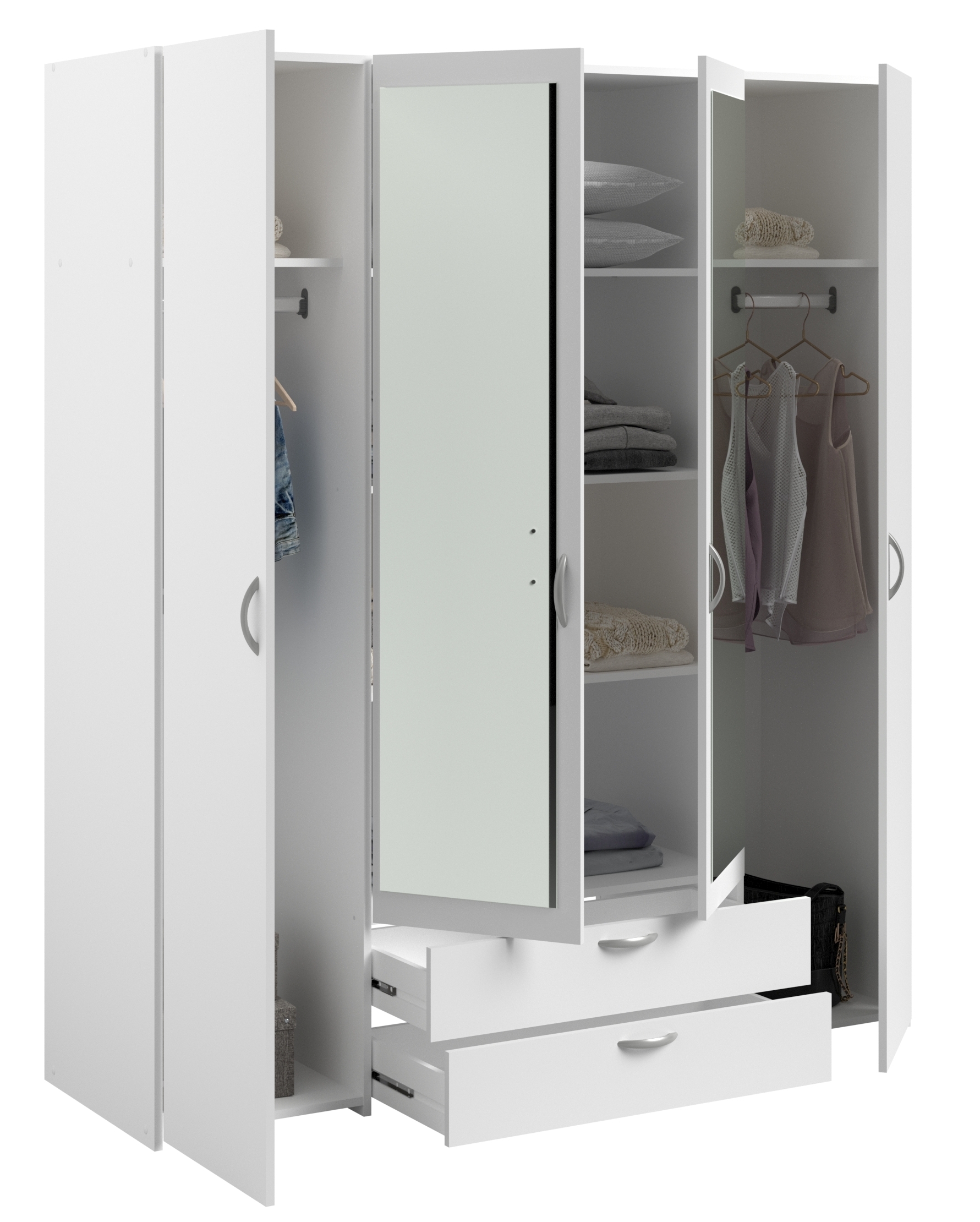 mittig: 2 Türen mit Spiegel, dahinter 4 durchgehende Fächer