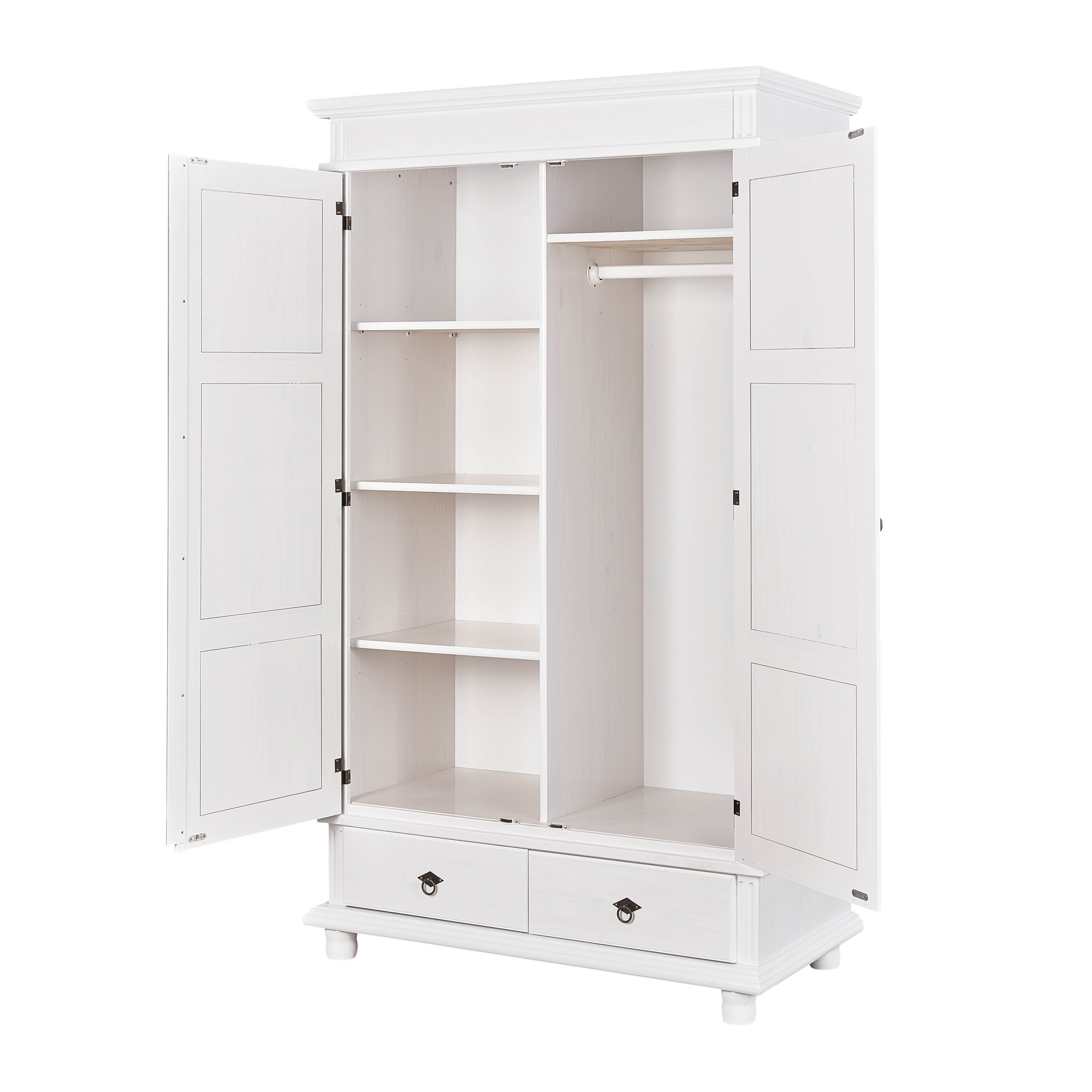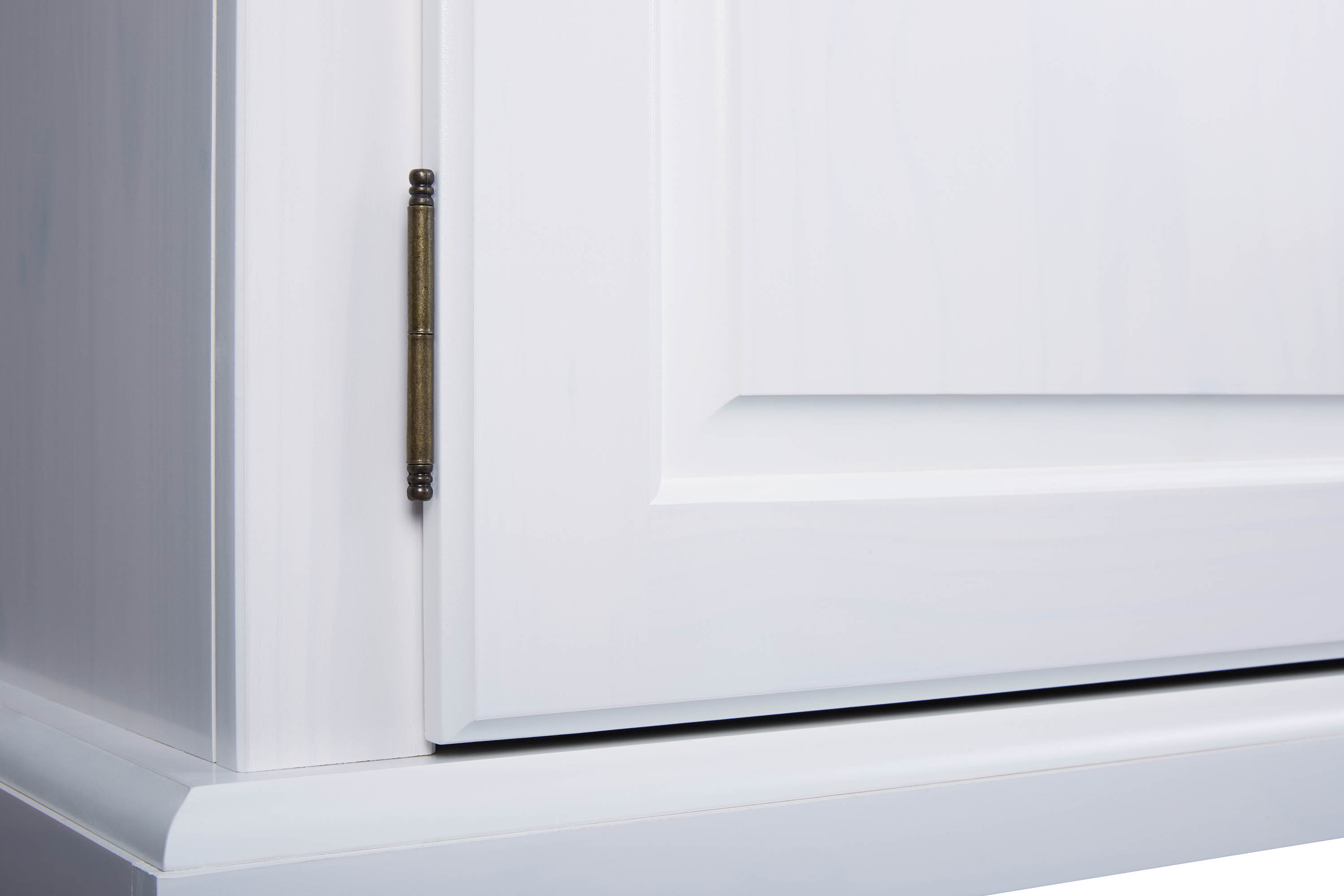 Die weiße Lackierung des 2-türigen Schranks lässt die natürlichen Massivholzmaserungen elegant durchscheinen, was ihm eine charmante, natürliche Optik verleiht.