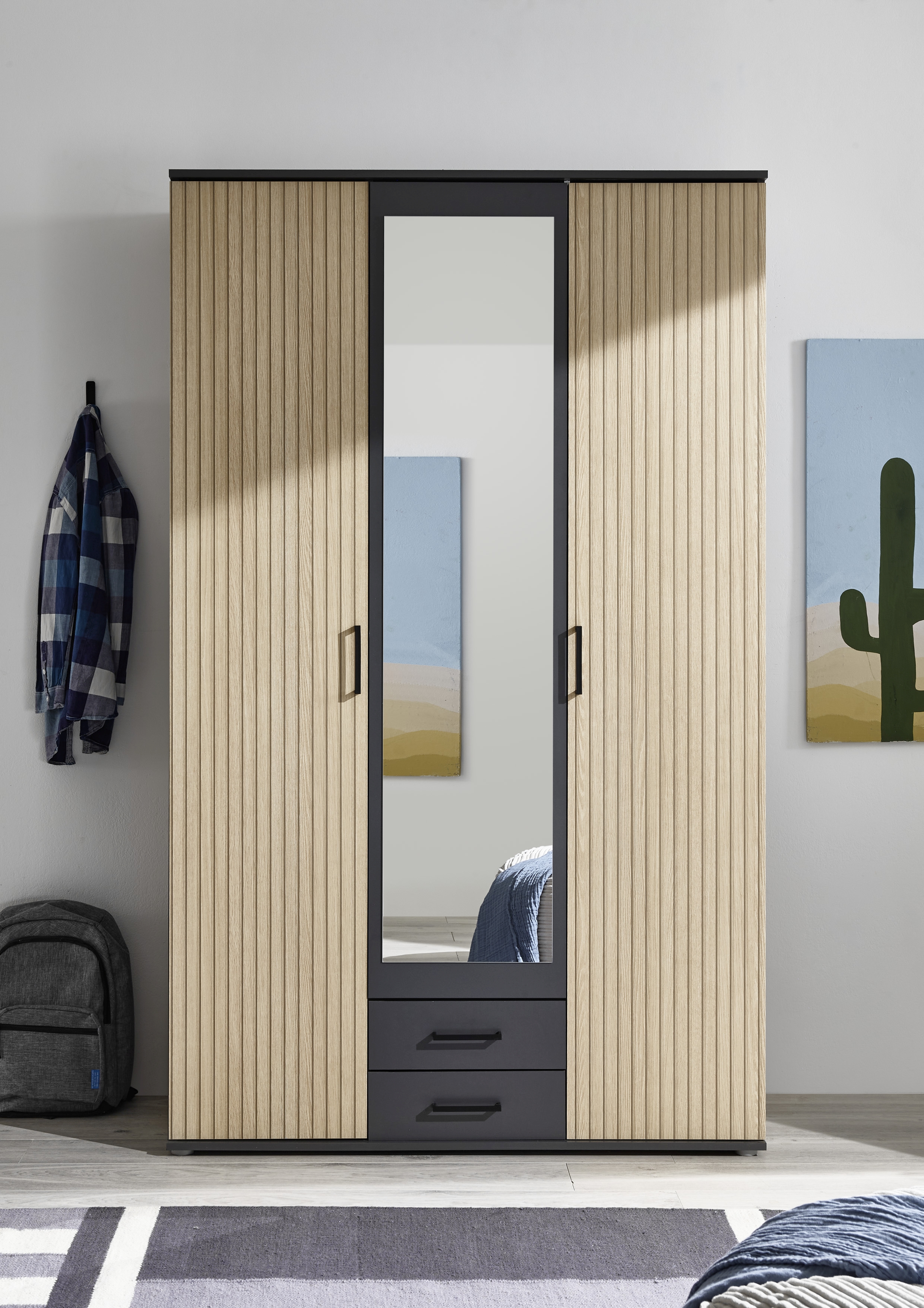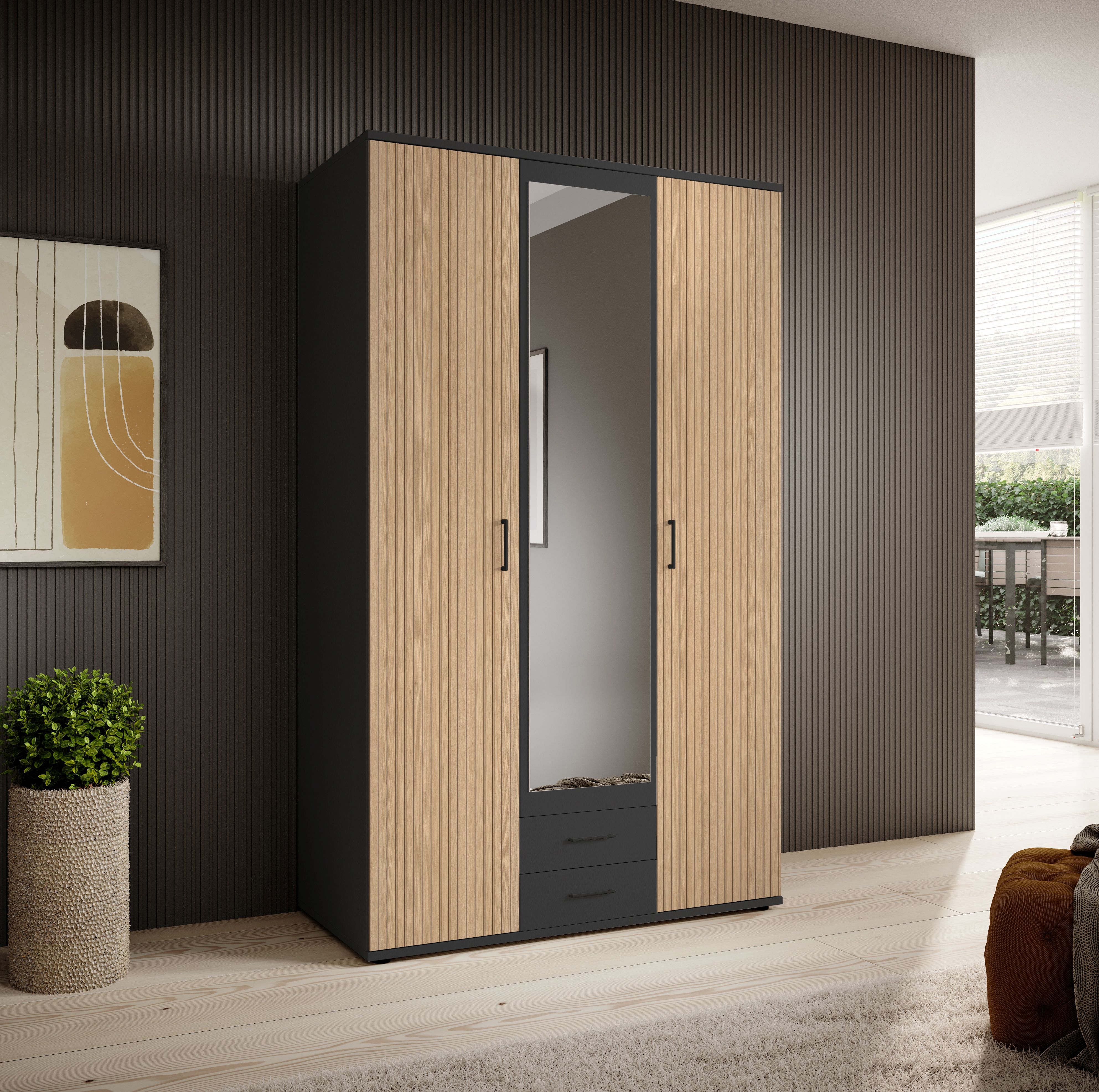 Graphit mit Türfronten in Eiche Lamelle Holznachbildung, Melaminbeschichtung / Spiegel