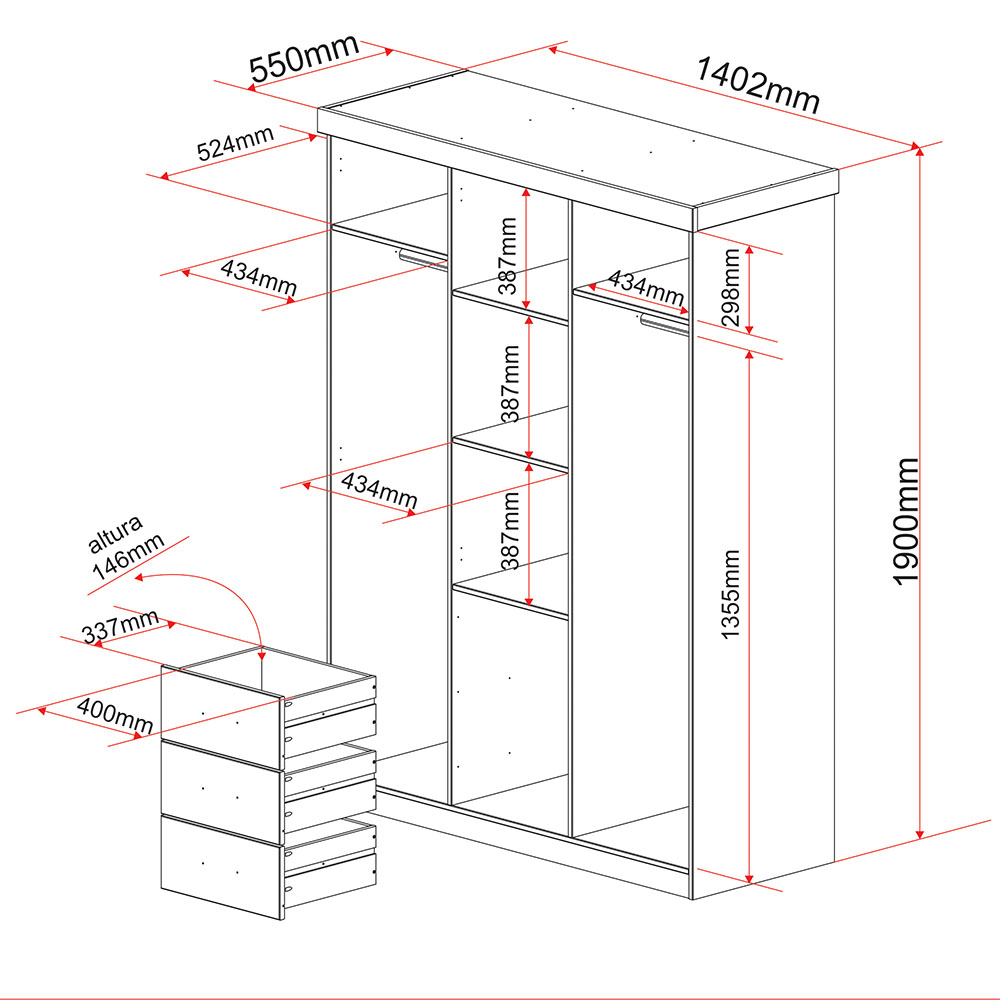- Großer Schrank mit drei Türen, drei Schubladen und einem Spiegel. Dieser Schrank bietet dank seiner Inneneinteilung jede Menge Platz für Kleidung und Accessoires.