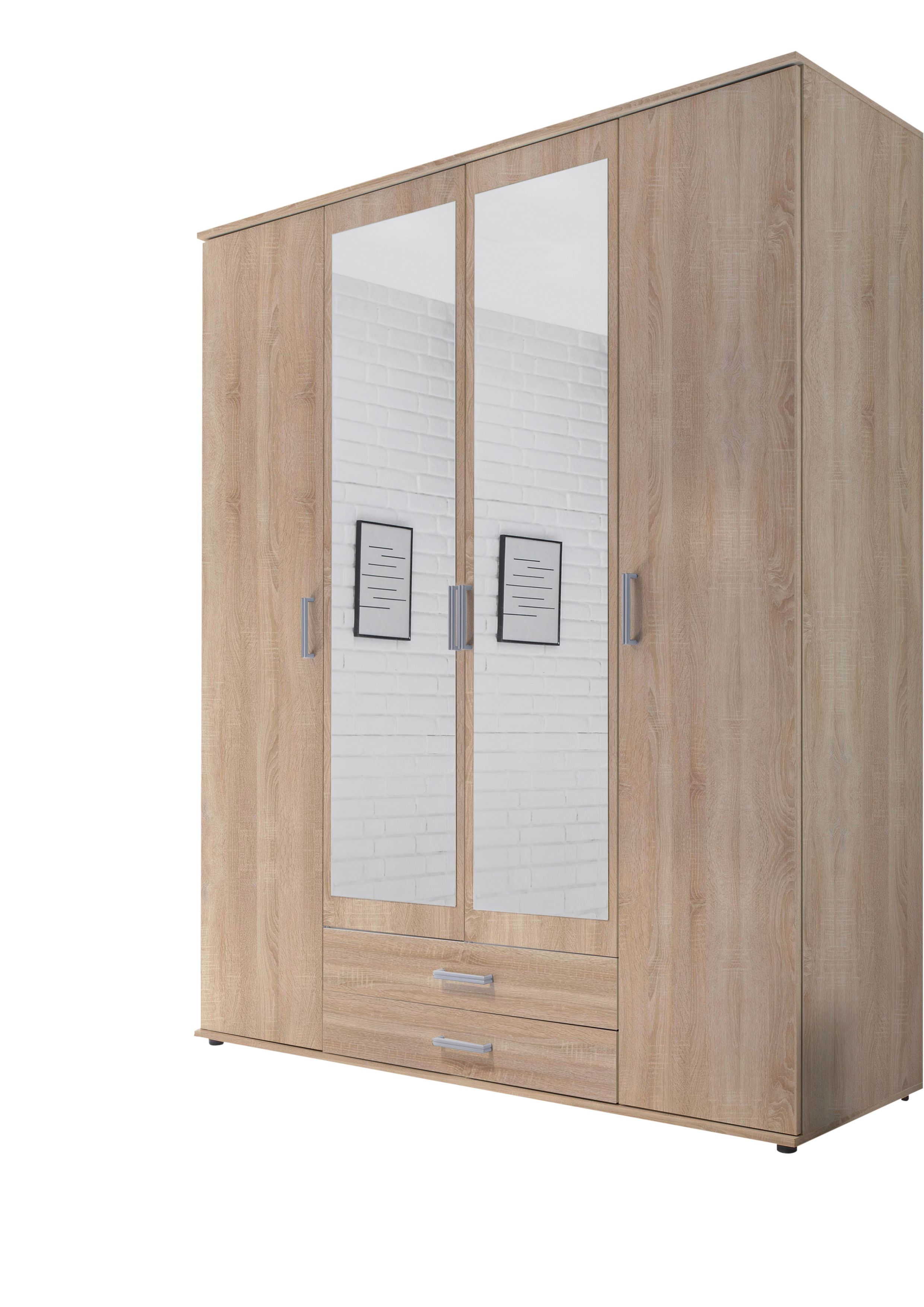 KARL Eleganter Kleiderschrank 4-türig mit viel Stauraum - Vielseitiger Drehtürenschrank in Eiche Sonoma Optik mit Spiegeltüren - 160 x 196 x 54 cm (B/H/T)