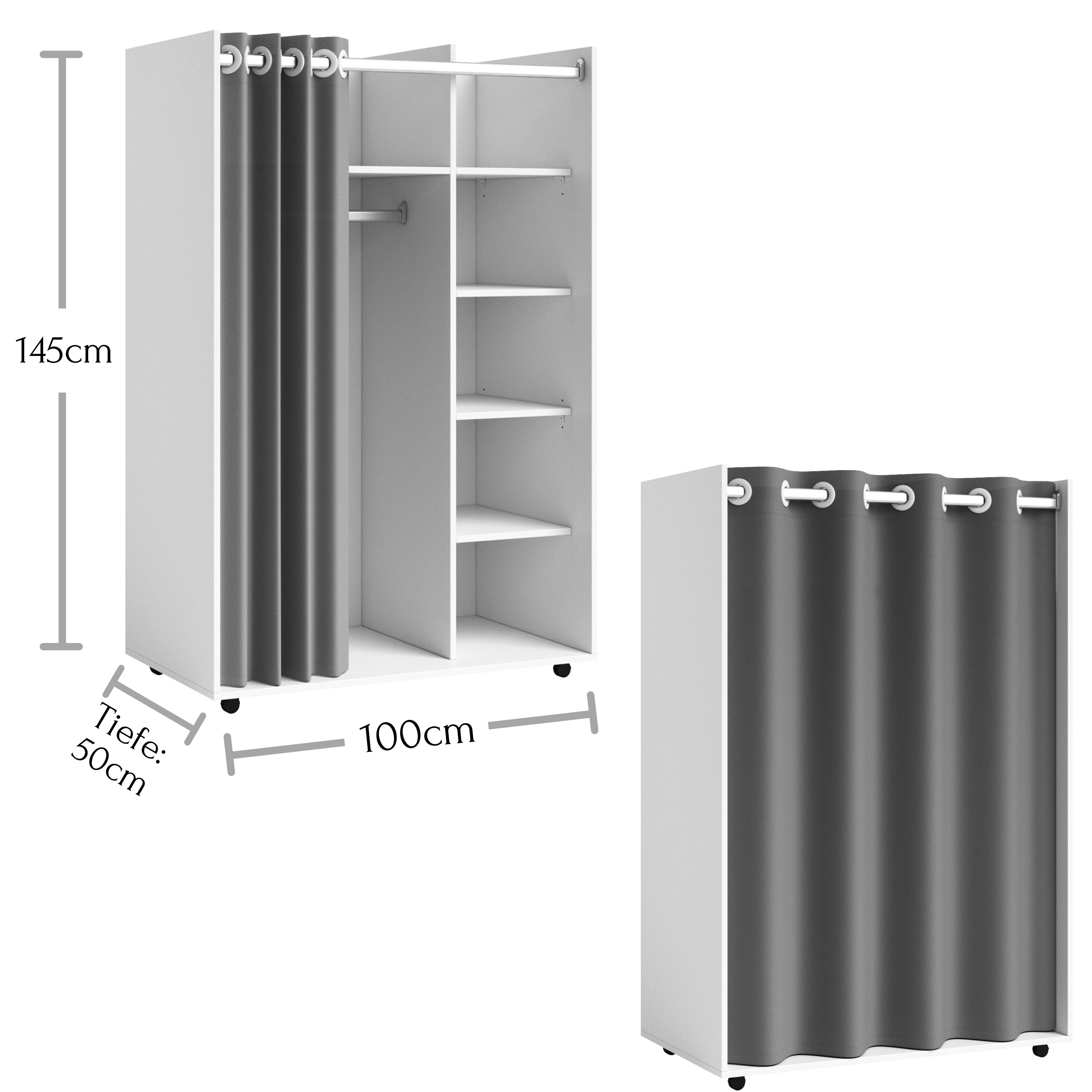JENKE Mobiler Kleiderschrank auf Rollen, Weiß mit Stoffvorhang - Vielseitiger Allzweckschrank mit cleverer Inneneinteilung - 100 x 145 x 50 cm (B/H/T)