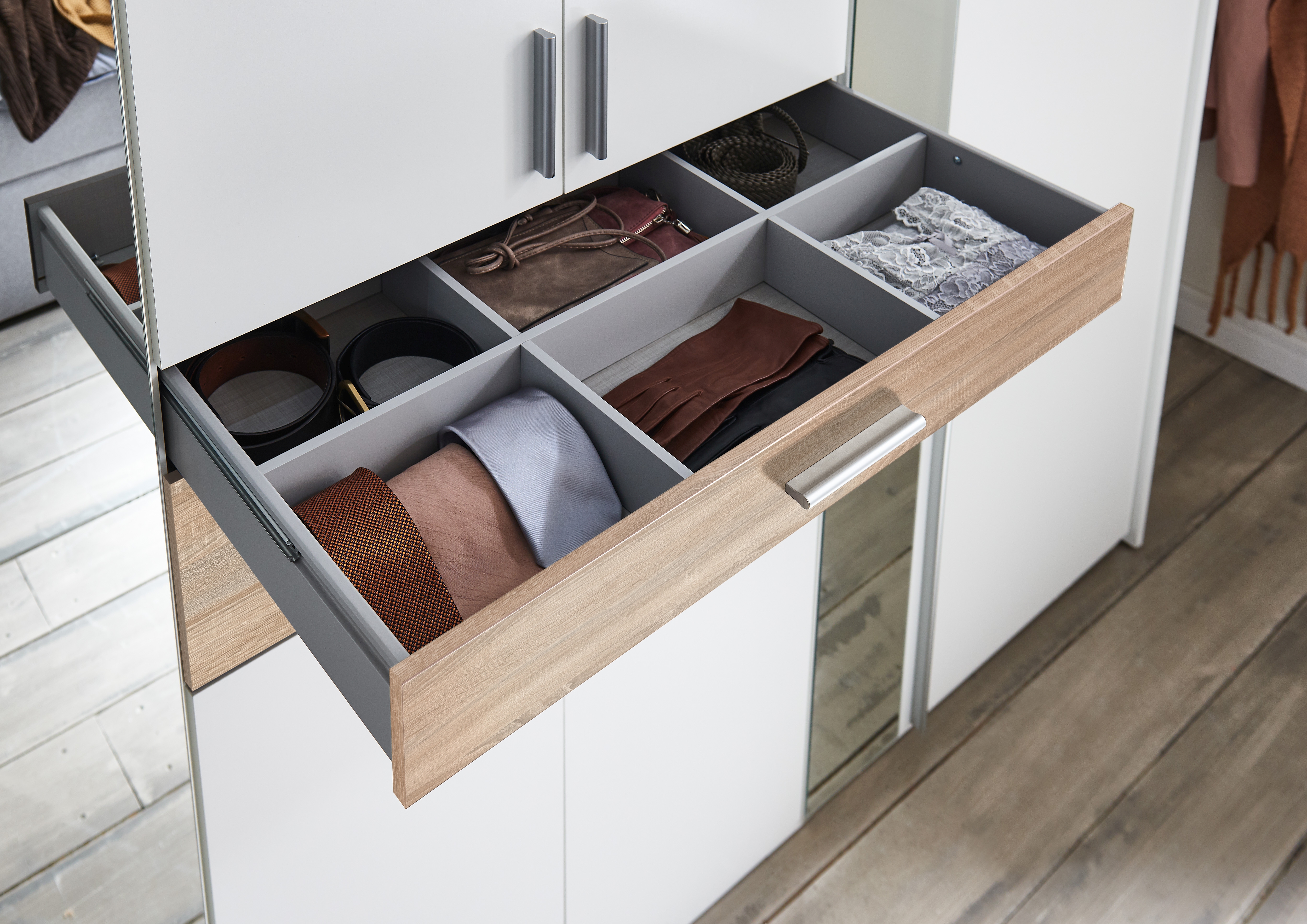 Front: Weiß mit Schubkästen in Eiche sägerau Holznachbildung / Spiegel