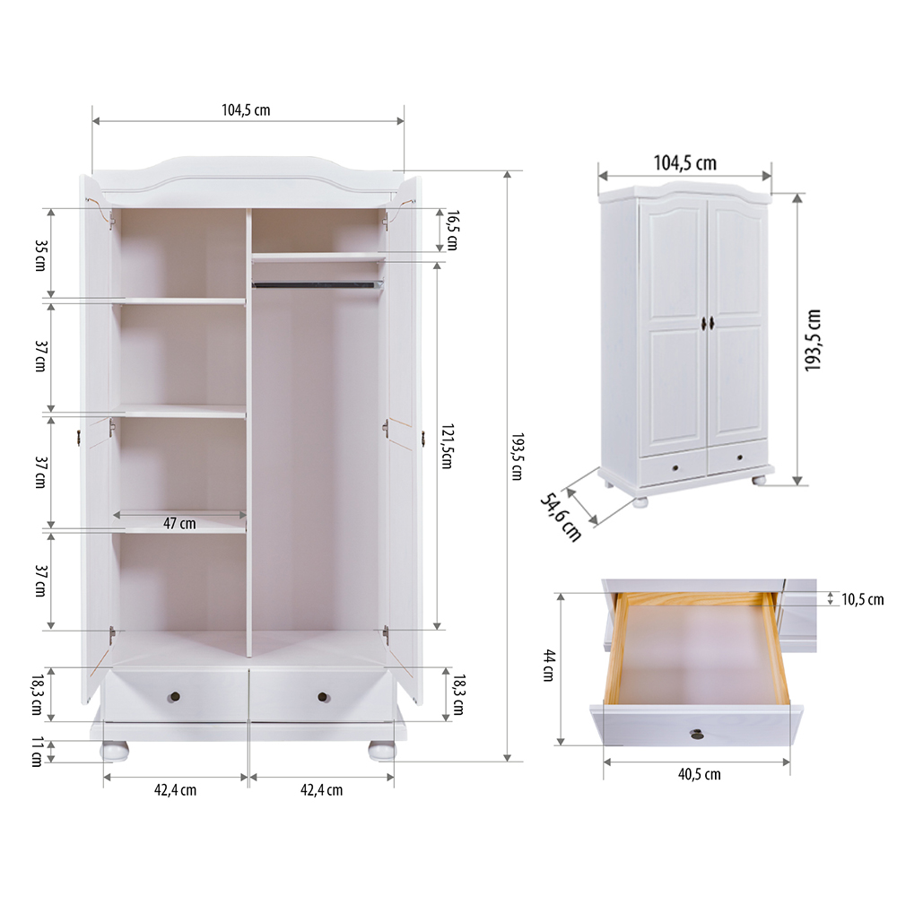 Die weiße, transparente Lackierung des 2-türigen Schranks lässt die natürlichen Massivholzmaserungen in der Oberfläche wunderbar zur Geltung kommen. Der Kleiderschrank verfügt über 5 Fachböden und eine Kleiderstange, die ausreichend Platz für Ihre Kleidungsstücke bieten.