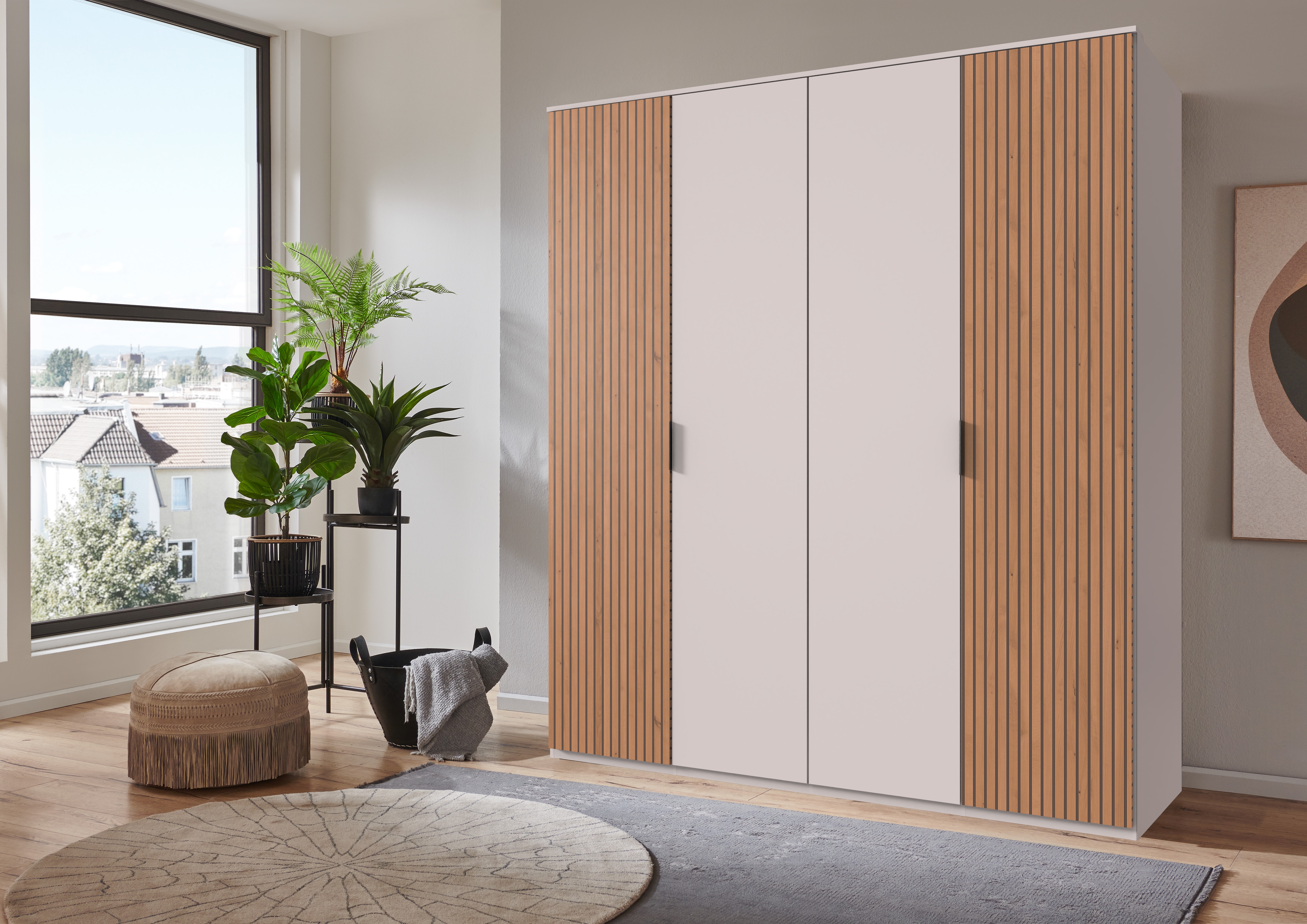 Front: Weiß mit Absetzungen in Akustiklamellen-Optik in Artisan Eiche Holznachbildung