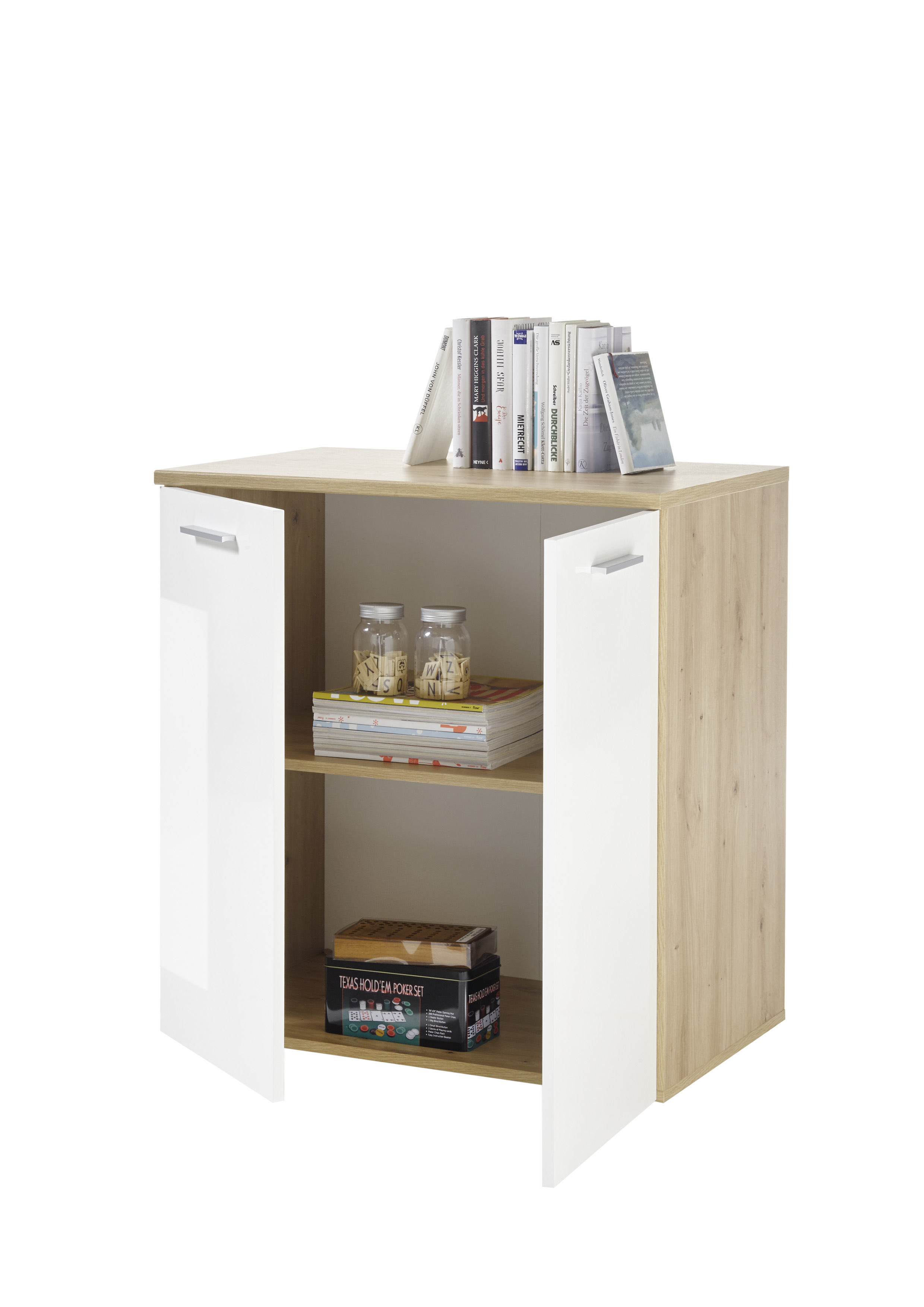 Hinter den zwei Türen verbirgt sich ein Einlegeboden, der vielseitig nutzbaren Stauraum für Alltagsgegenstände, Deko oder Textilien bietet.