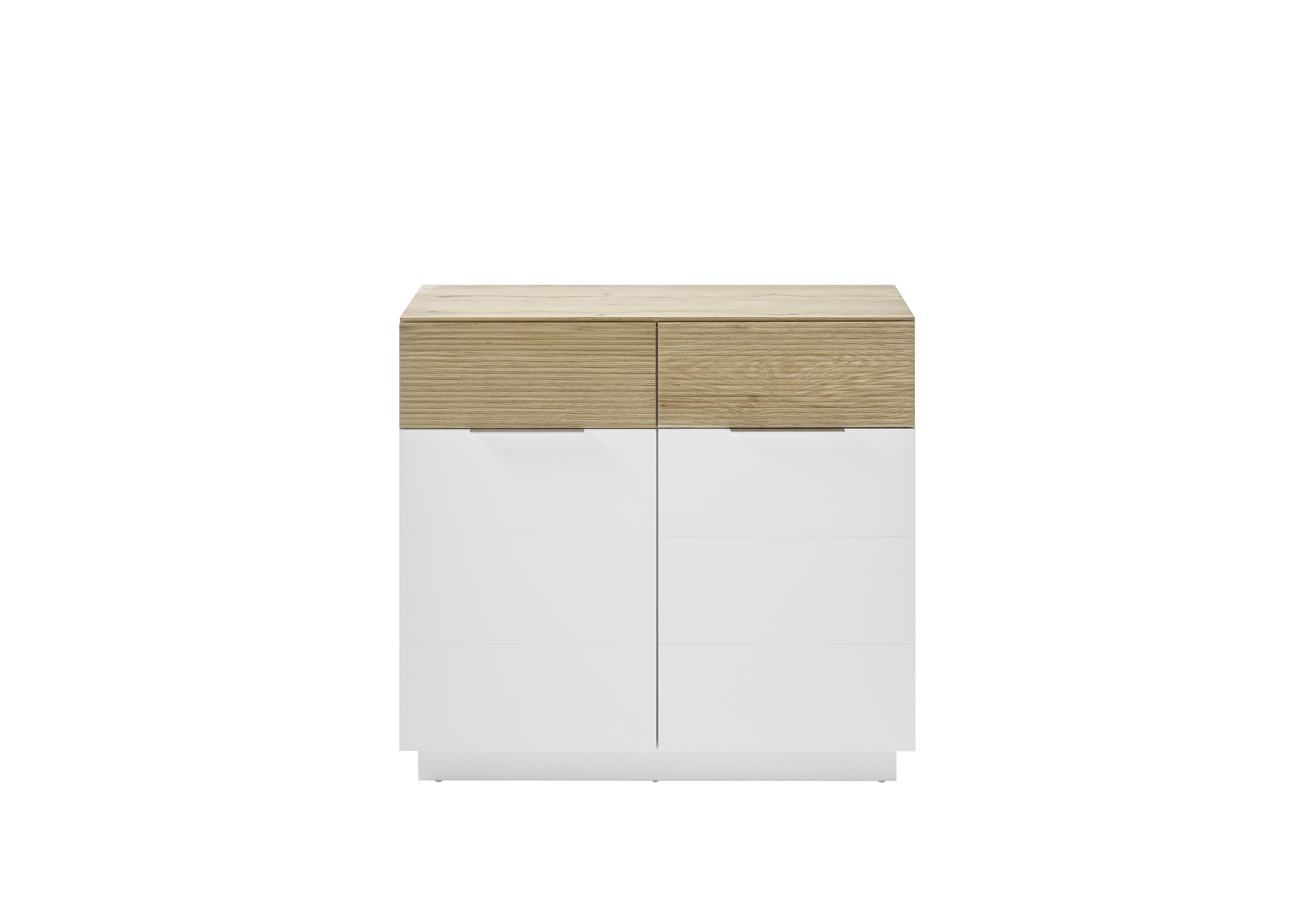 Front: Eiche massiv (Polen) gerillt kombiniert mit Weiß matt lackiert
