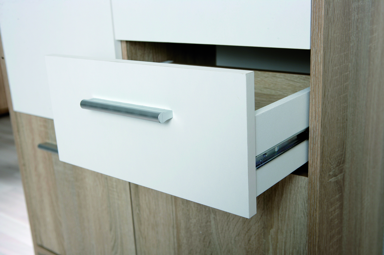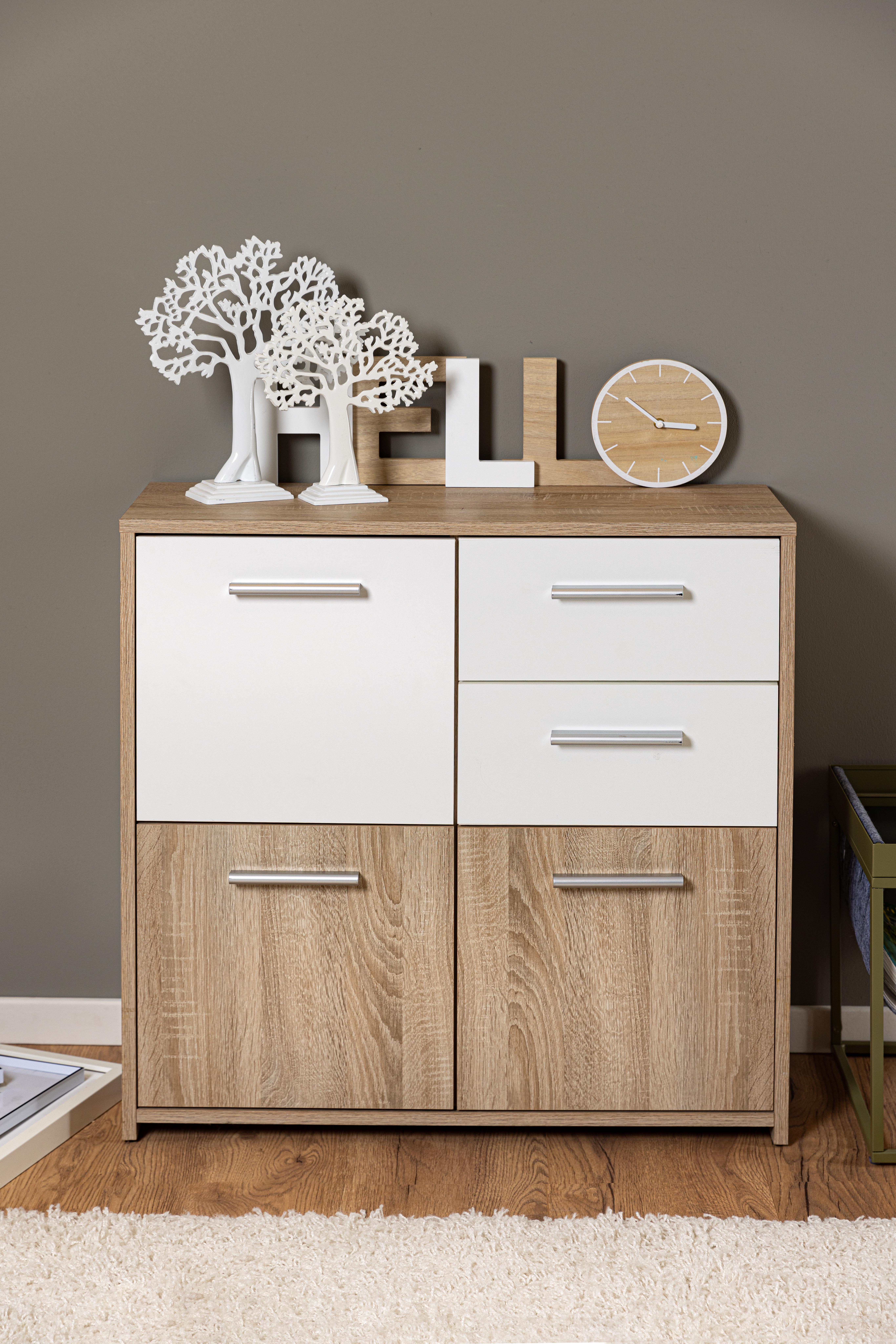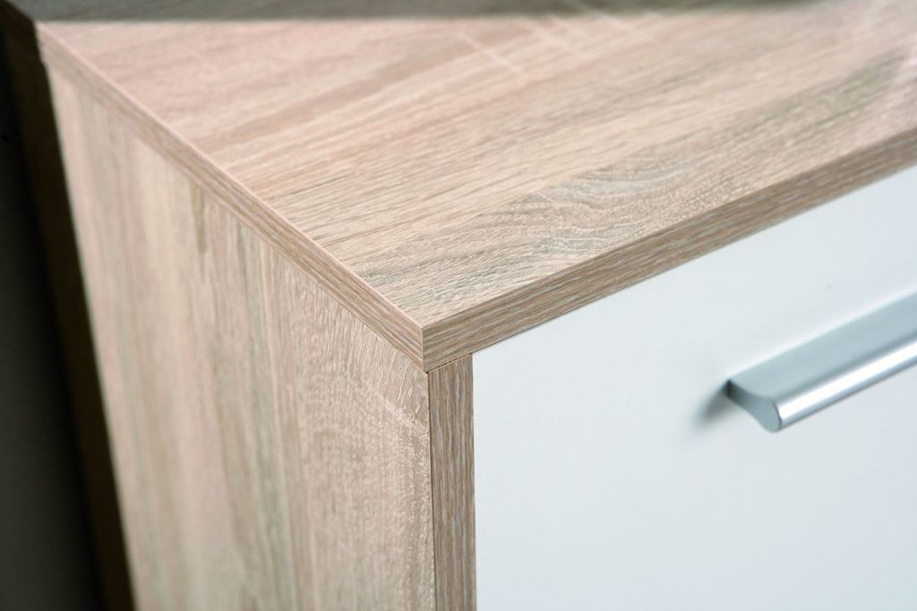 Die Oberfläche in den Trendfarben Sonoma-Eiche Nachbildung und Weiß verleiht dem Möbelstück eine moderne und zugleich warme Ausstrahlung.